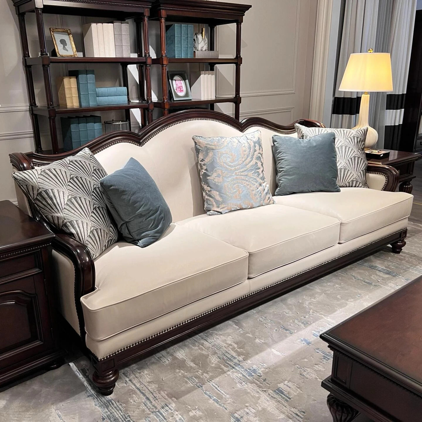 アメリカンスタイル本革ソファ|モダンなリビングに最適!シングル・ダブル・トリプルの組み合わせが可能なチェリーウッド製、ヴィラ向けの広々としたデザイン。クラシックな123コンビネーションで、洗練された空間を演出!