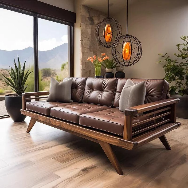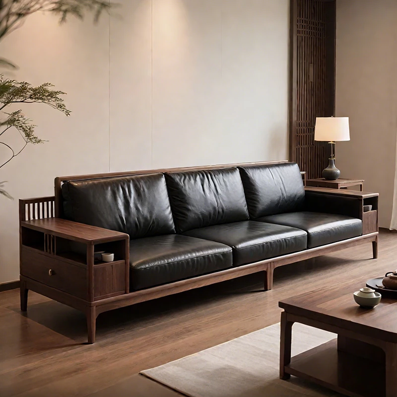 イタリアンミニマリズムの無垢材ソファセット|本革使用・モダンでシンプルな新中式デザイン|高級ブラックウォールナット木材採用で、洗練されたリビング空間を演出!