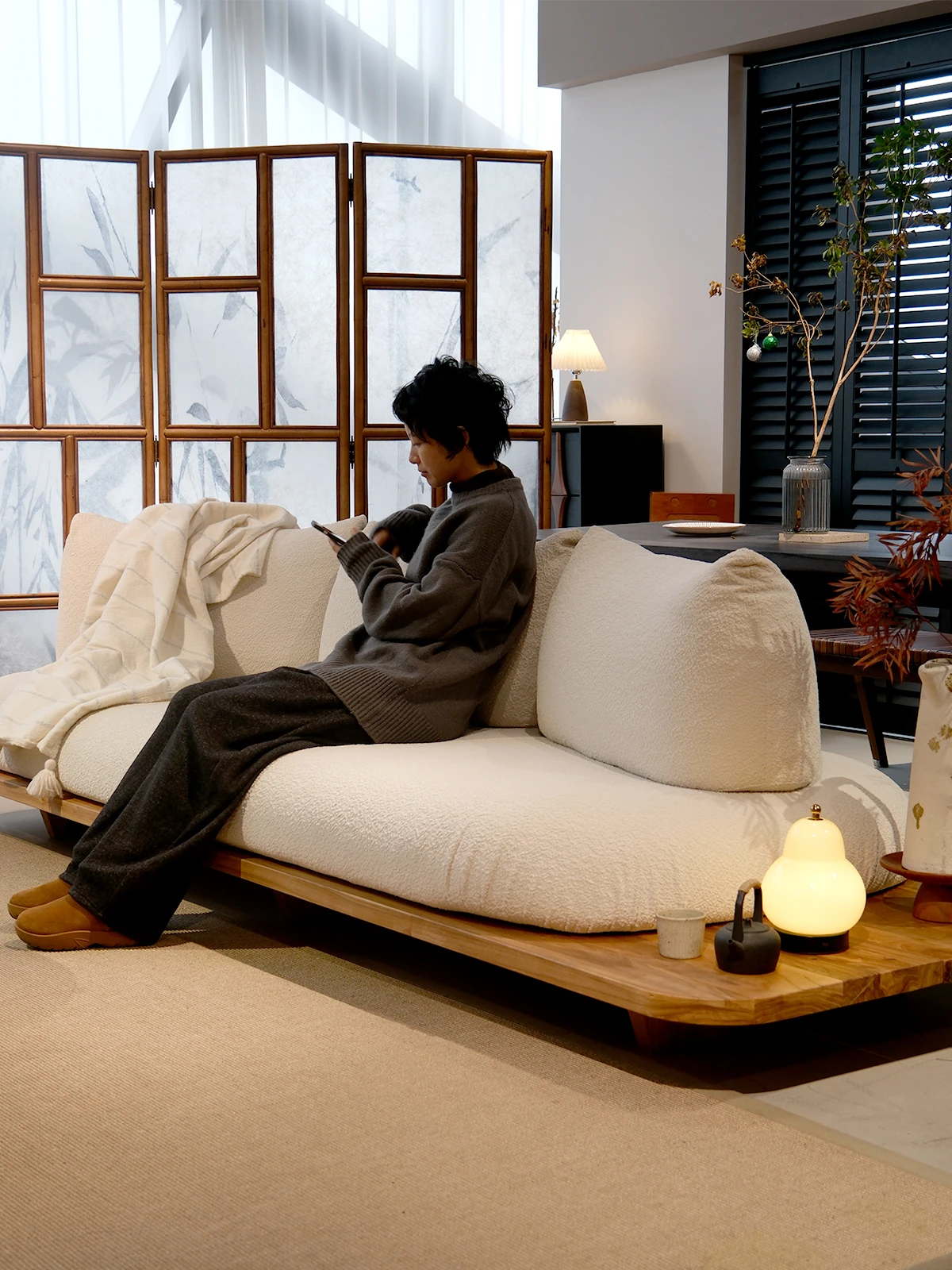 座り心地抜群!実木製の大板ソファ、古風な粒状フリース生地使用。和風の畳スタイルで、リラックスできる原木風リビング空間を演出。あなたの家にぴったりのスタイリッシュなアイテムです!