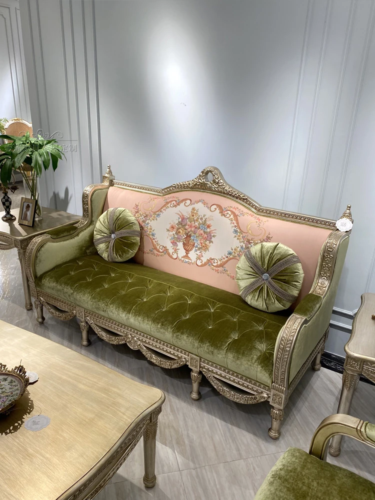 フレンチロマンティックな豪華ピンクグリーンの無垢材生地ソファ、欧風彫刻デザインのレトロヴィラ用高級リビングルームセット。洗練されたスタイルで特別な空間を演出!