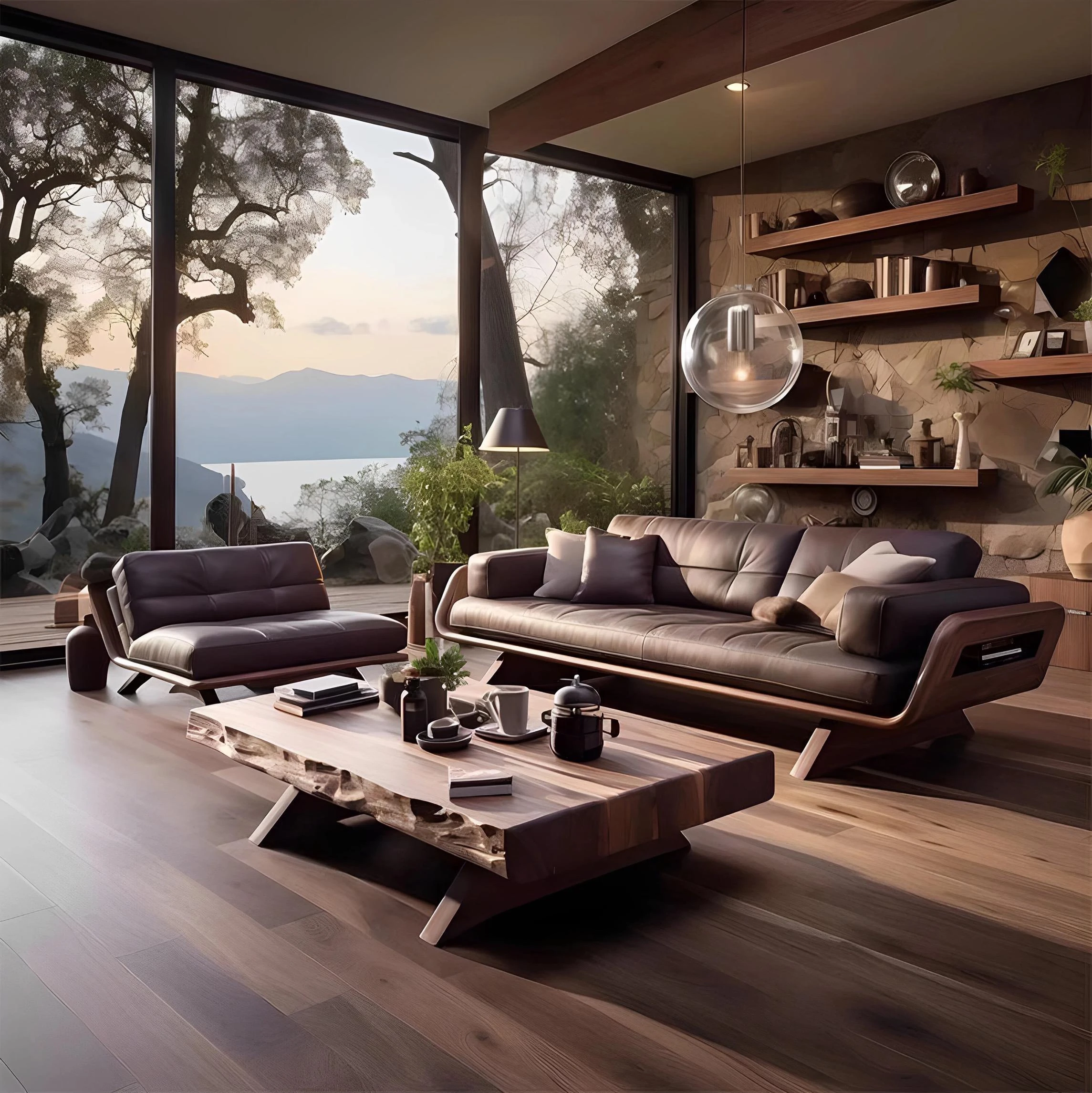 2025年新款!新中式スタイルの本革ダブル&トリプルソファ - 北米産ブラックウォールナット使用の高級実木リビングソファ。快適さと洗練されたデザインで、あなたのリビングを格上げ!