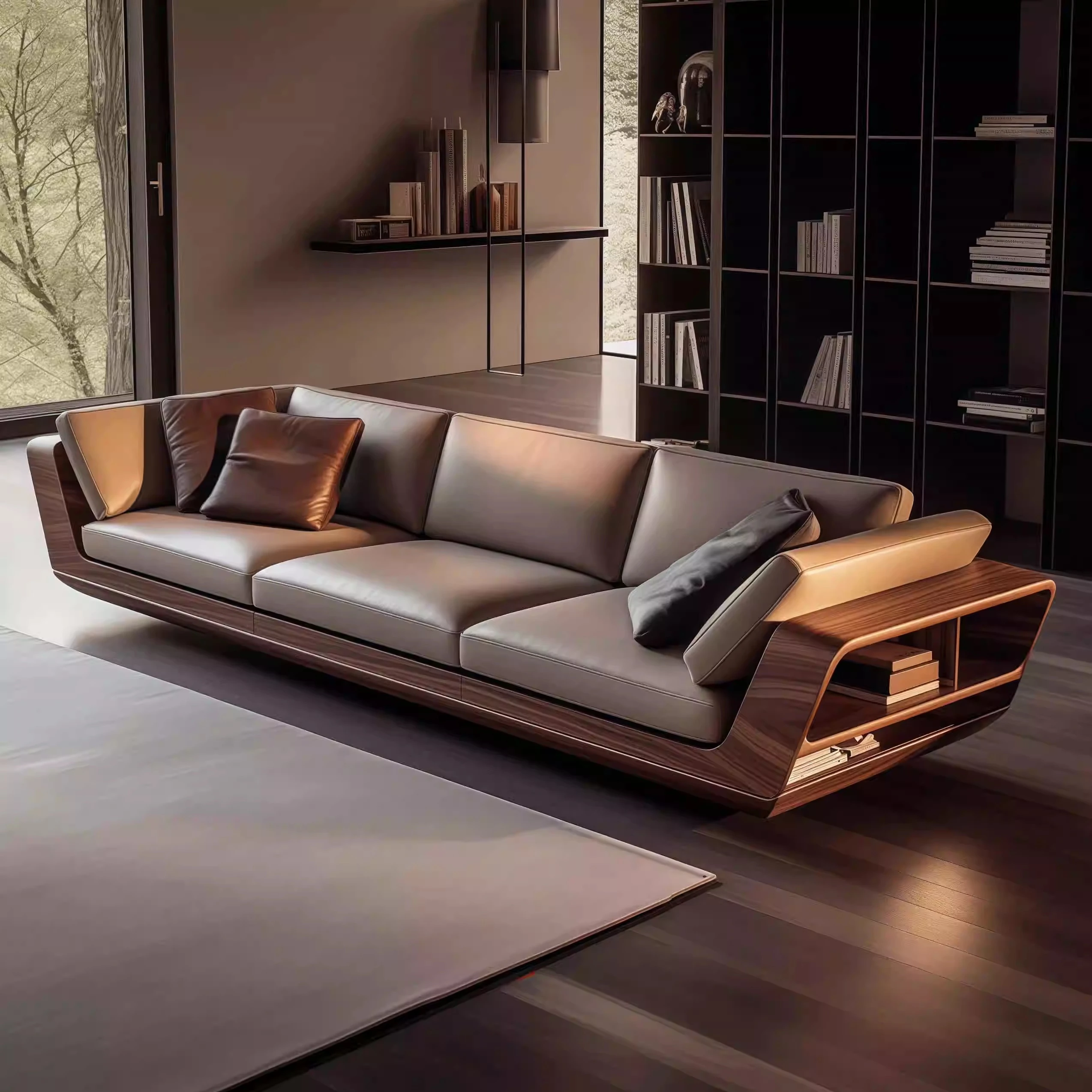 新中式スタイルの無垢材ソファ|リビングにぴったりな直線的な三人掛け|軽やかなラグジュアリー感|爽やかな布地と高級レザー|現代的でシンプルなウォールナット仕上げ