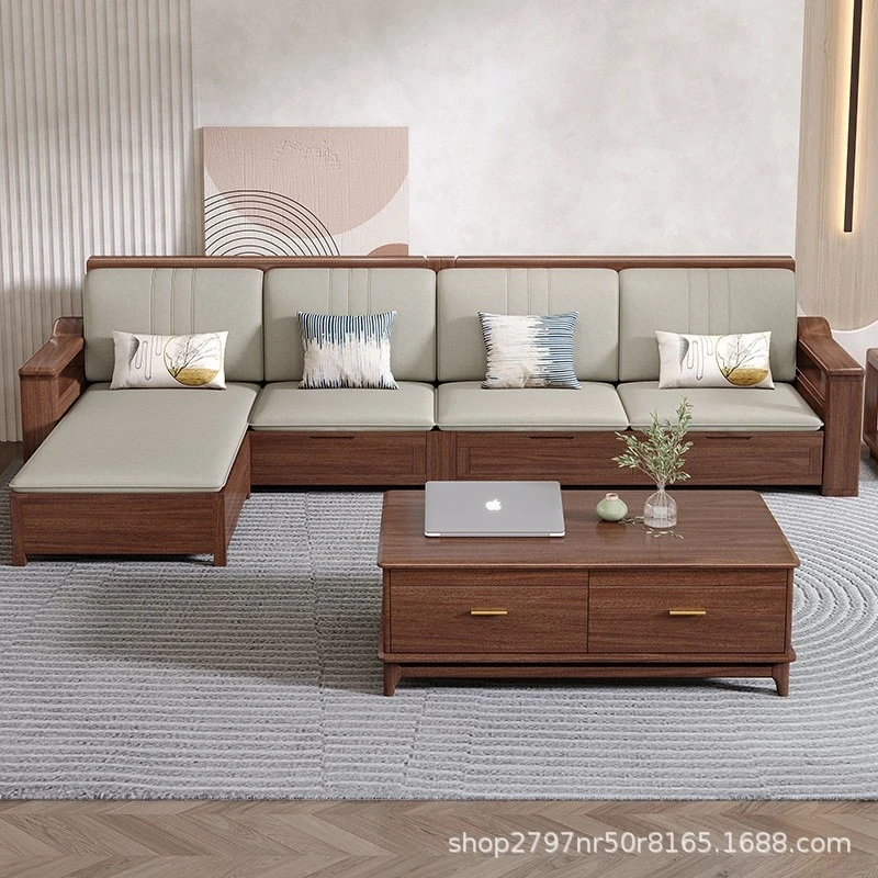現代新中式ウォールナット無垢材コーナーソファセット - ラグジュアリーでシンプルなデザイン、大小さまざまなリビングに最適な中華家具。快適さとスタイルを両立!