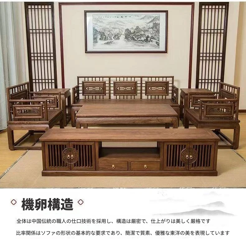 2025年新作!高級感溢れる中式デザインの無垢材ソファ - ブラックウォールナットの贅沢な布製直置きソファ、リビングルームに最適なスタイリッシュな家具!
