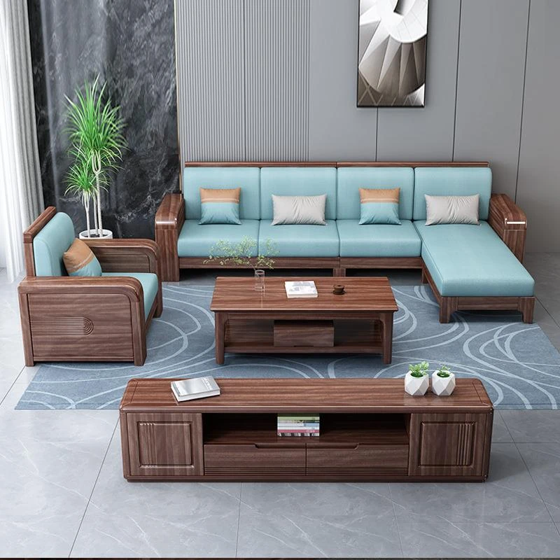 ウォールナット無垢材ソファセット!モダンな新中式デザインのコーナー生地ソファ、狭いお部屋にもぴったりなスタイリッシュなリビング家具。快適なひとときをお届けします!