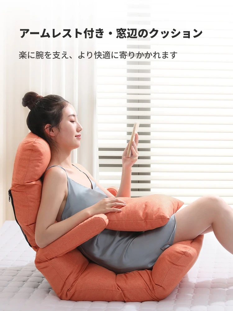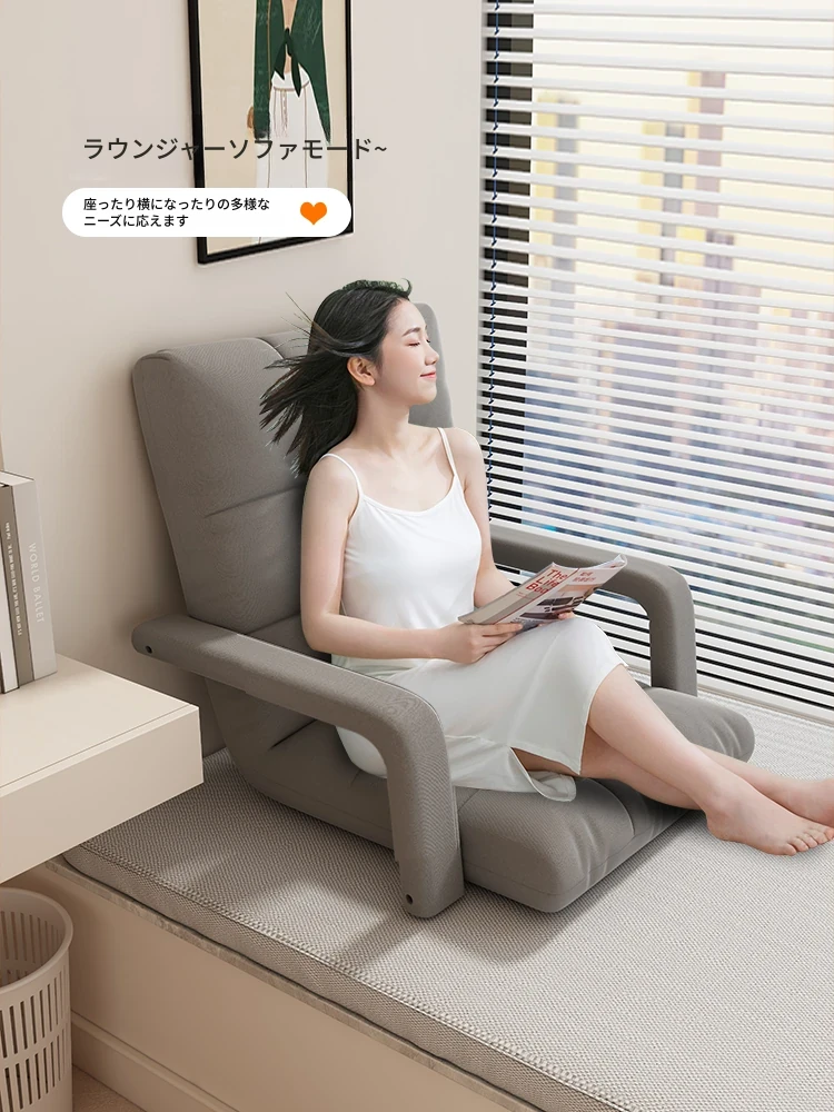 楽なリクライニングソファ、畳スタイルで読書や昼寝に最適!一人用のコンパクト折りたたみチェア、窓際でのリラックスタイムにぴったりのクッション背もたれ付き。快適なひとときをお届けします!