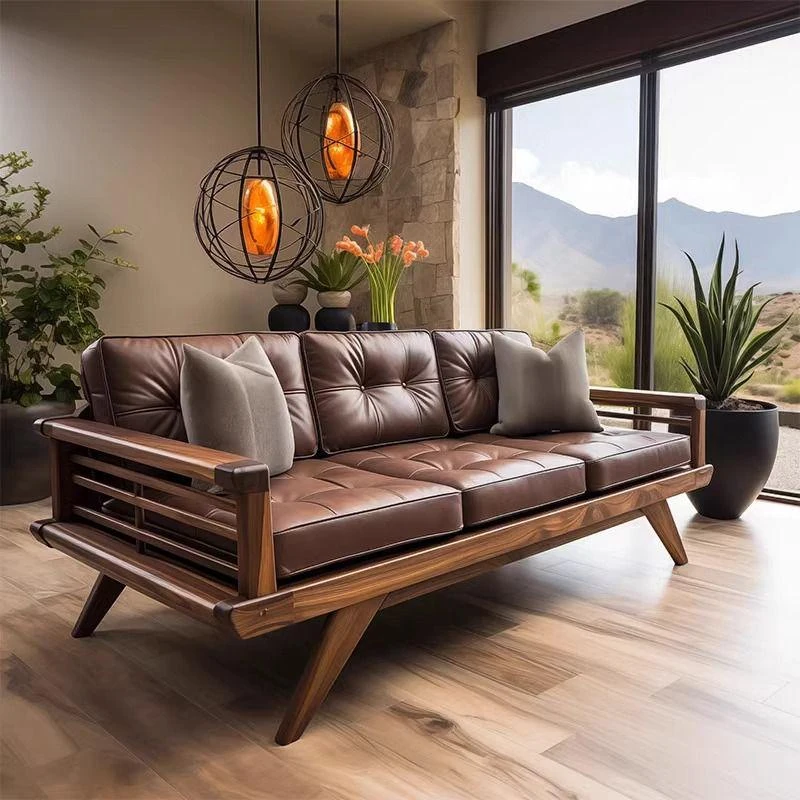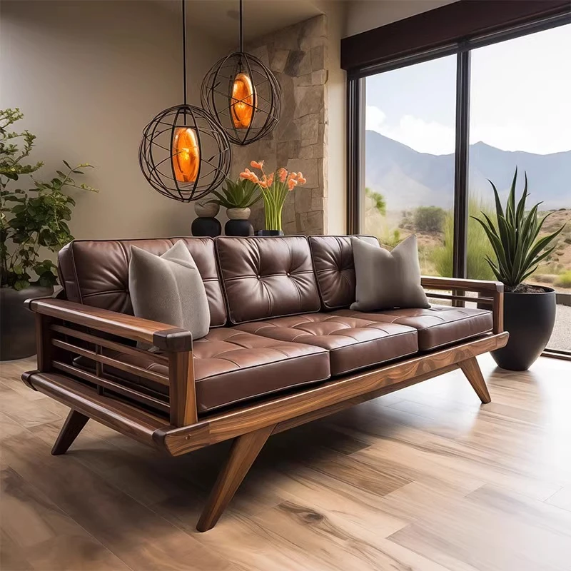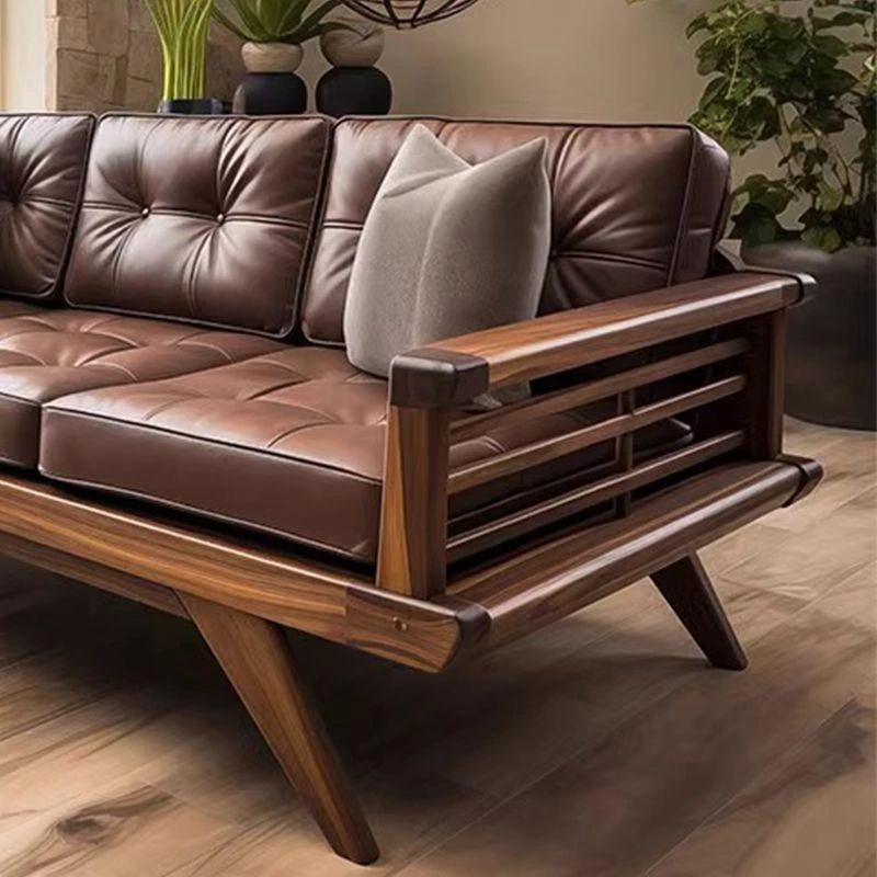 2025 New Arrivals: Modern Minimalist Solid Wood Sofa in New Chinese Style - Perfect for Small Spaces, Featuring Elegant Leather Cushions and Crafted from North American Black Walnut