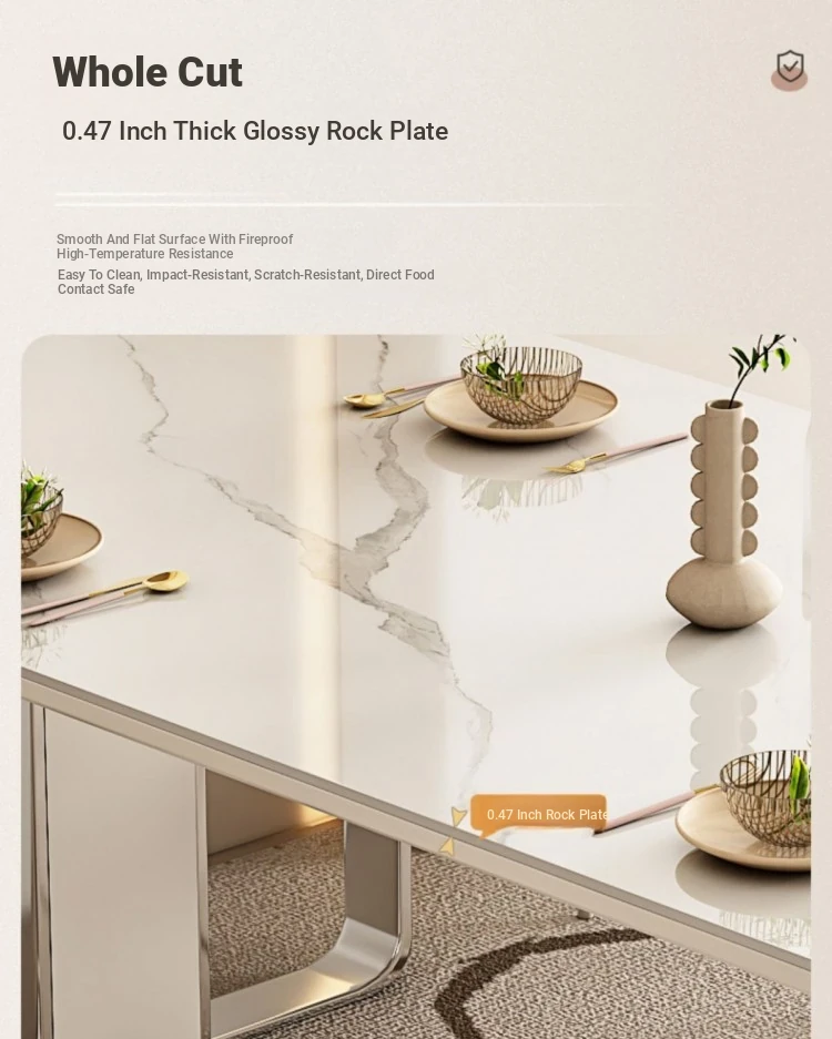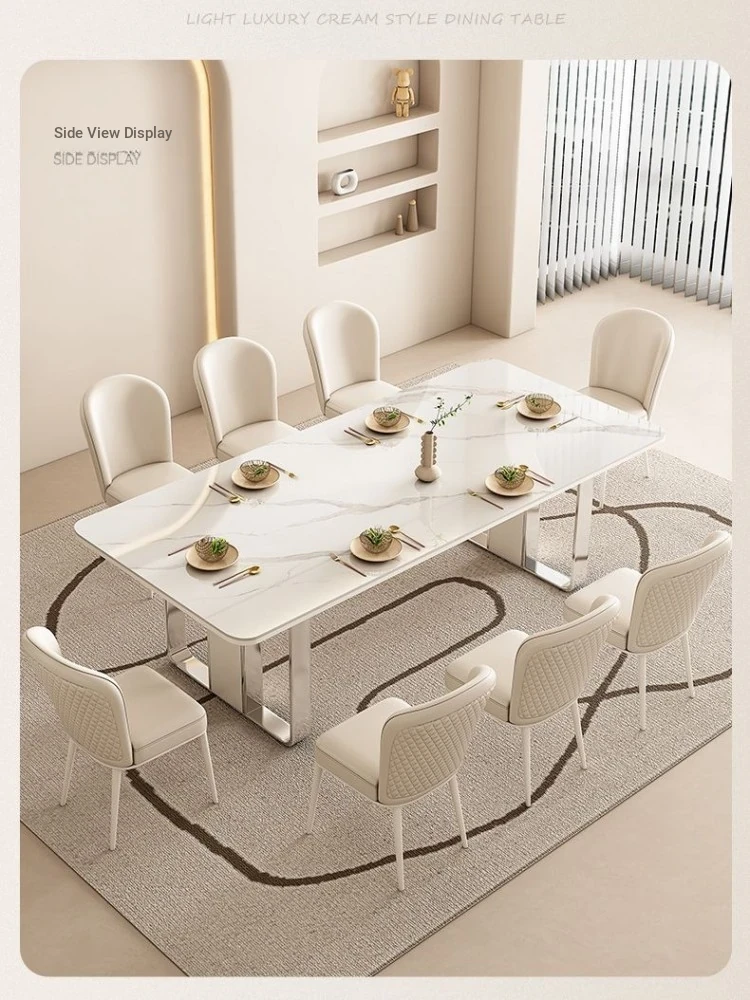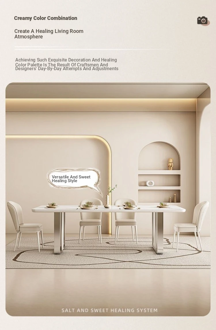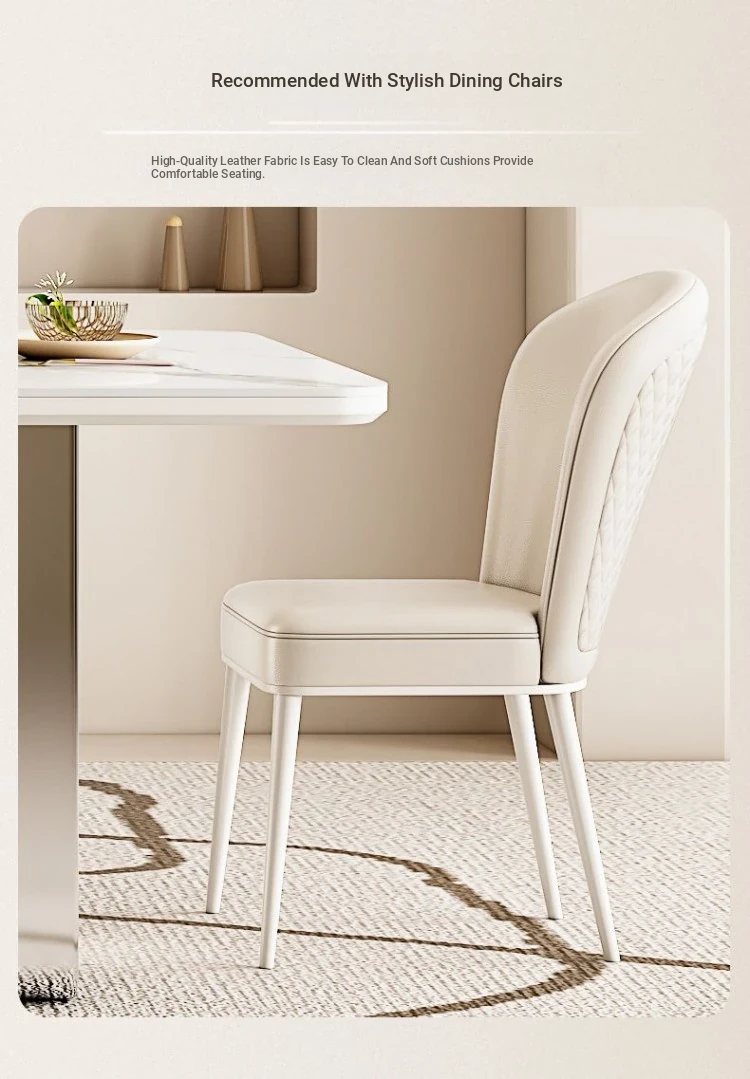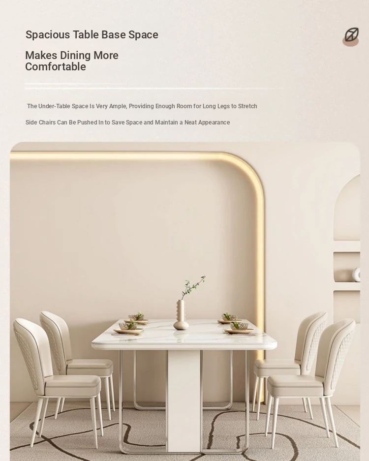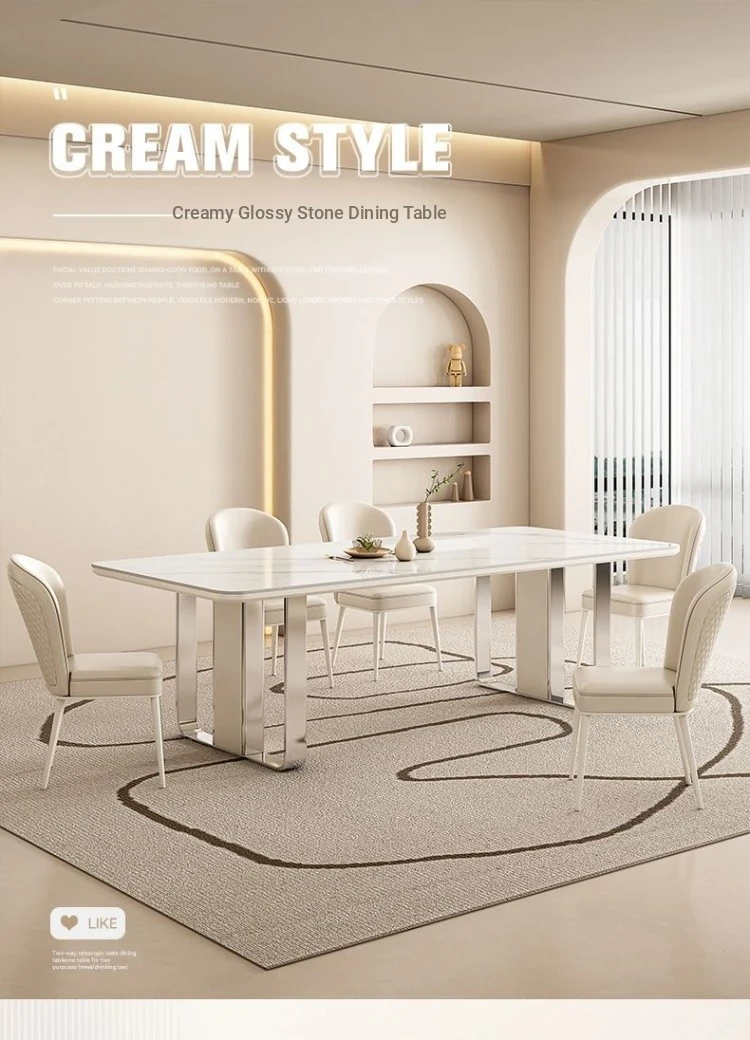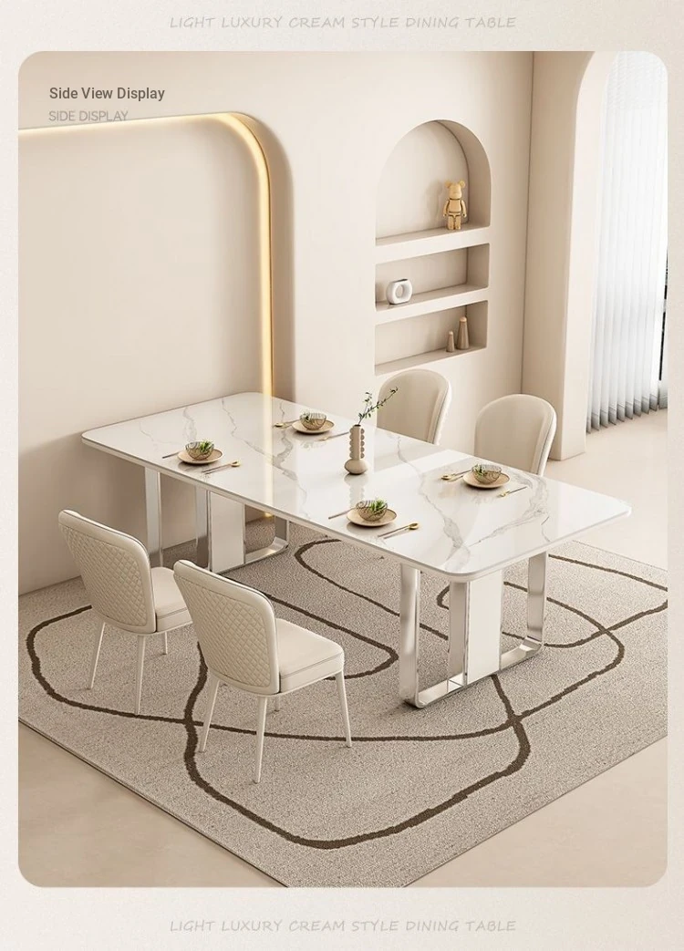 Elegant Creamy Glossy Marble Dining Table Set - Modern Minimalist Design for Small Spaces, Perfect for Luxe Home Décor, Featuring Stylish Rectangular Table and Chairs.