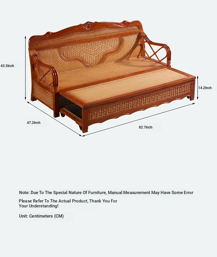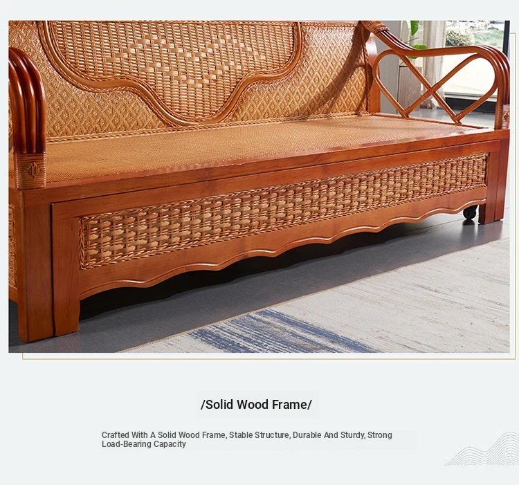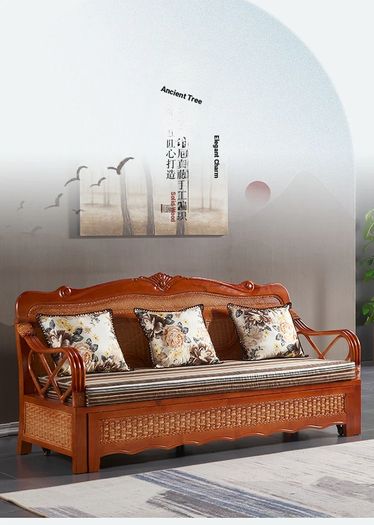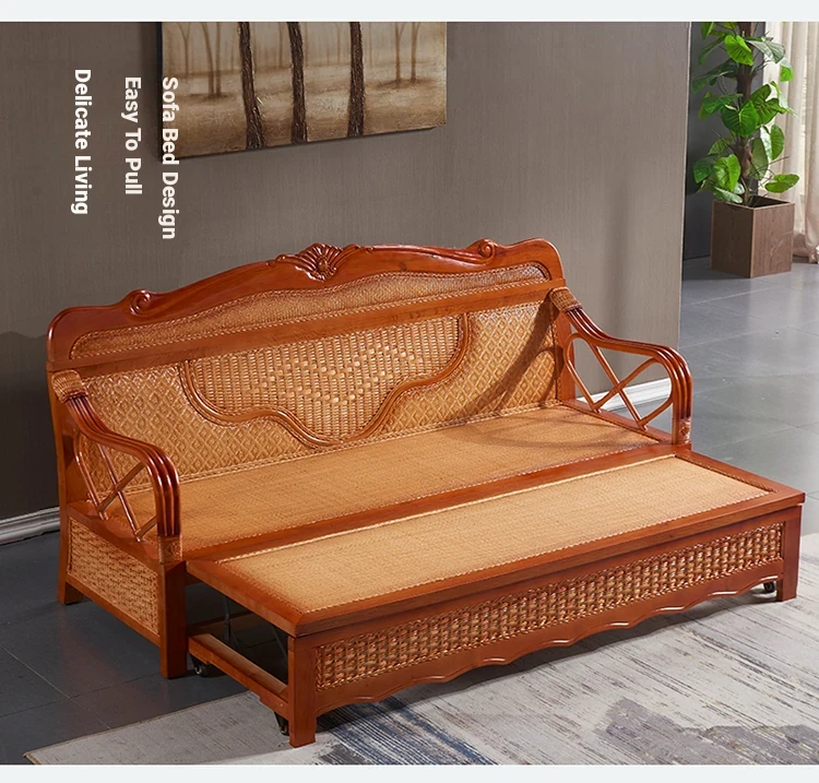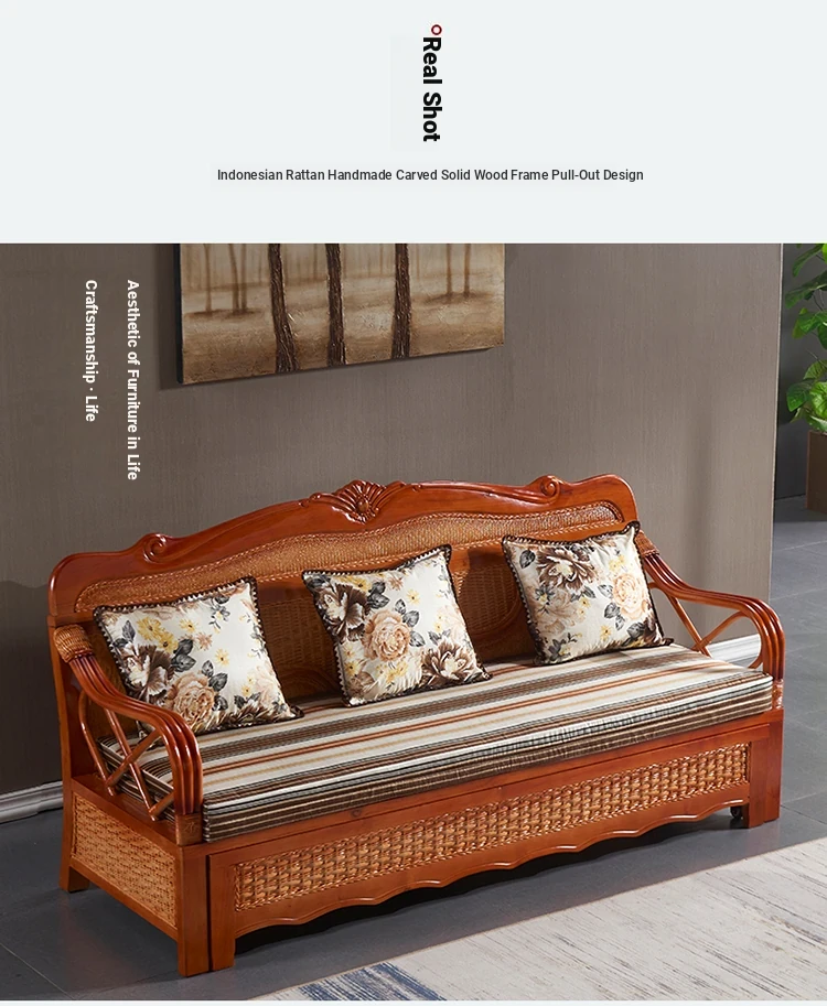 Natural Rattan Sofa Bed – Versatile Solid Wood and Rattan Furniture, Foldable 3-Seater Sofa for Comfort and Style, Perfect for Any Living Space!