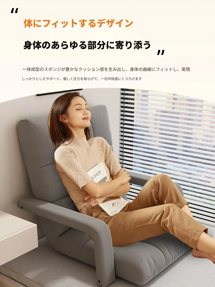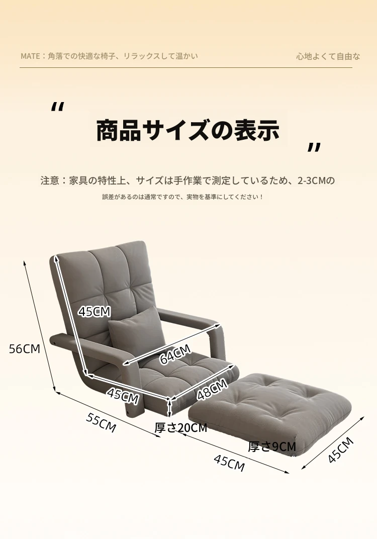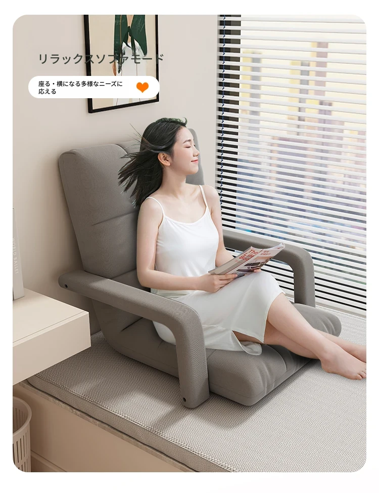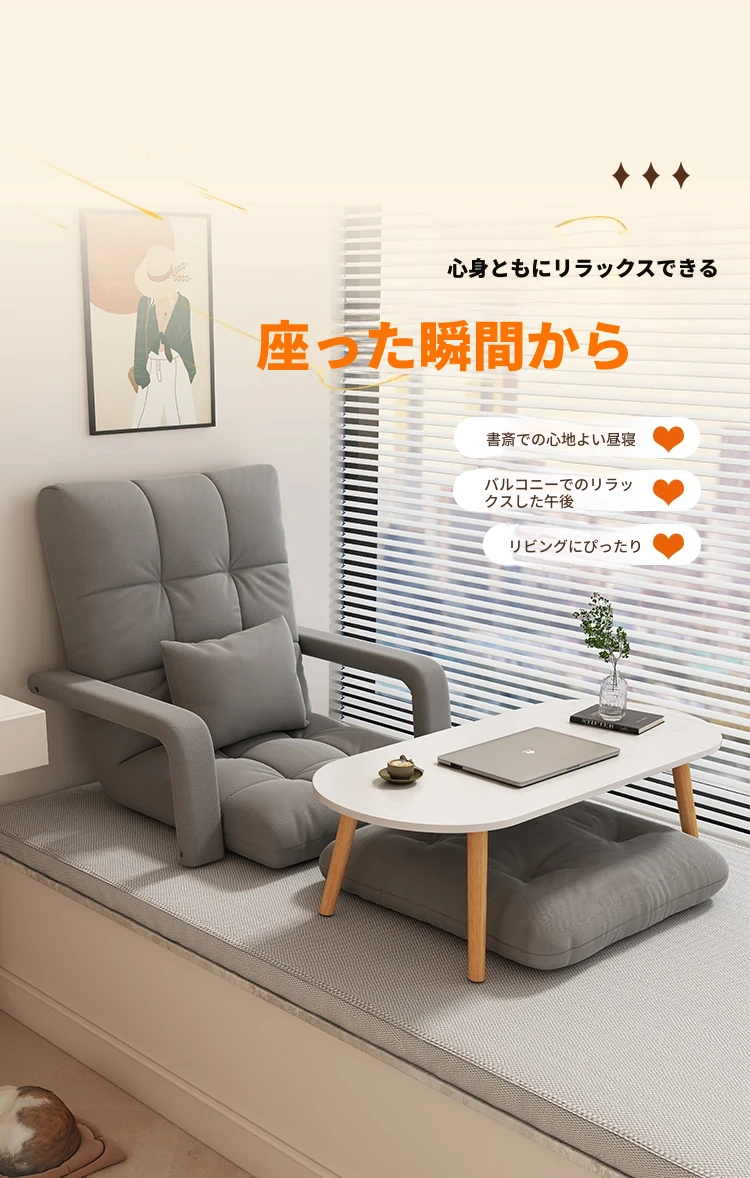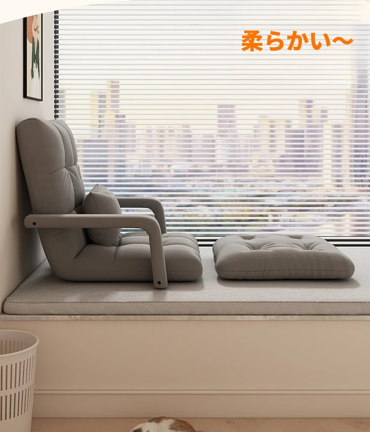 リラックスできる背もたれ付きのソファチェア - フットレストと肘掛け付きで、床にぴったりフィット!寝そべって快適にくつろげる、畳や窓辺にも最適な一人用ソファ。あなたのリラックスタイムを贅沢に演出します!