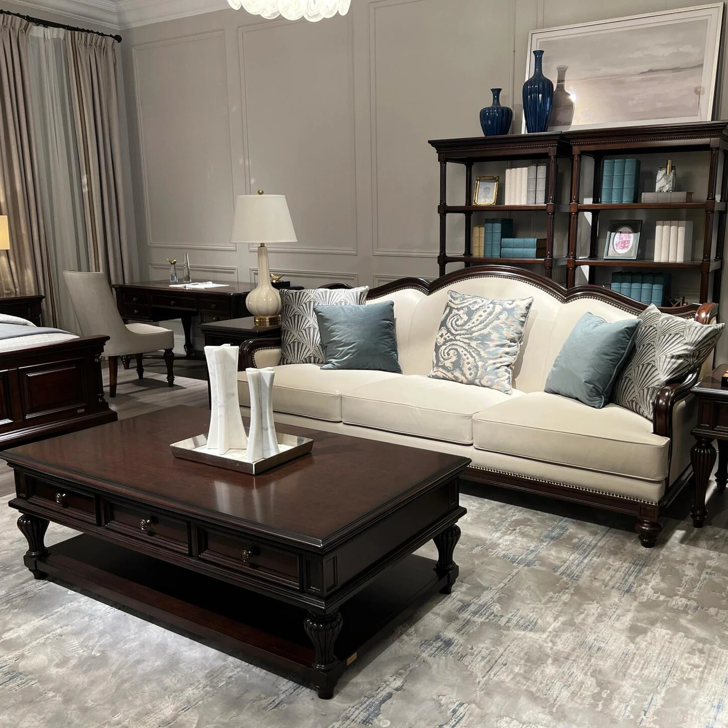 アメリカンカントリースタイルの無垢材ソファ!フレンチヴィンテージデザインのチャールストンソファとコーヒーテーブルのコンビネーションセット。おしゃれなリビングにぴったりの高品質家具で、心地よいくつろぎの空間を演出します!