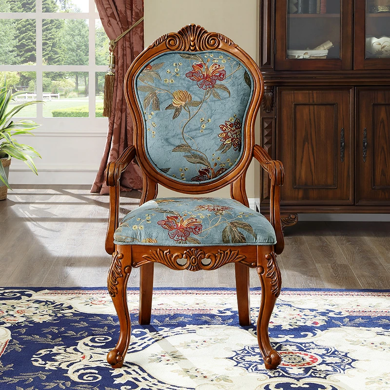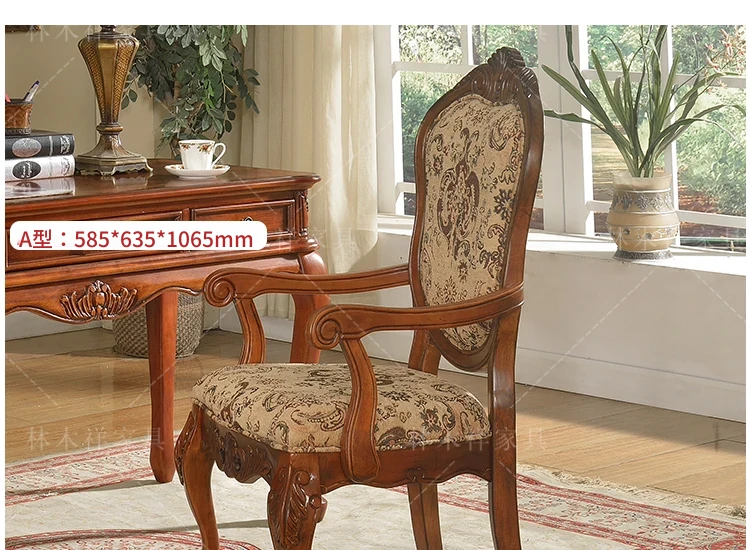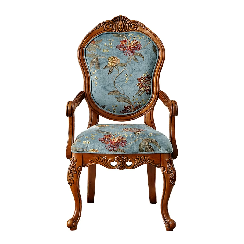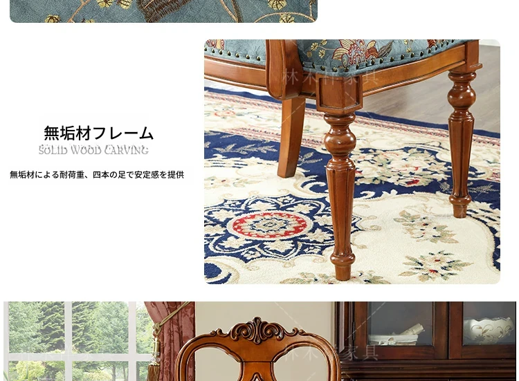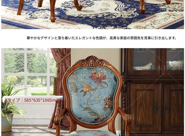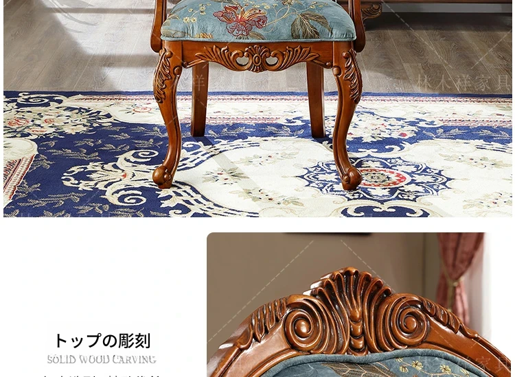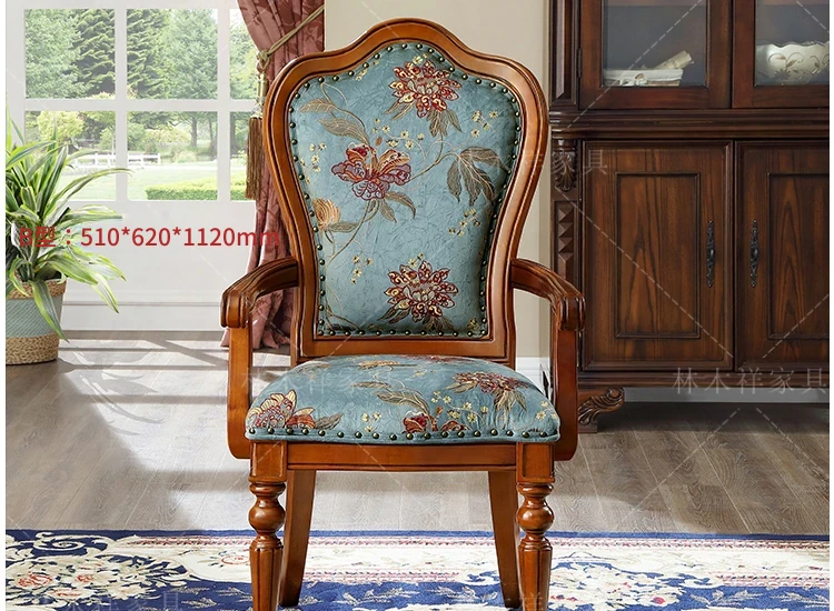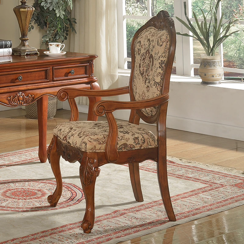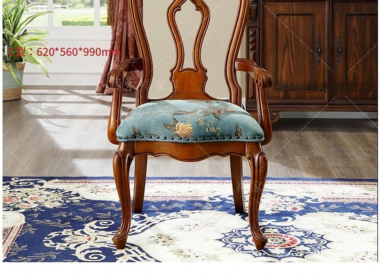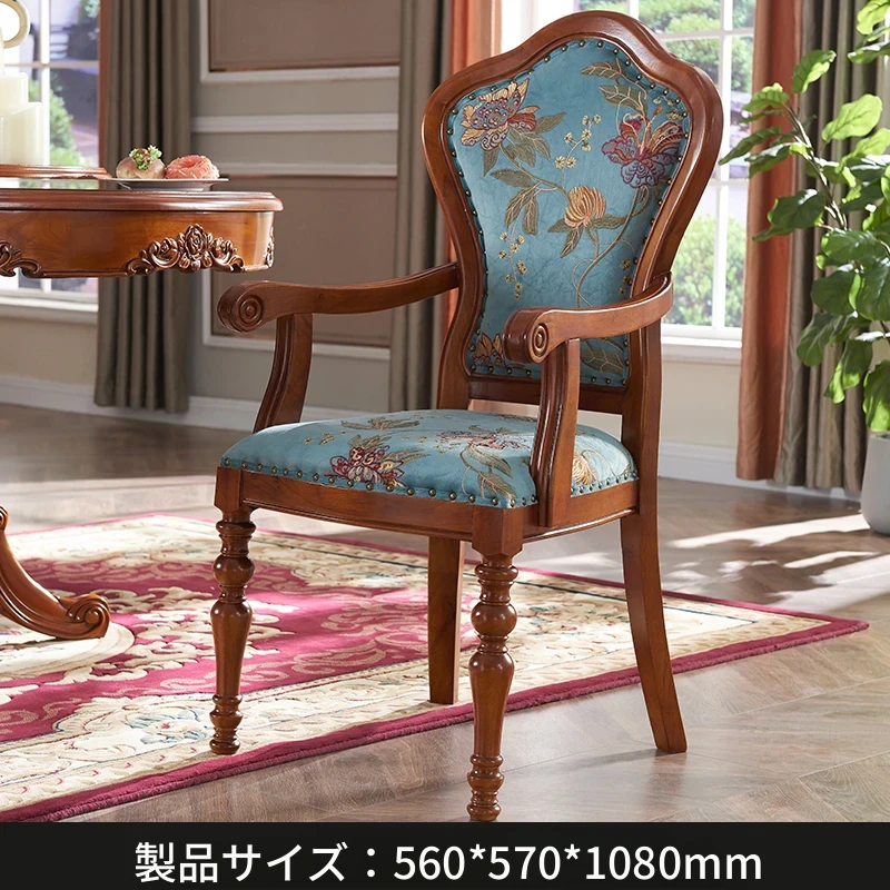 アメリカンスタイルの全木製ダイニングチェア|布製クッション付き|リラックスできる背もたれ|欧風デザインのパソコンチェア|書斎やリビングにぴったりなアームチェア!快適さとスタイルを両立させた一品です。
