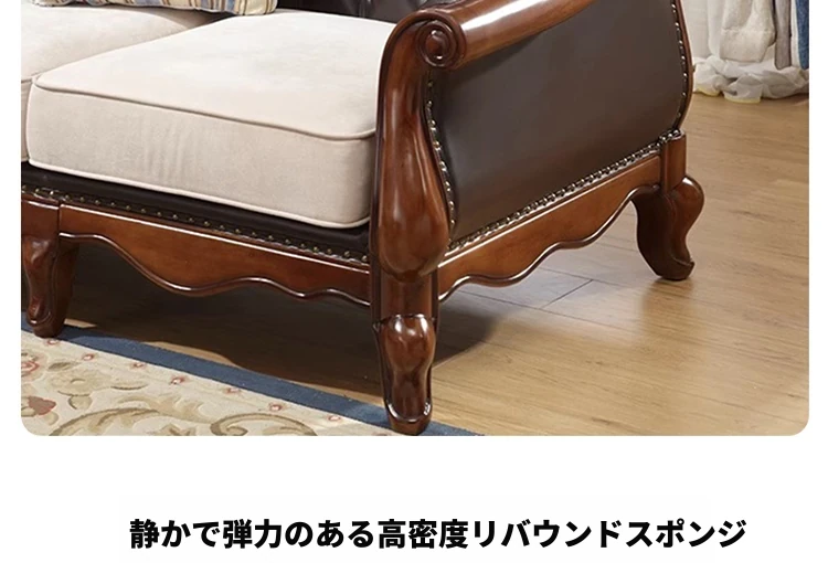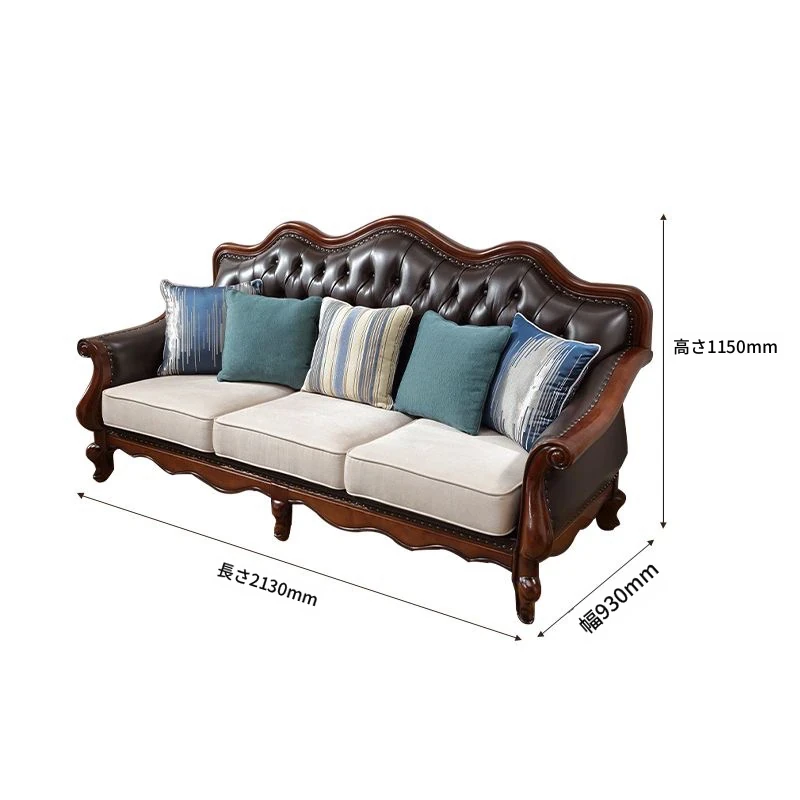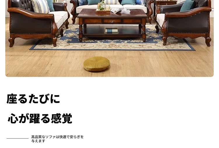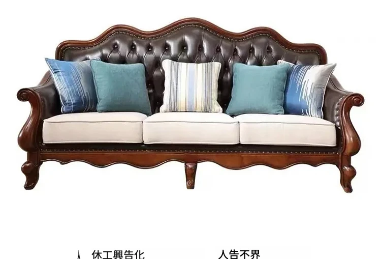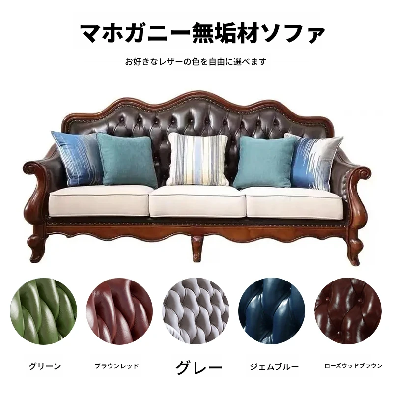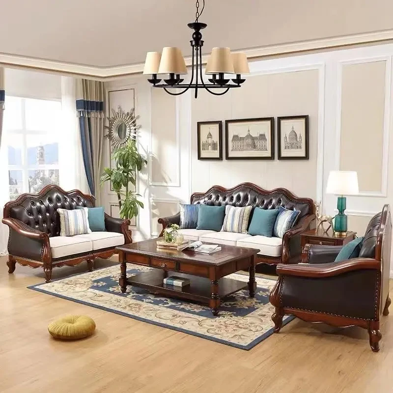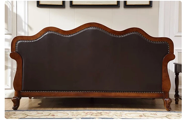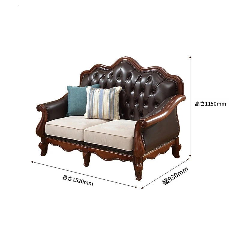 アメリカンスタイルのフルウッド本革ソファセット - ヨーロピアンデザインのダブル3人掛け、小型住宅やヴィラに最適!レトロでモダンなシンプルさが魅力。おしゃれなリビングを演出します!