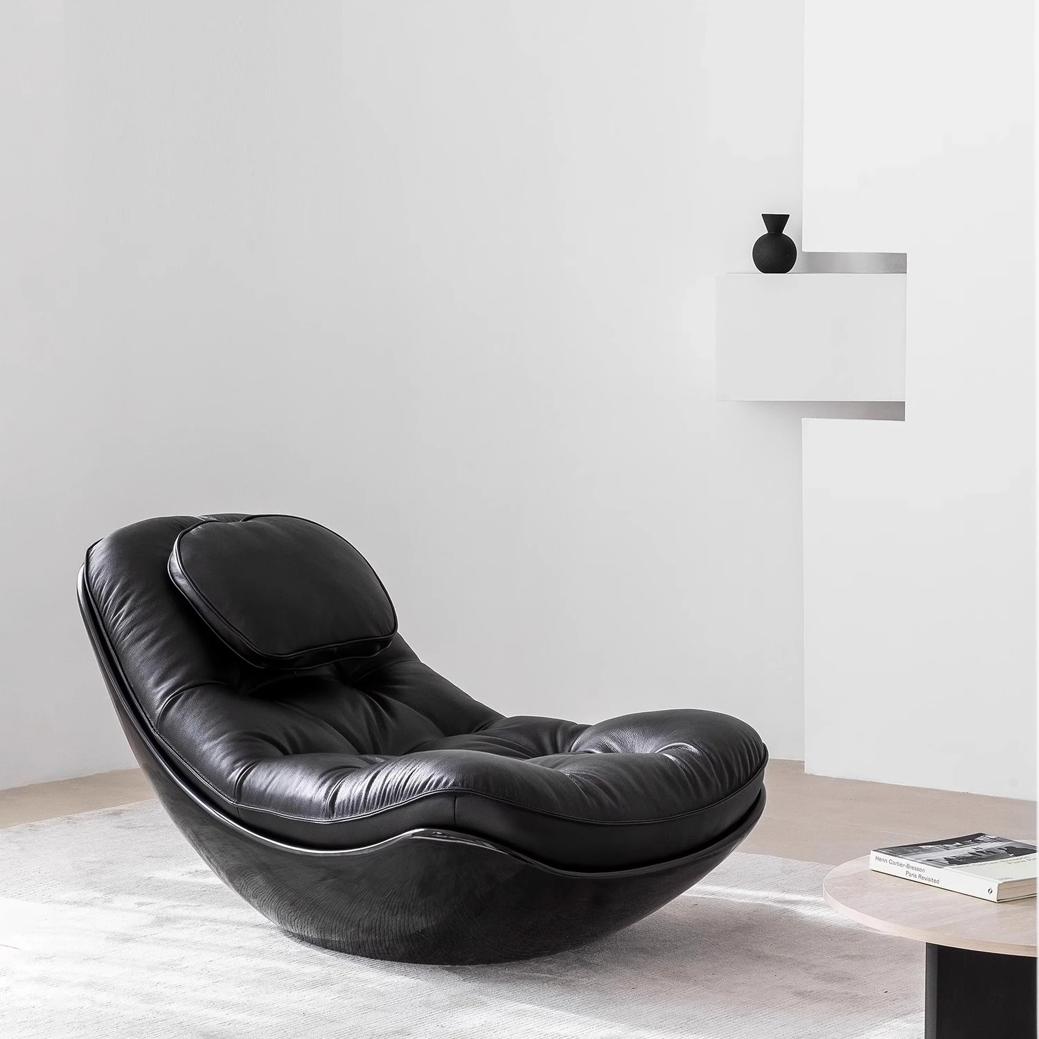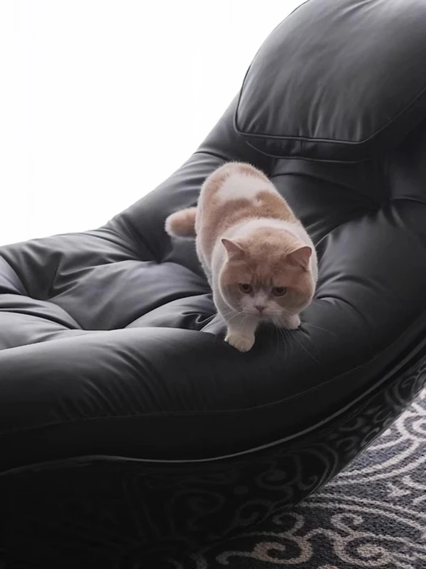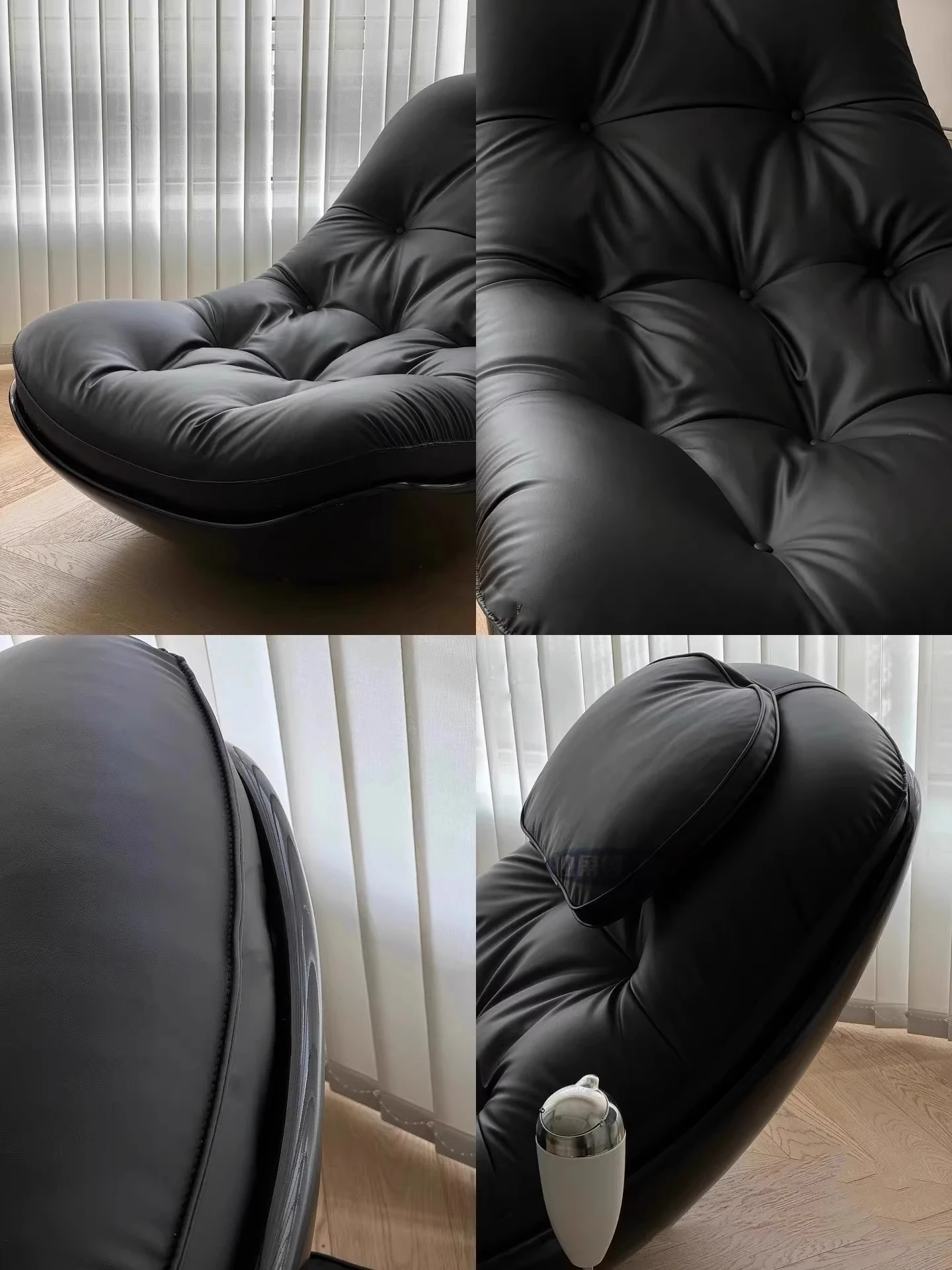 ブラックレザーのグラスファイバー製エッグシェル型リラックスドッグベッド、くつろぎのソファチェア、シングルチェア、侘寂風のデザインで、あなたと愛犬の特別な時間を演出します。