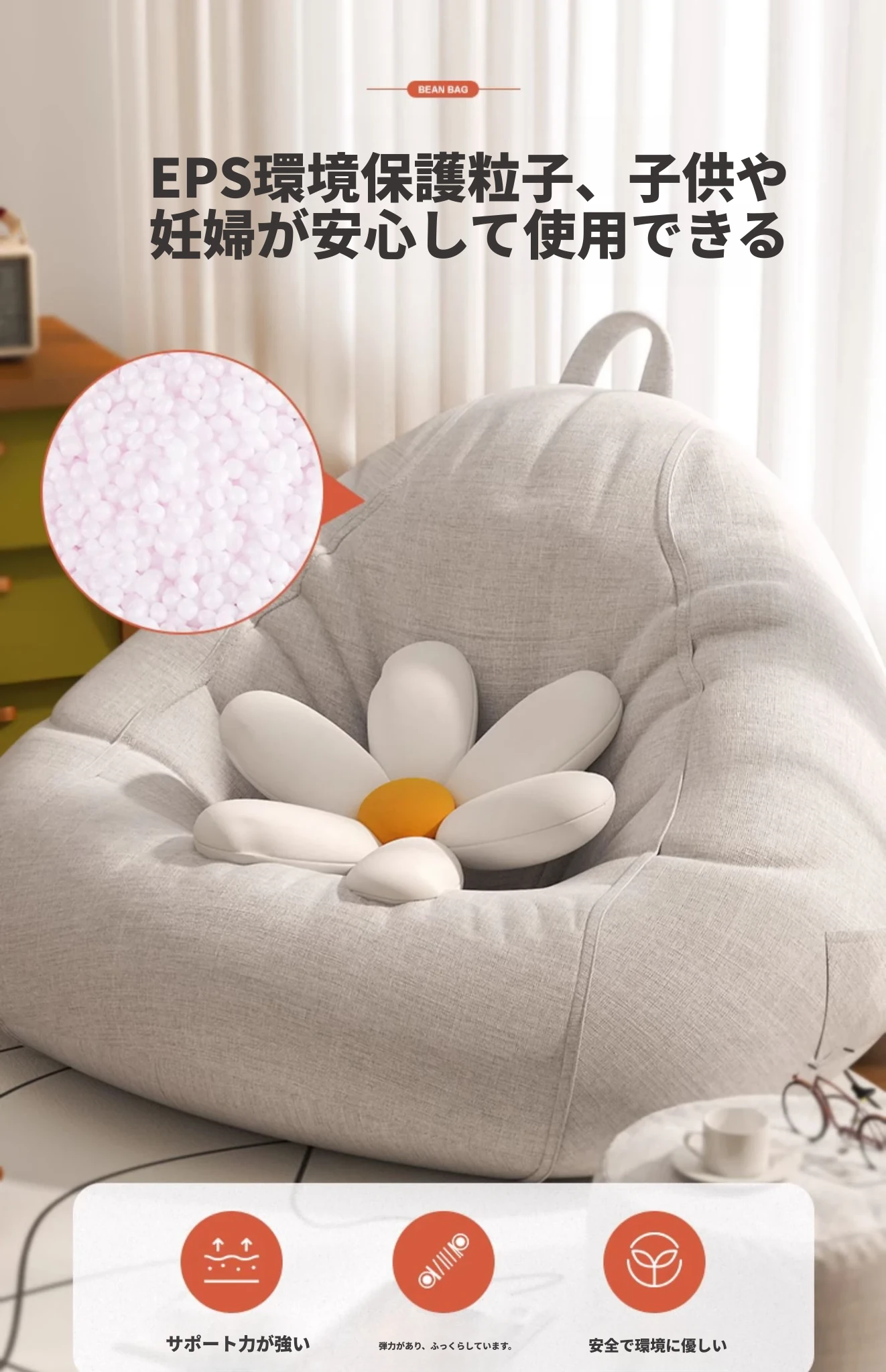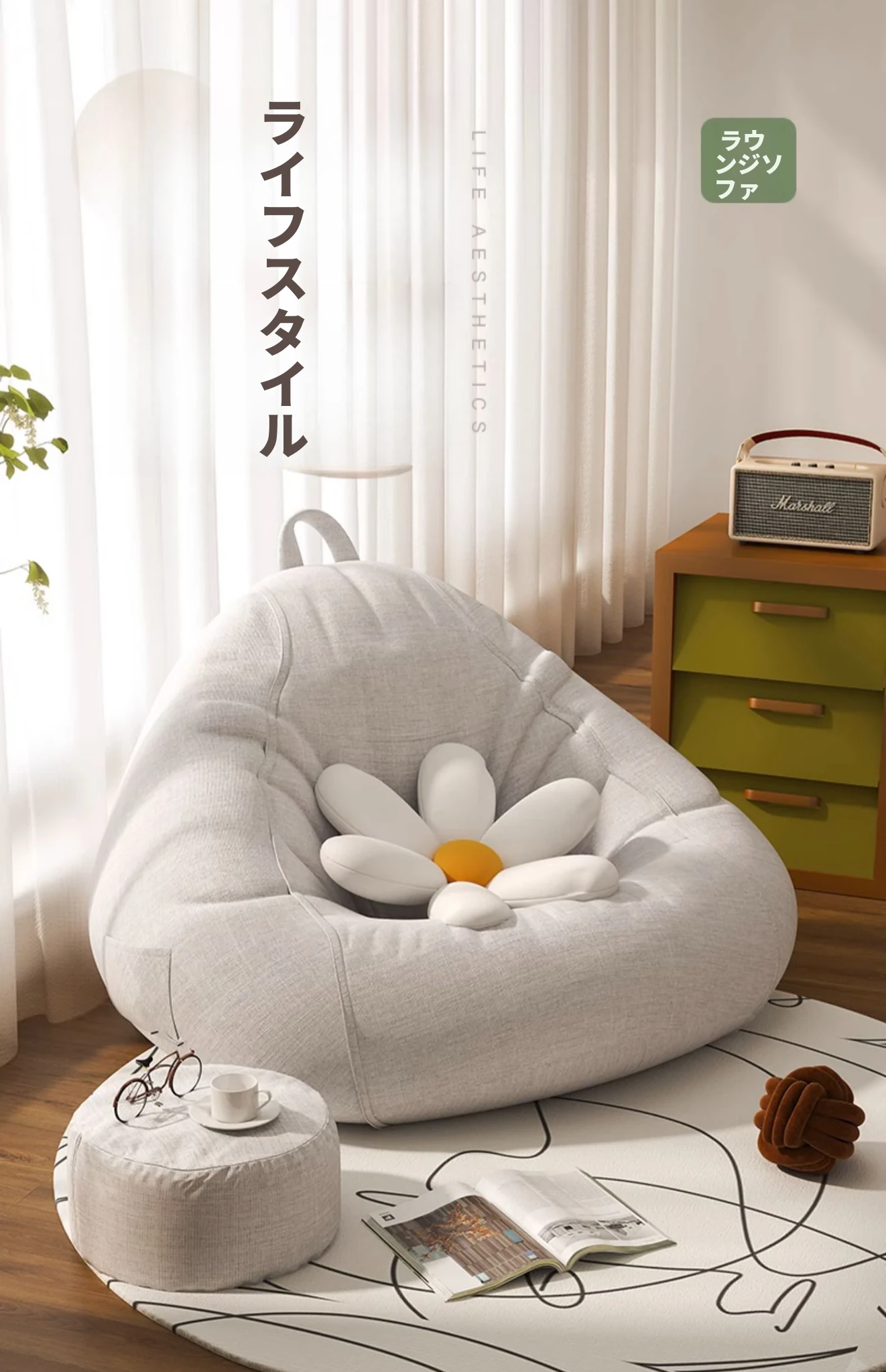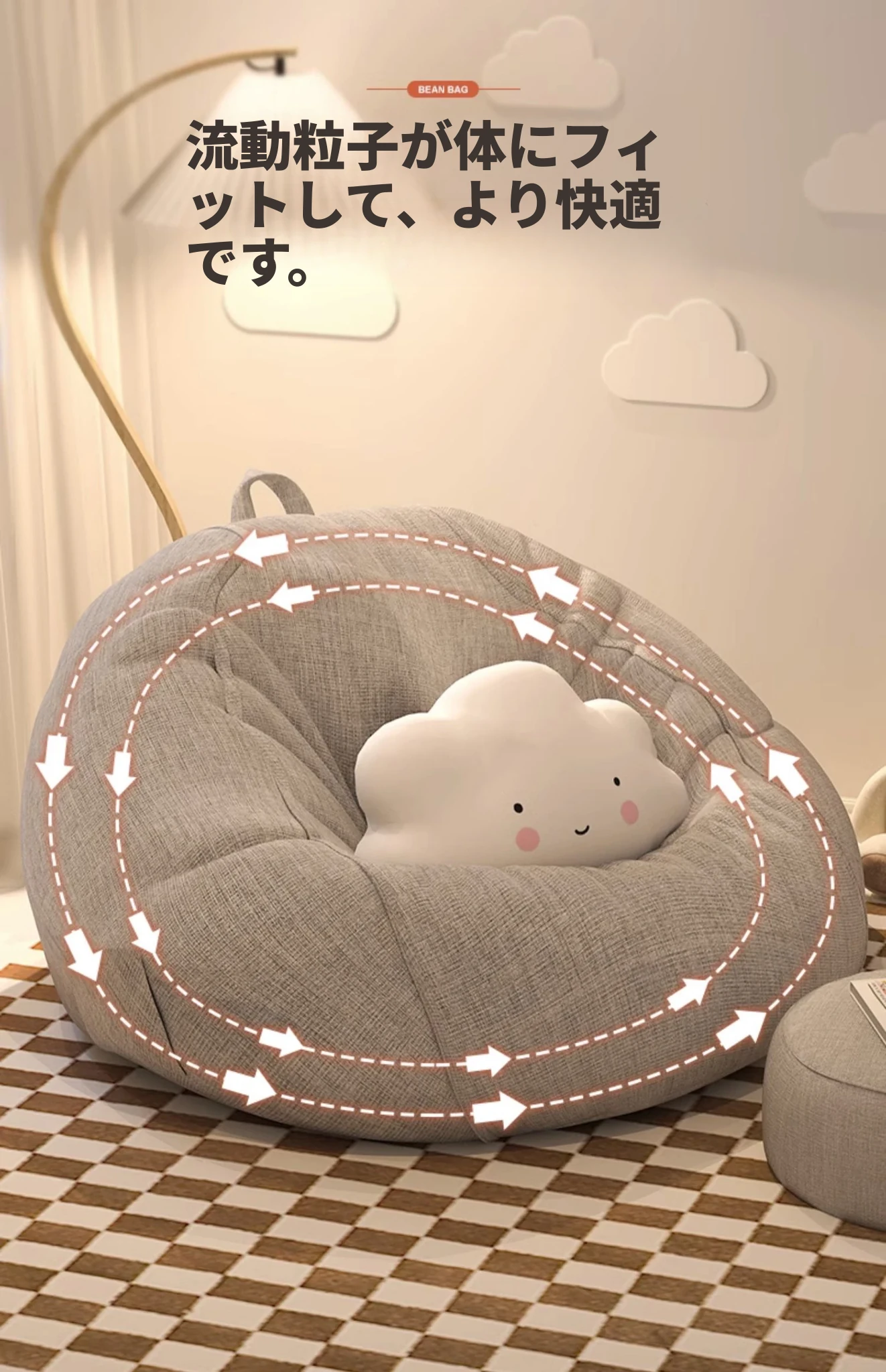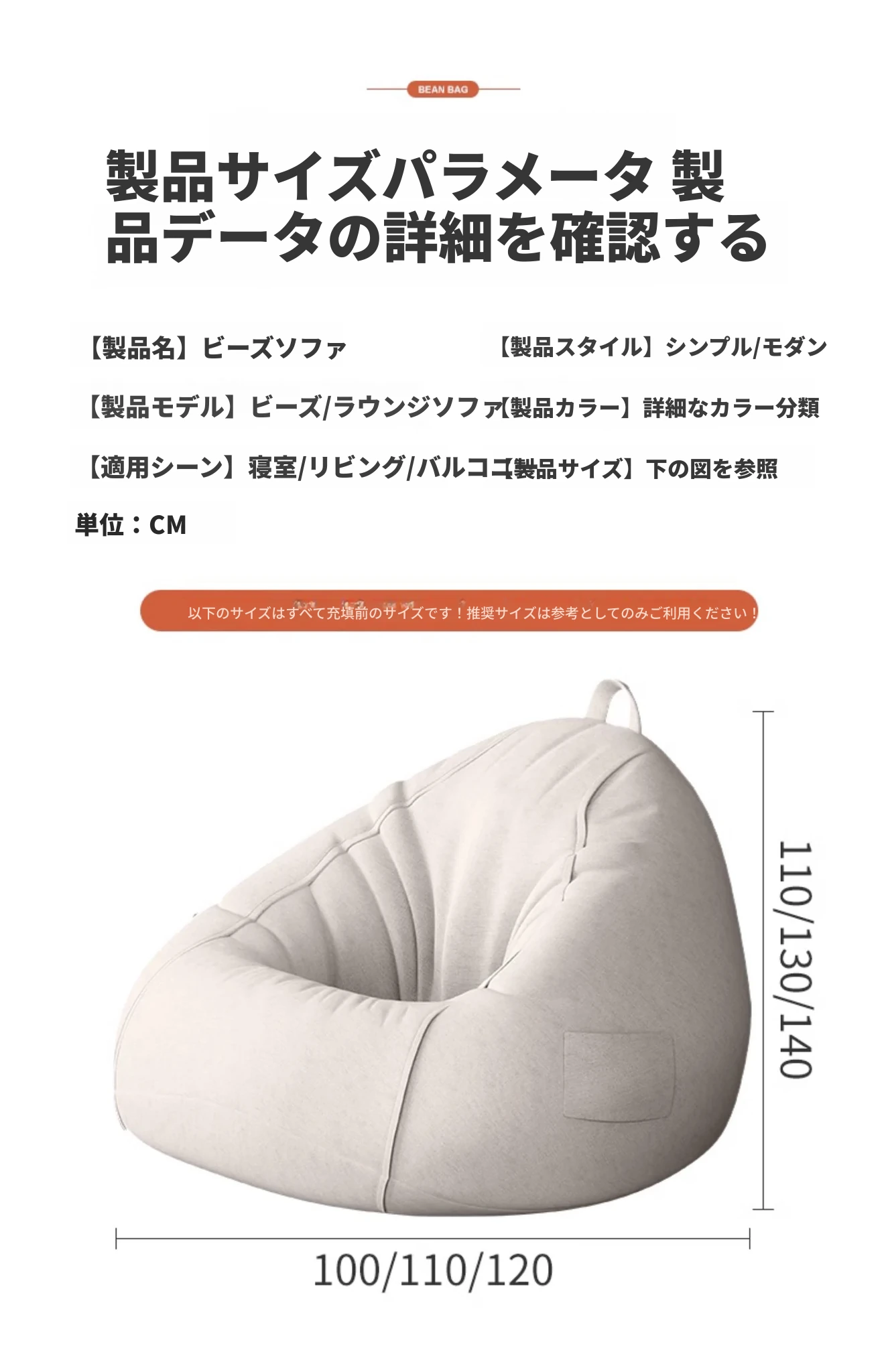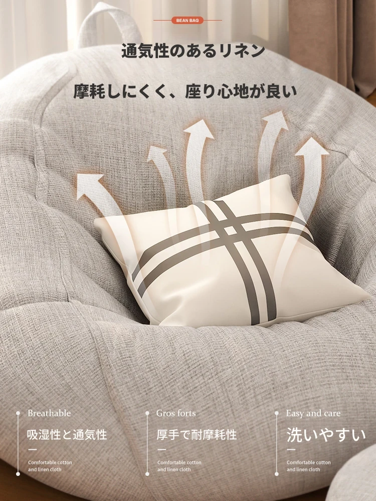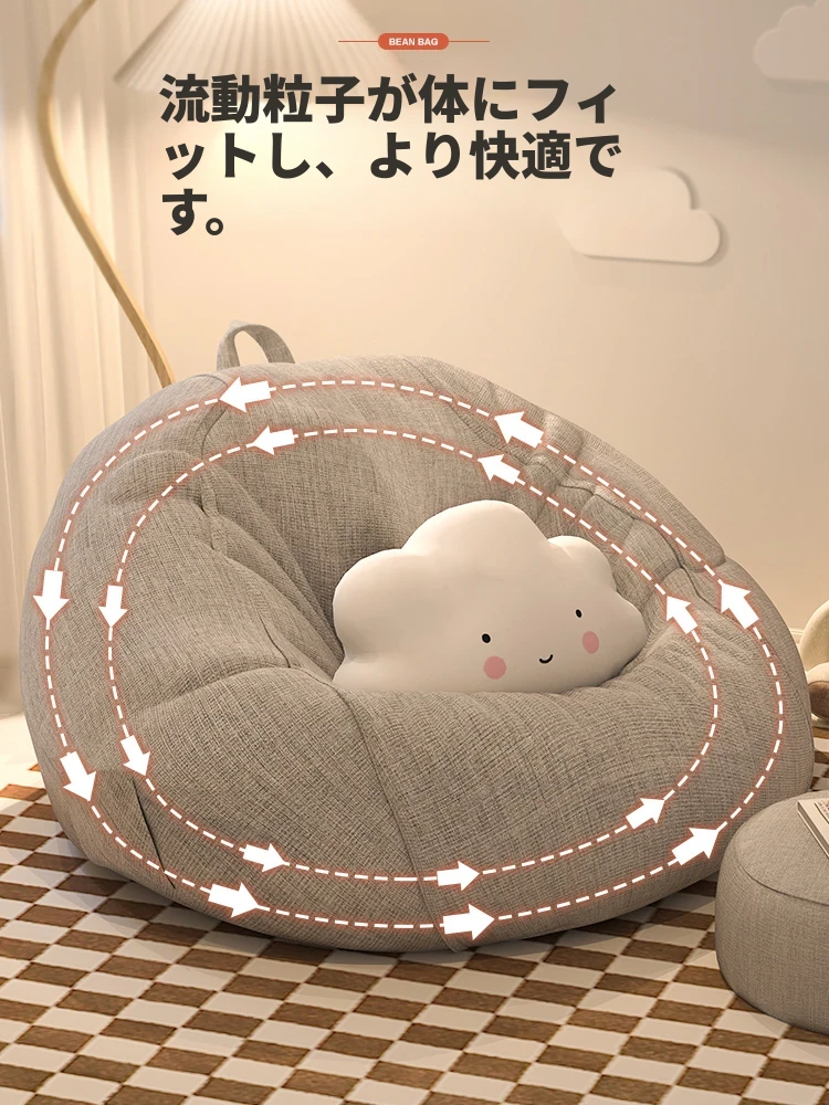 リラックスできる一人用ソファー!ふわふわのビーズクッションで、寝室やバルコニーにぴったり。クリーミーな風合いで、タタミや人間用の犬の巣としても最適なリラックスチェアです!