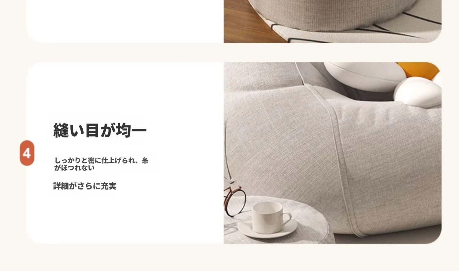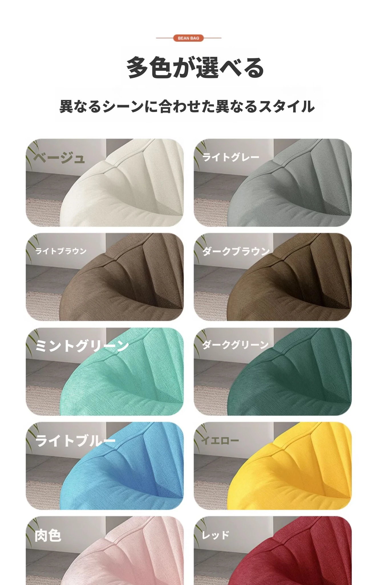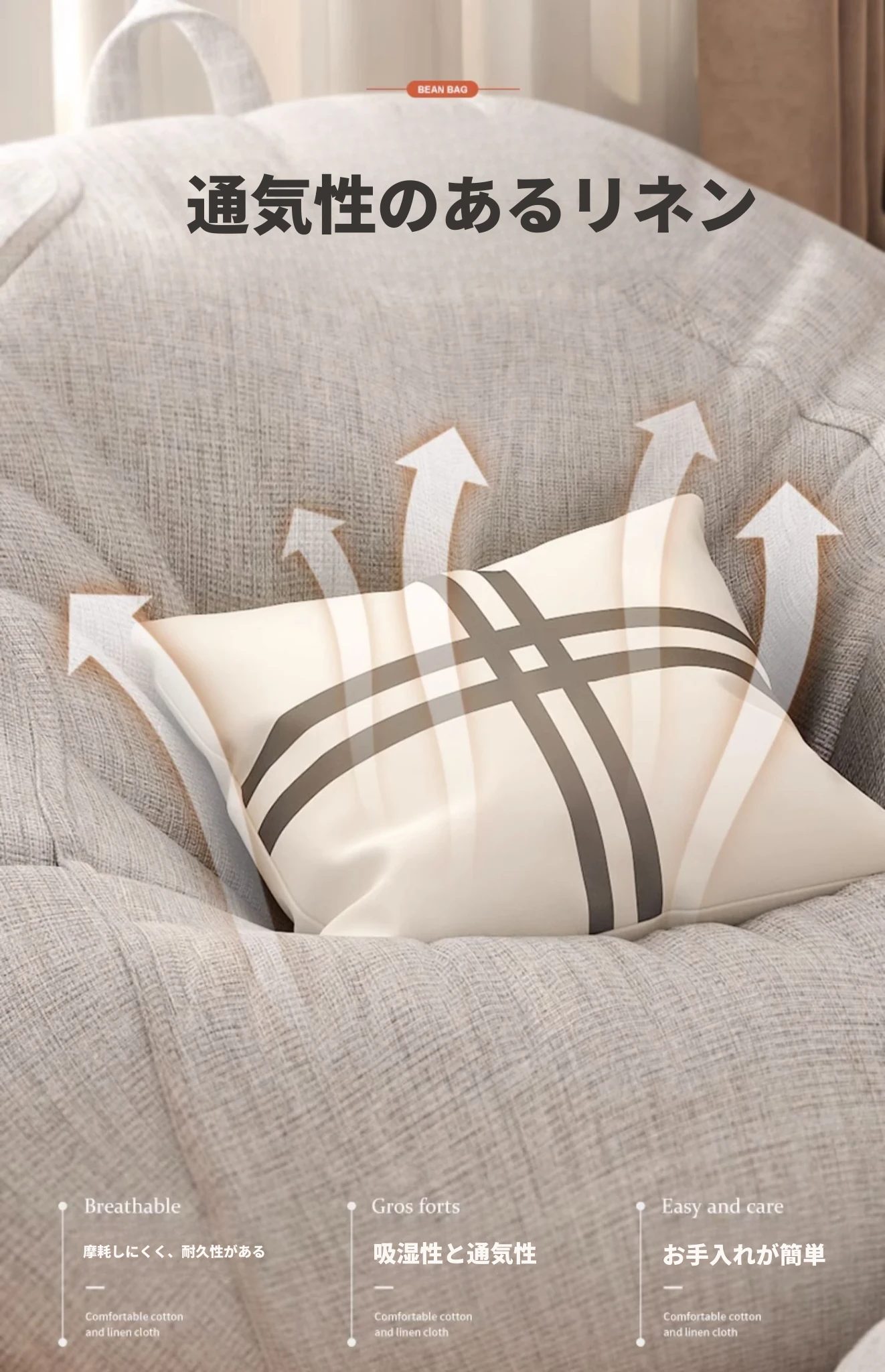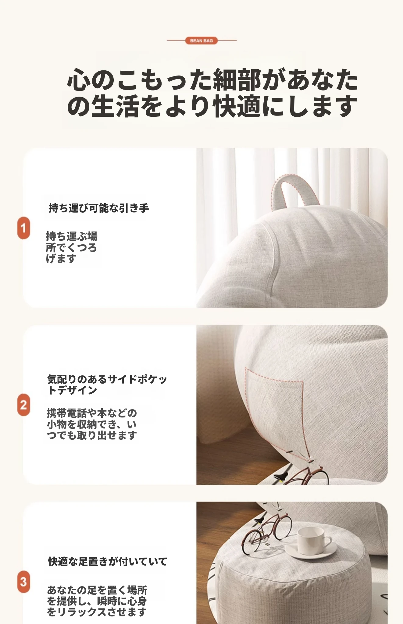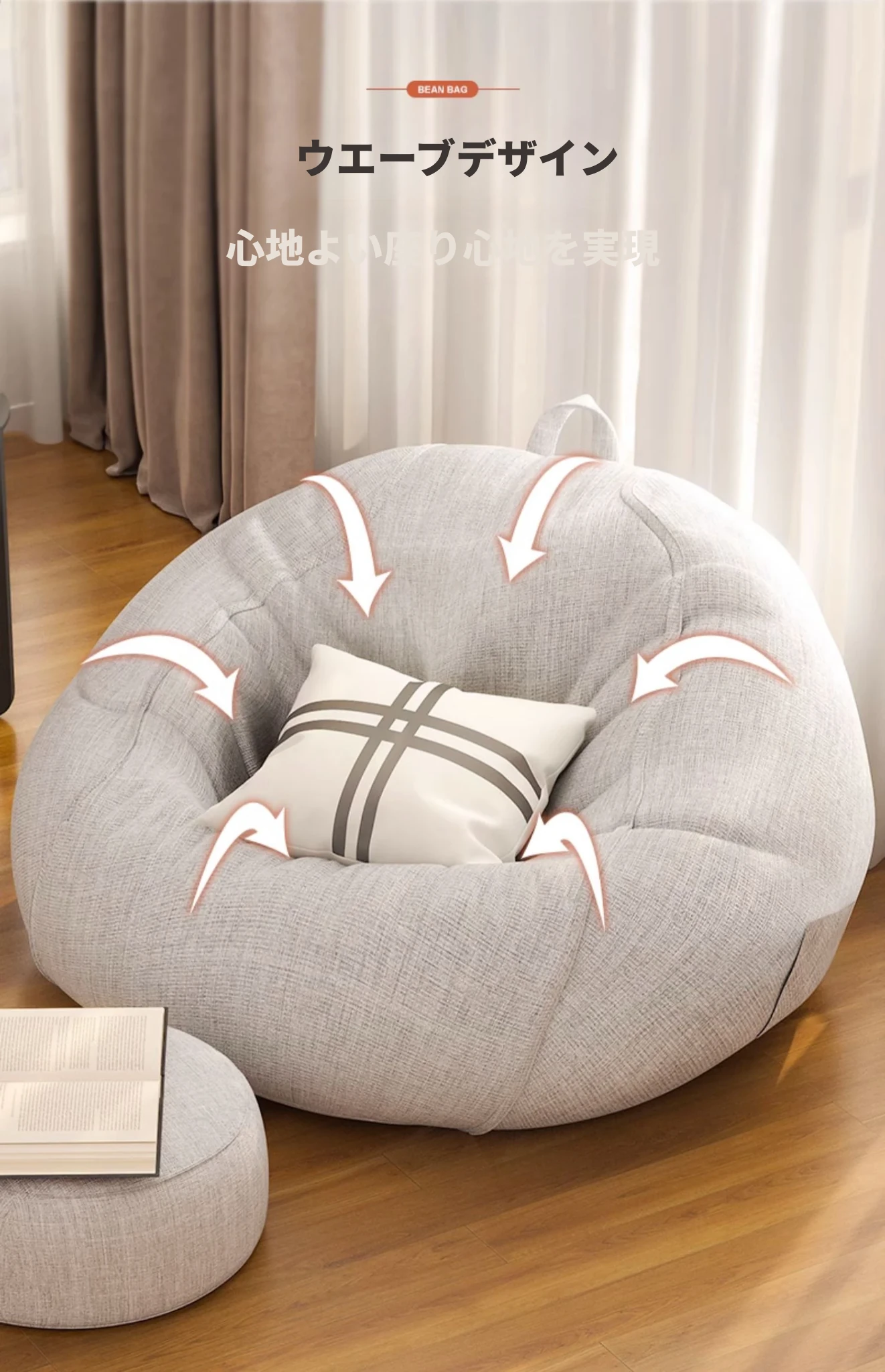 リラックスできる一人用ソファー!ふわふわのビーズクッションで、寝室やバルコニーにぴったり。クリーミーな風合いで、タタミや人間用の犬の巣としても最適なリラックスチェアです!