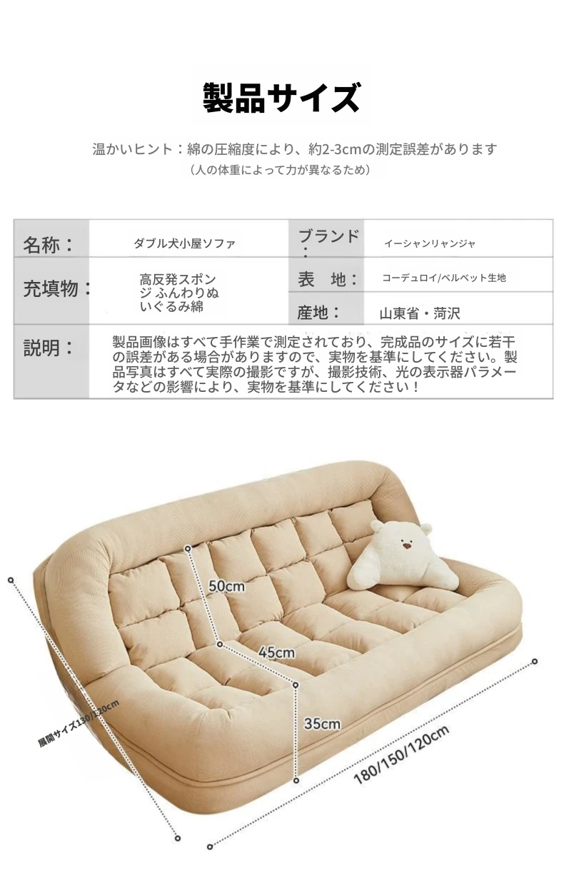 ダブル小ハウス【120*120】アイボリー肌触りの良いコーデュロイ【大クッション2個付き】厚手で大きな雲のような座り心地