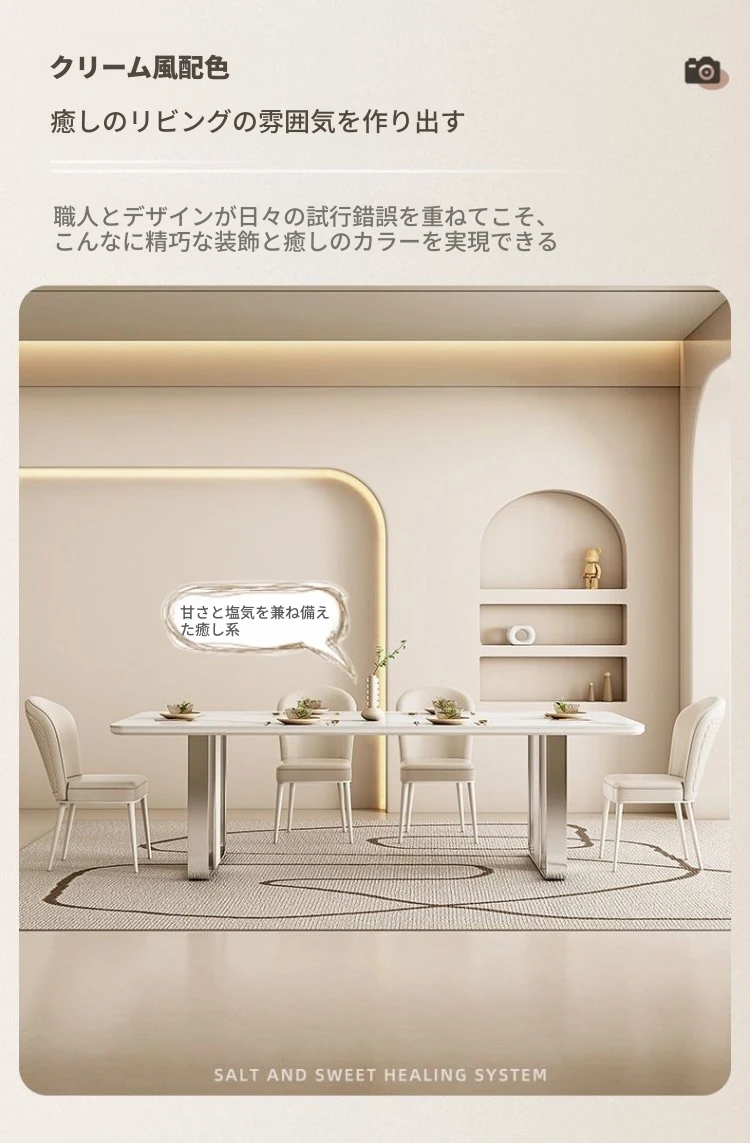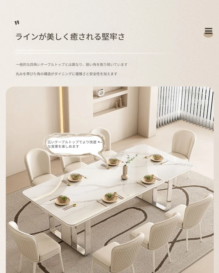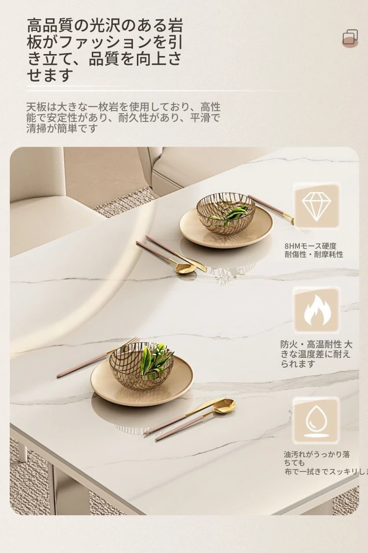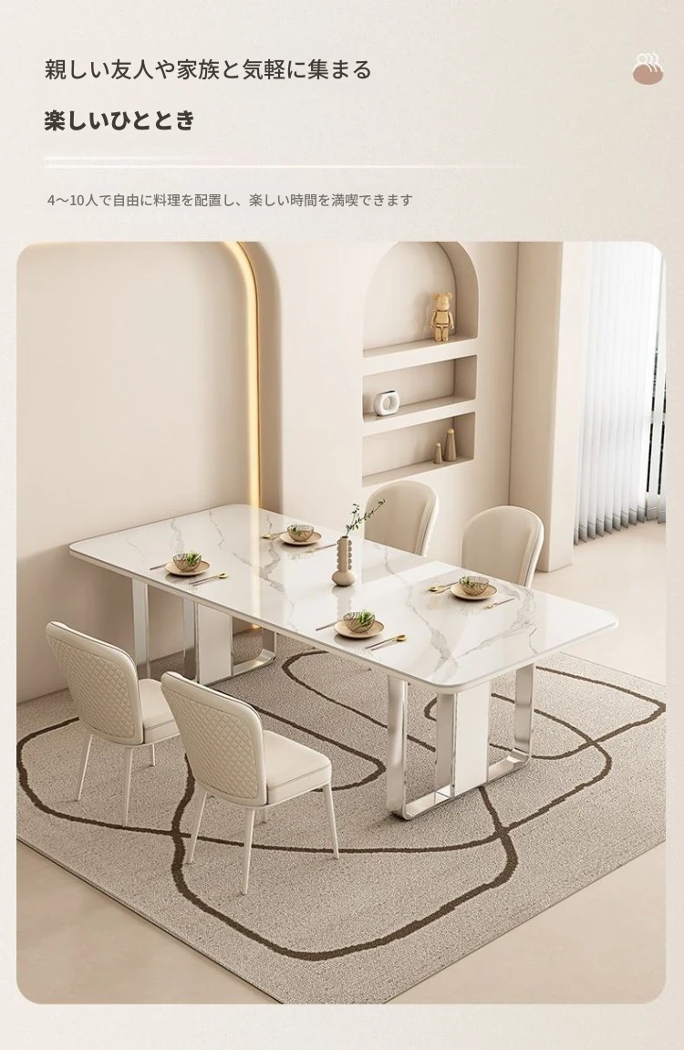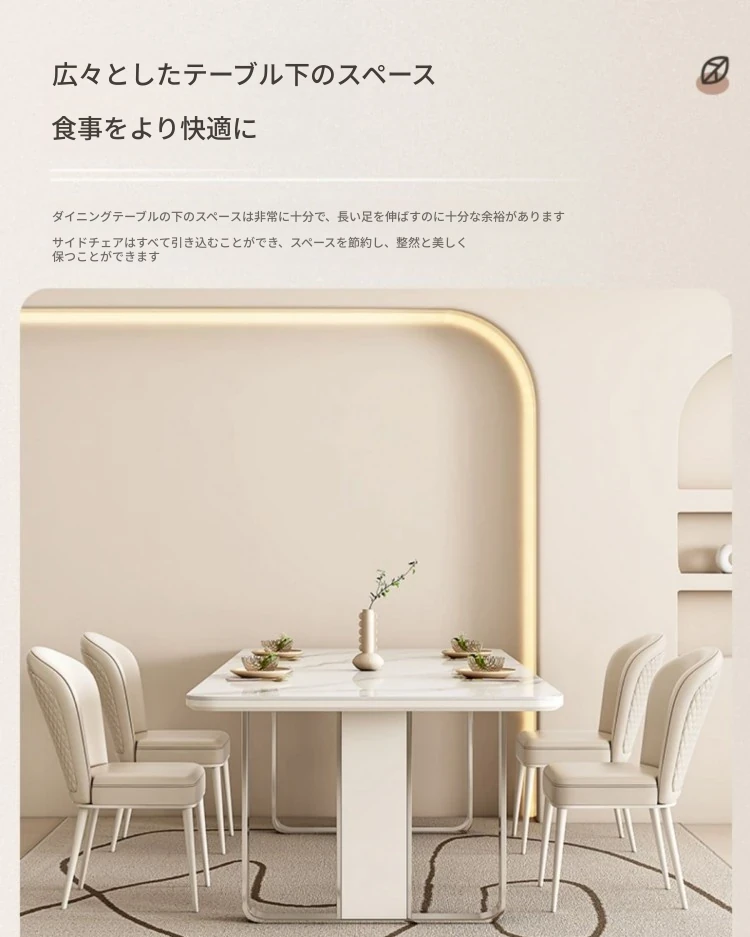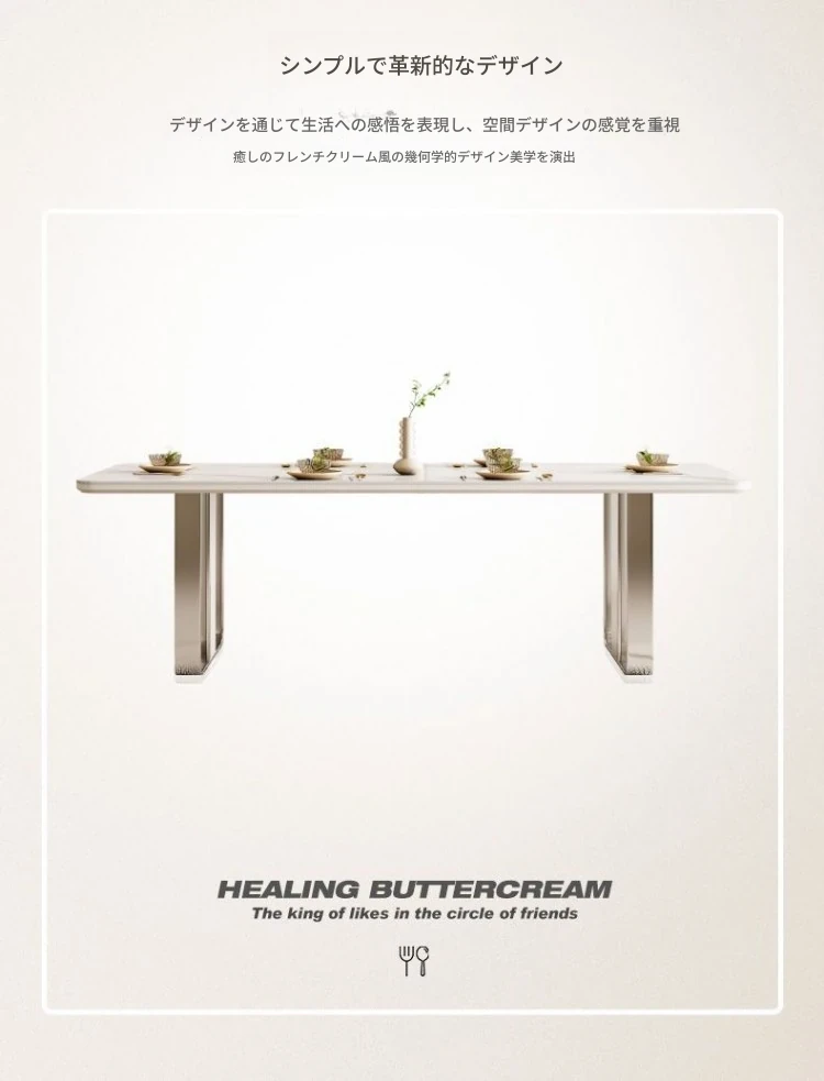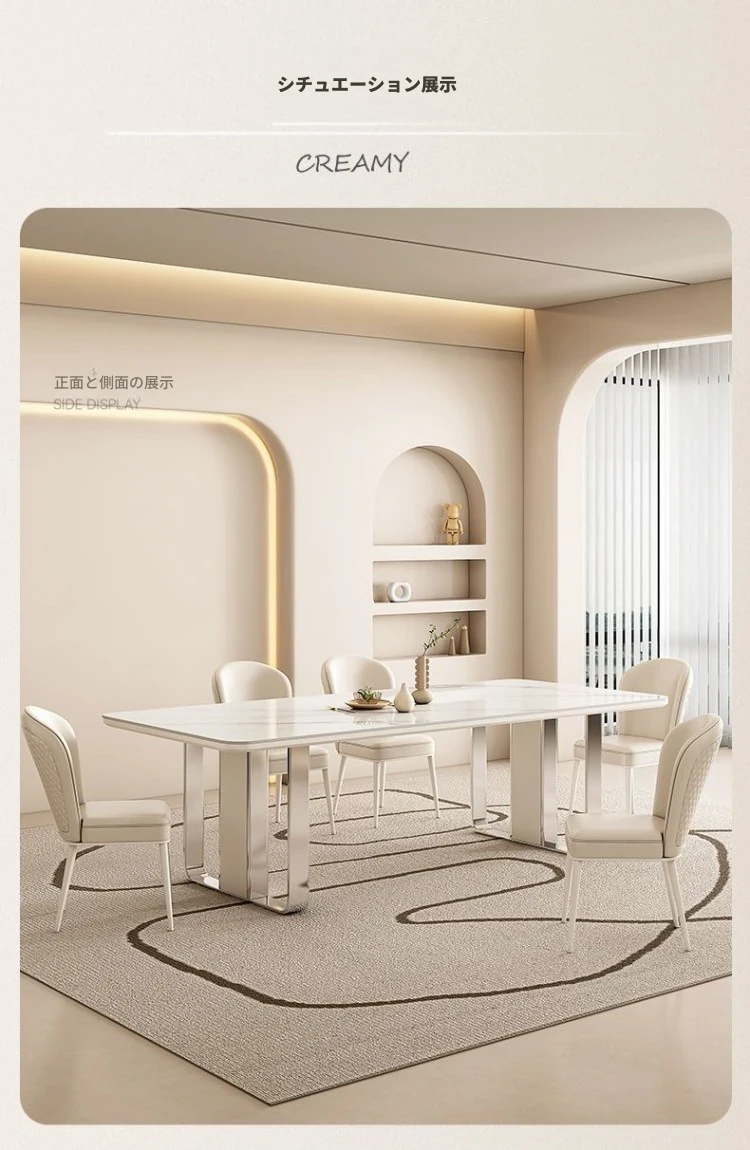 高級感溢れるクリーミーな光沢仕上げの岩板ダイニングテーブル!モダンでシンプルなデザイン、小さなスペースにもぴったりなラグジュアリーな長方形テーブルとチェアのセット。おしゃれな食事空間を演出します!