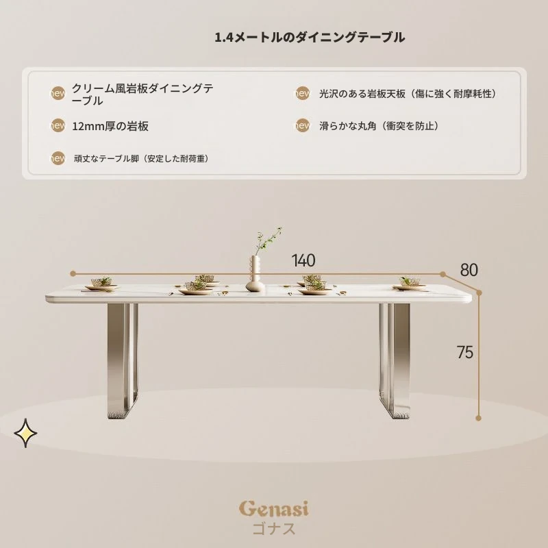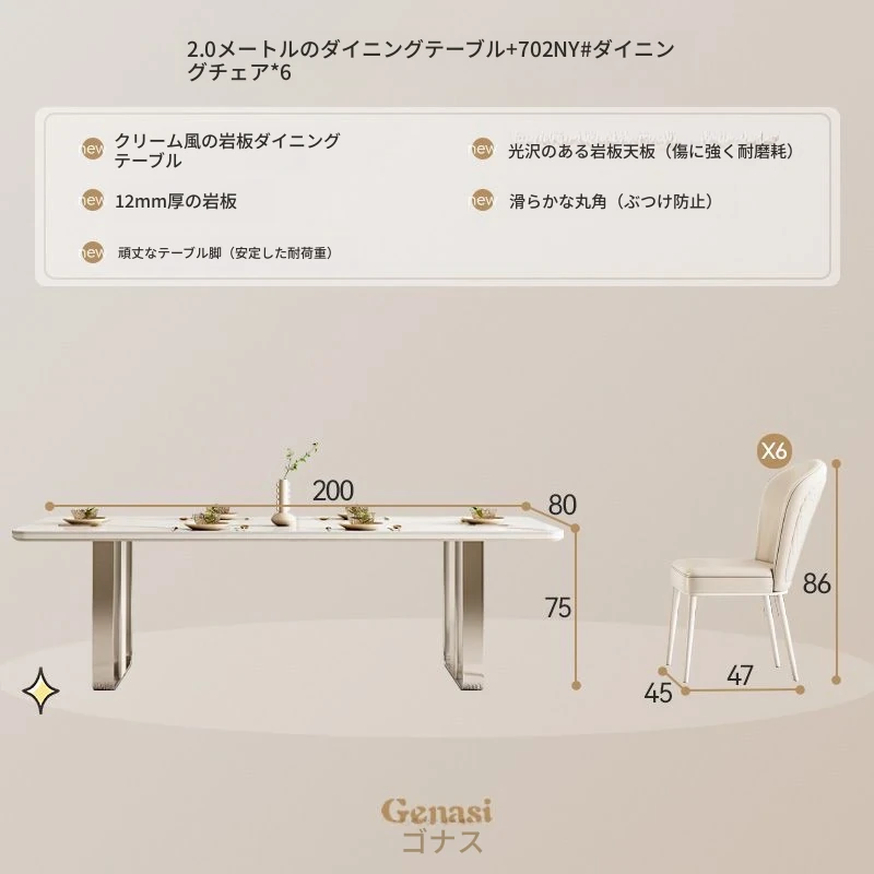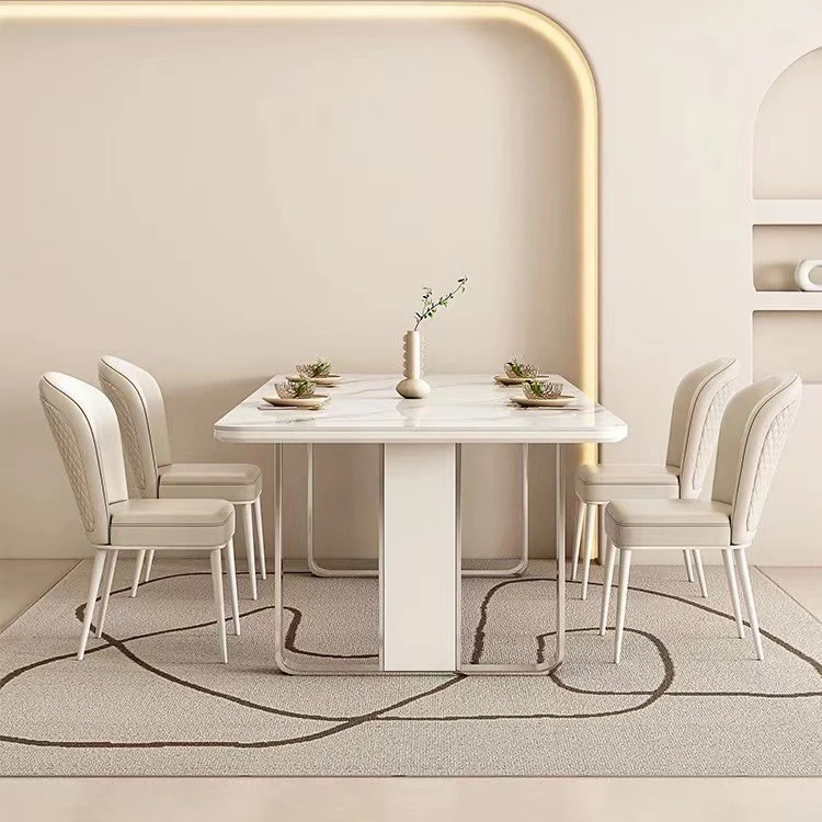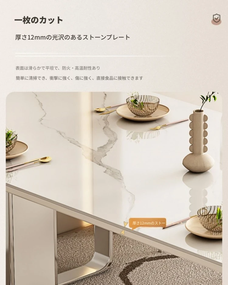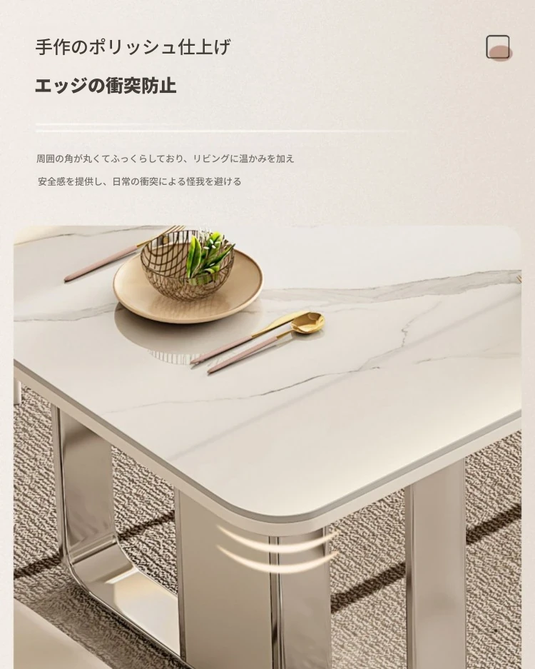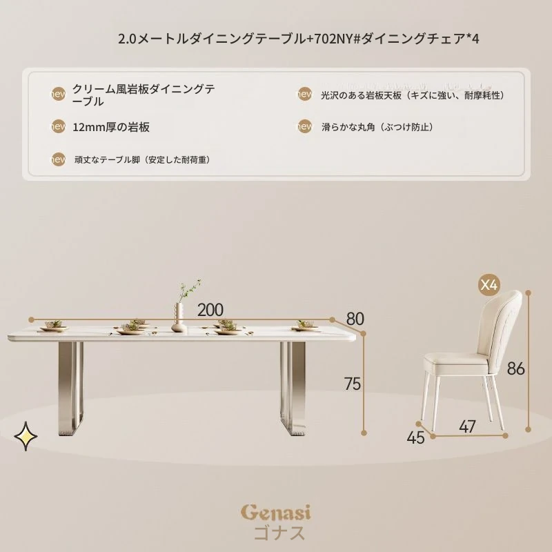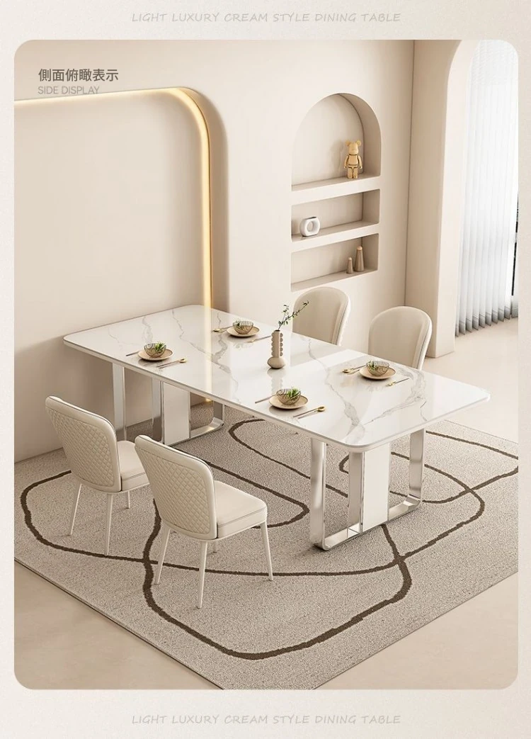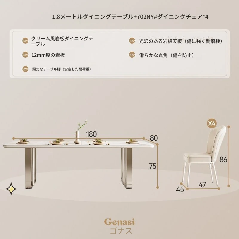 高級感溢れるクリーミーな光沢仕上げの岩板ダイニングテーブル!モダンでシンプルなデザイン、小さなスペースにもぴったりなラグジュアリーな長方形テーブルとチェアのセット。おしゃれな食事空間を演出します!