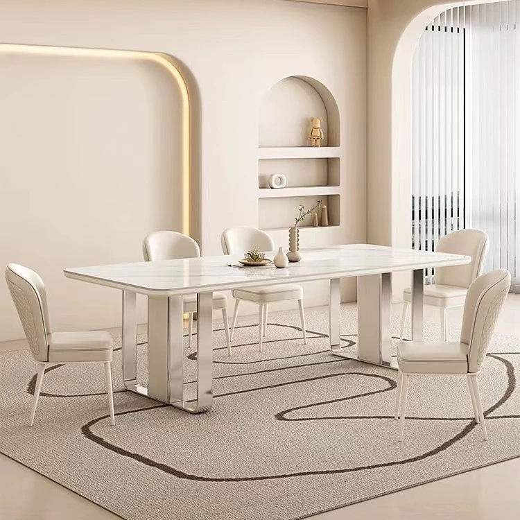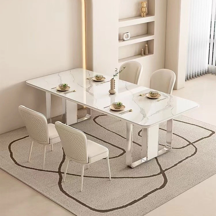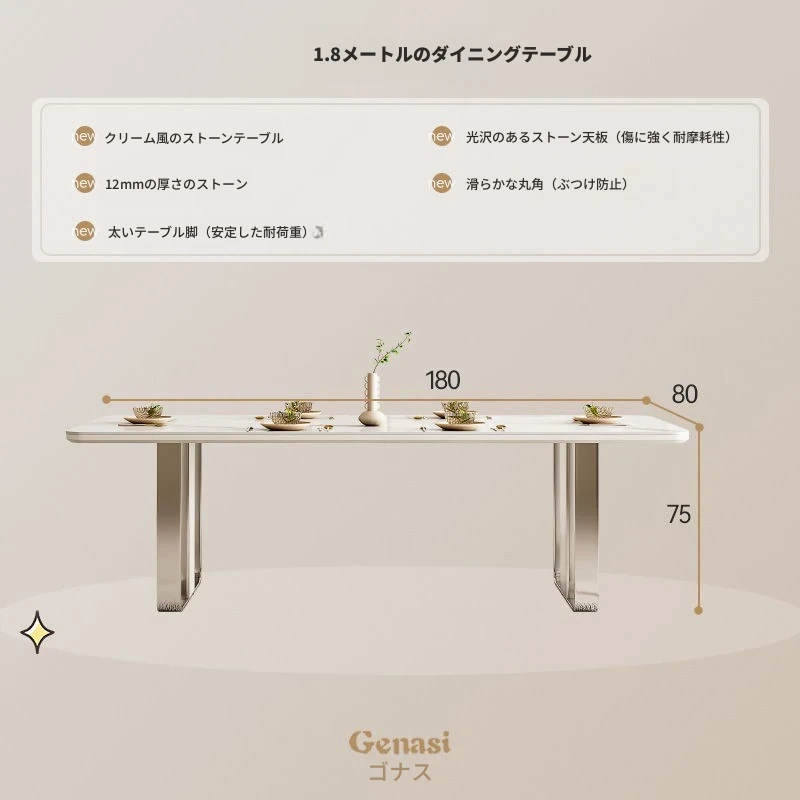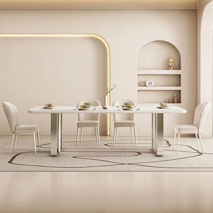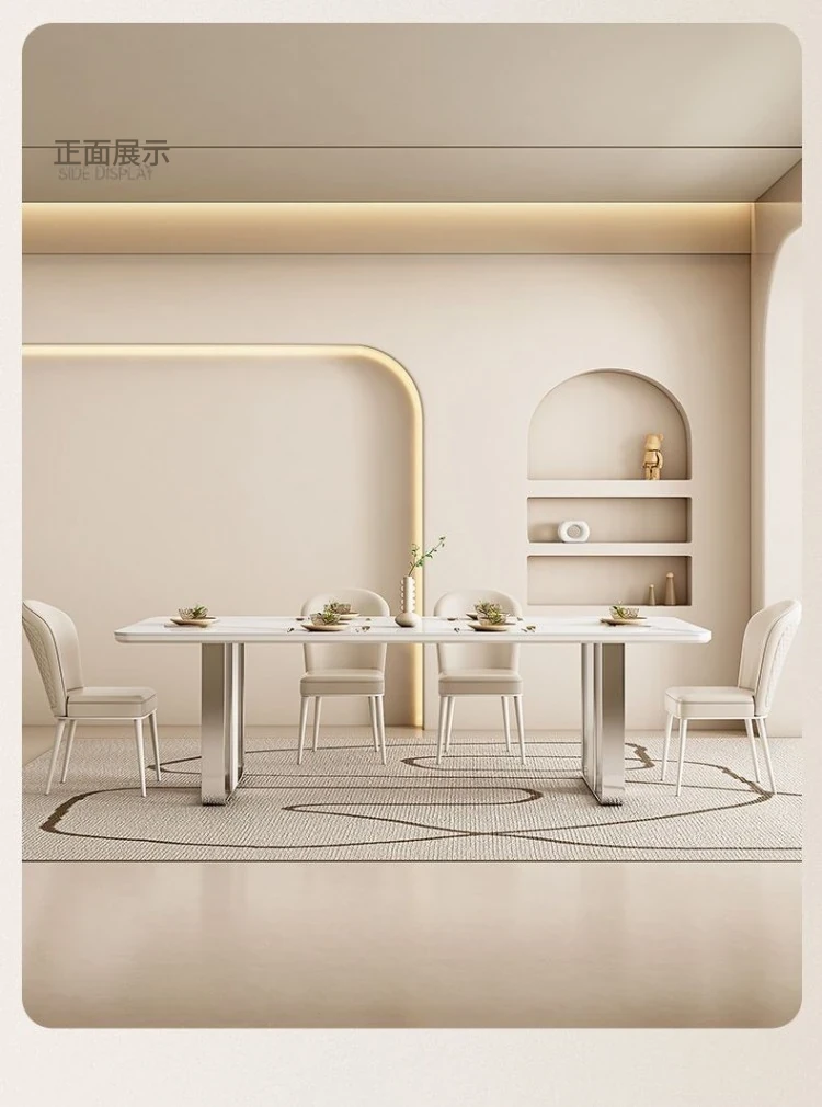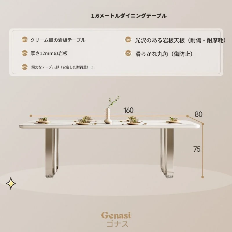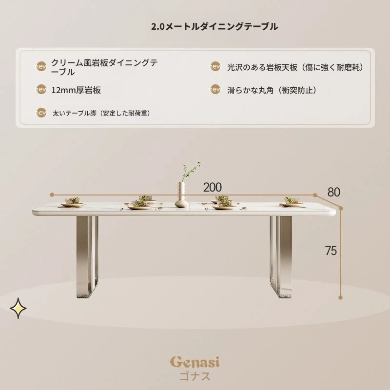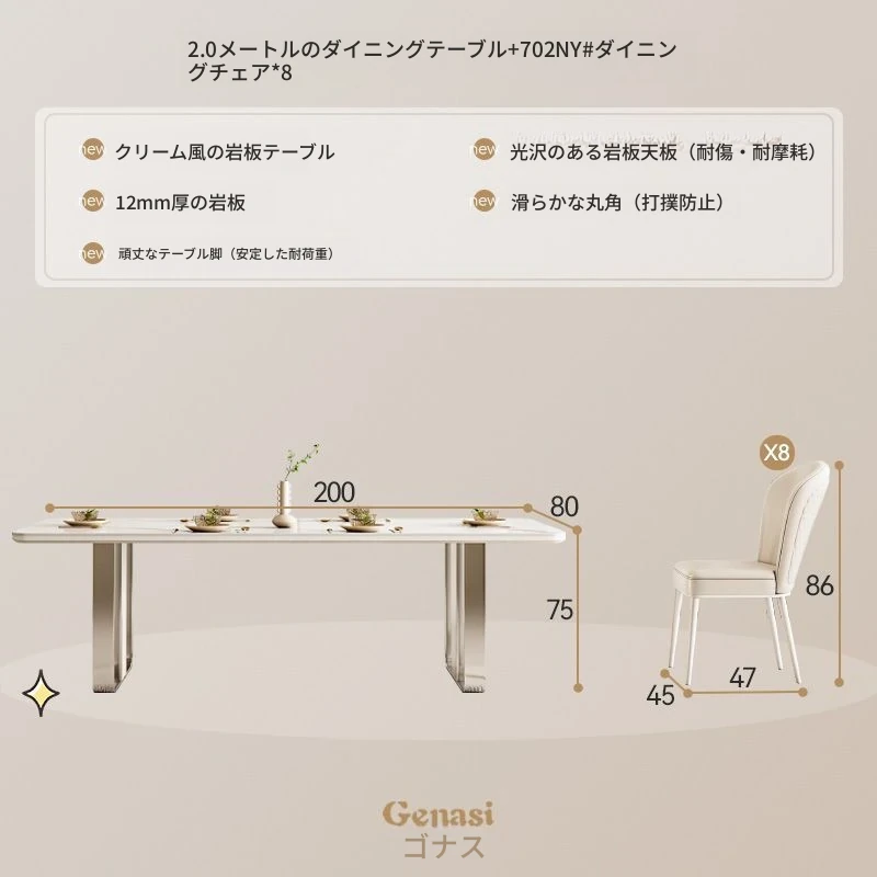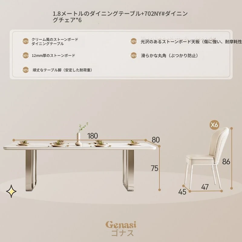 高級感溢れるクリーミーな光沢仕上げの岩板ダイニングテーブル!モダンでシンプルなデザイン、小さなスペースにもぴったりなラグジュアリーな長方形テーブルとチェアのセット。おしゃれな食事空間を演出します!