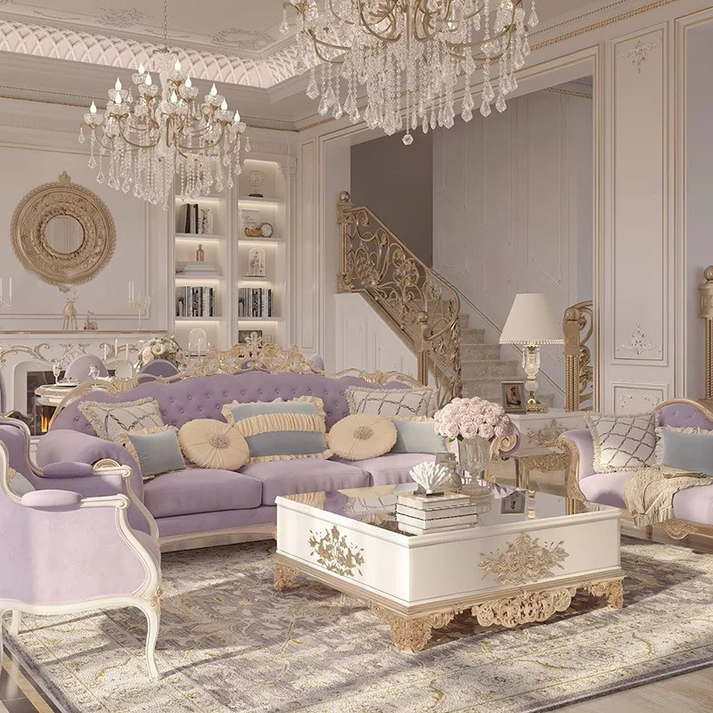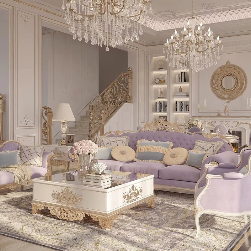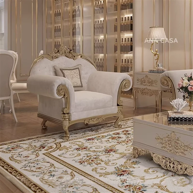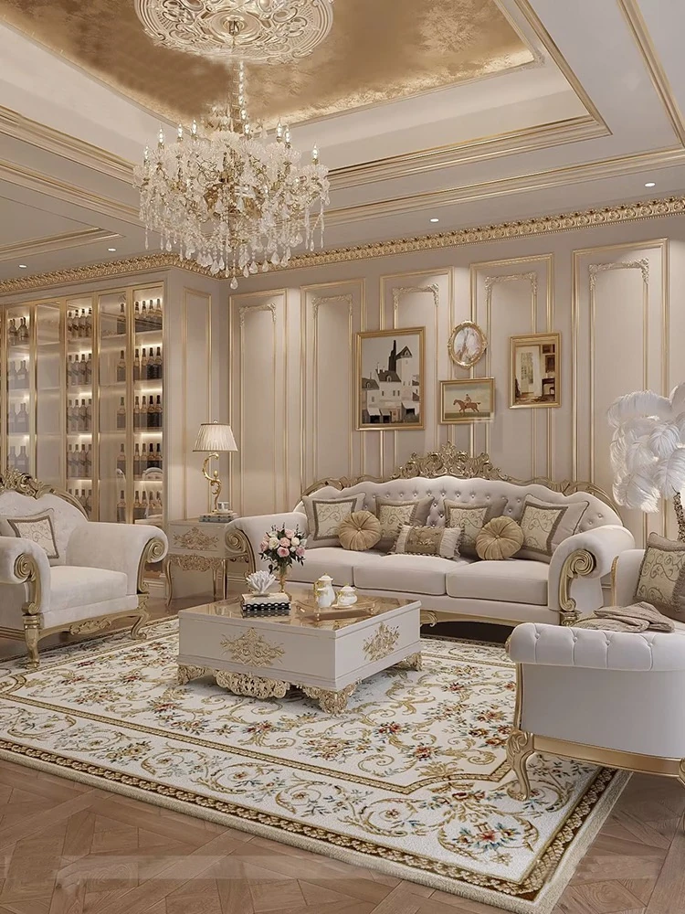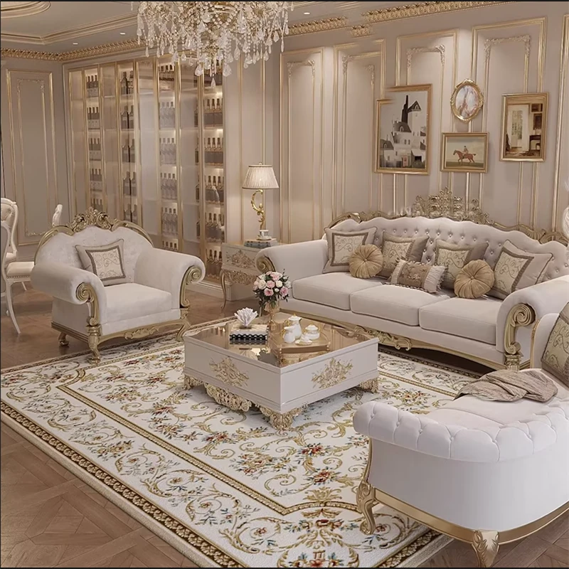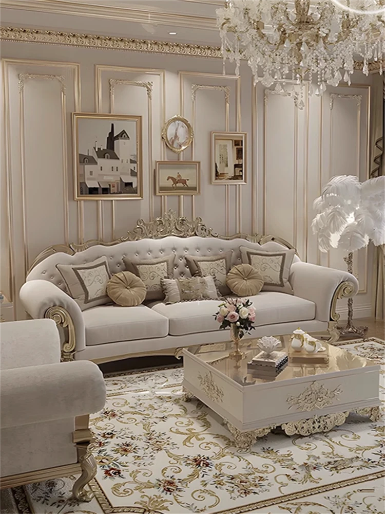 フレンチロイヤルスタイルの無垢材彫刻リビングルームソファセット - 高級感溢れる新しい軽奢ネオクラシック家具。洗練されたデザインで、優雅な空間を演出します。