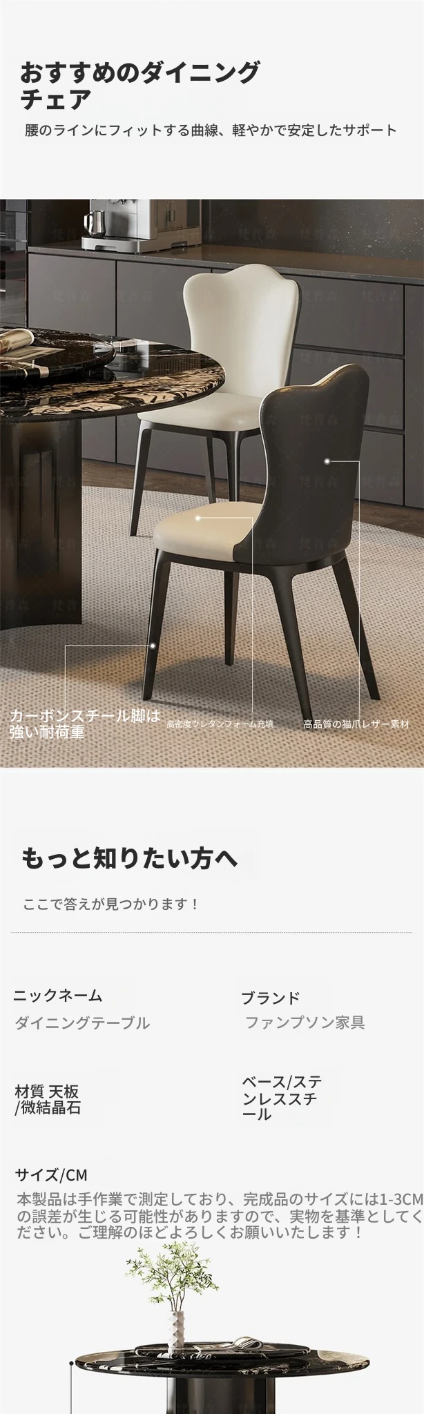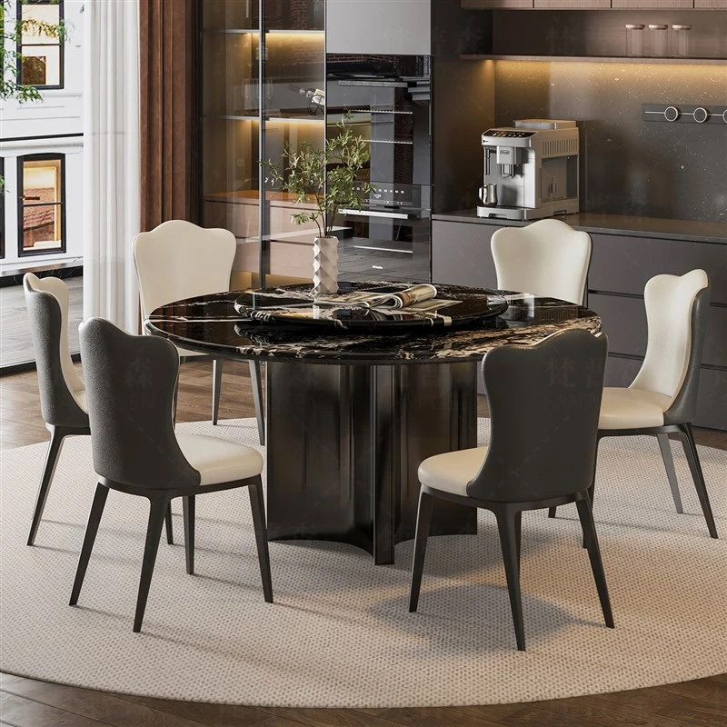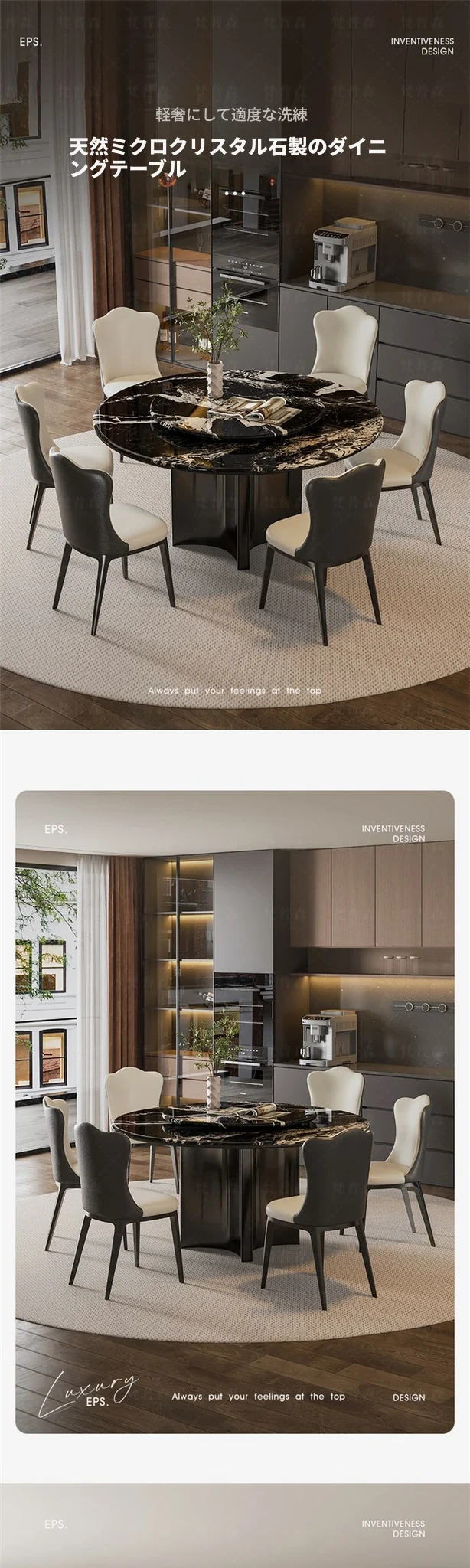 【アップグレード版全托】ナポレオンブラック天然微晶石ダイニングテーブル+回転台+猫爪皮製ダイニングチェア*6