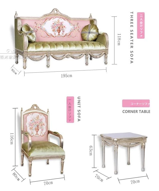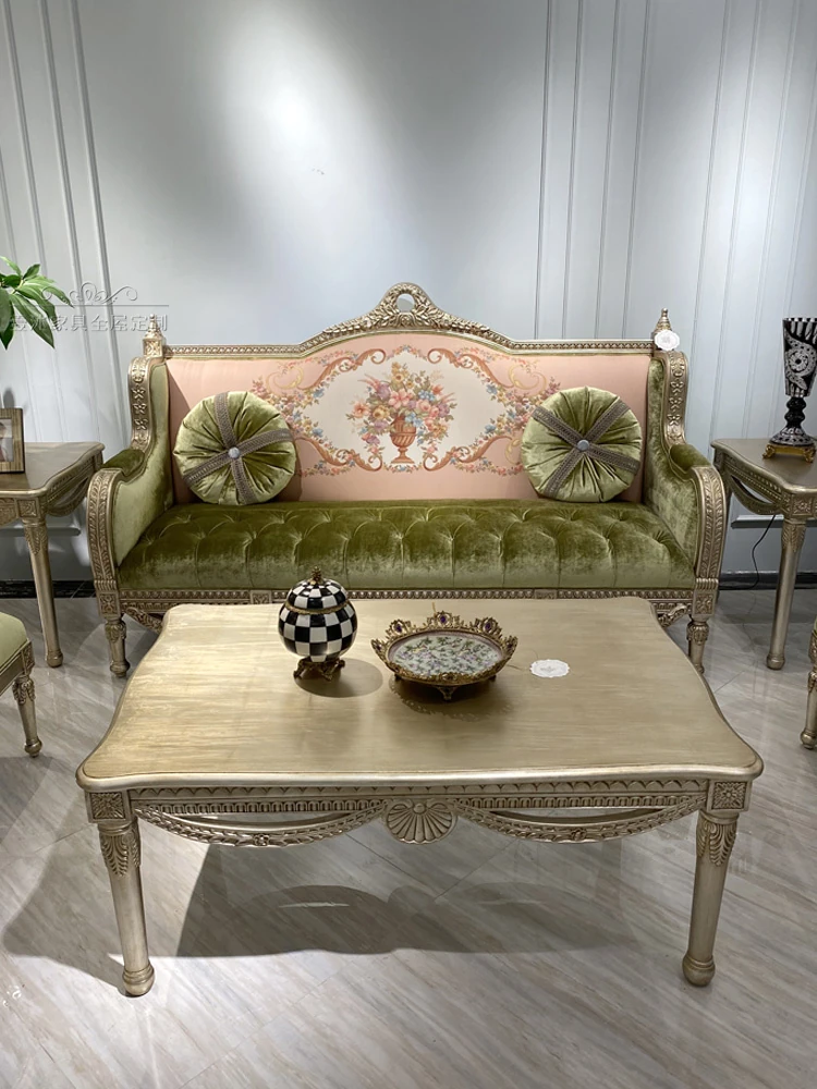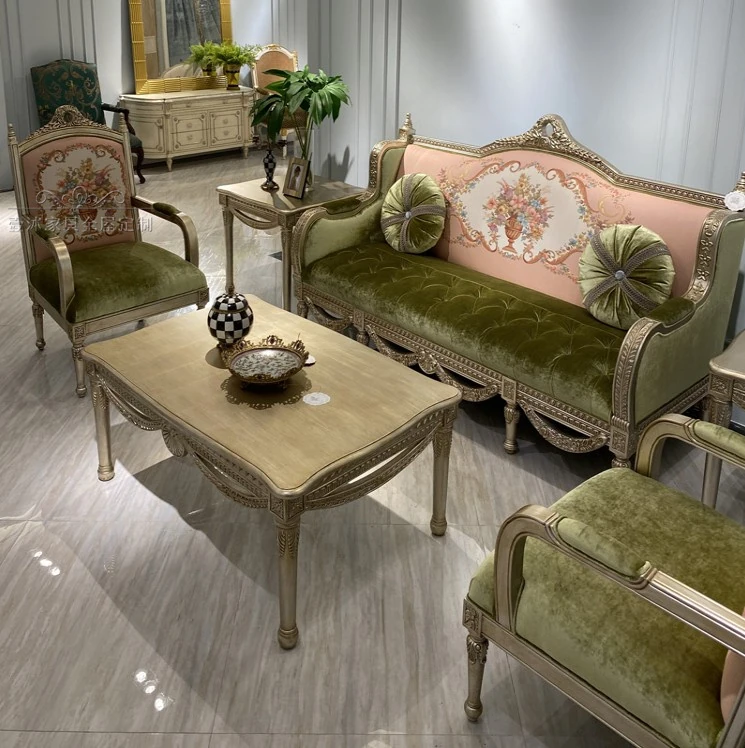 フレンチロマンティックな豪華ピンクグリーンの無垢材生地ソファ、欧風彫刻デザインのレトロヴィラ用高級リビングルームセット。洗練されたスタイルで特別な空間を演出!