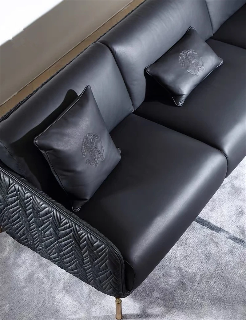 Italian Bert Luxury Minimalist Straight Sofa - Black Leather Upholstered with Embroidery, Elegant New Collection Sofa Set for Your Living Room