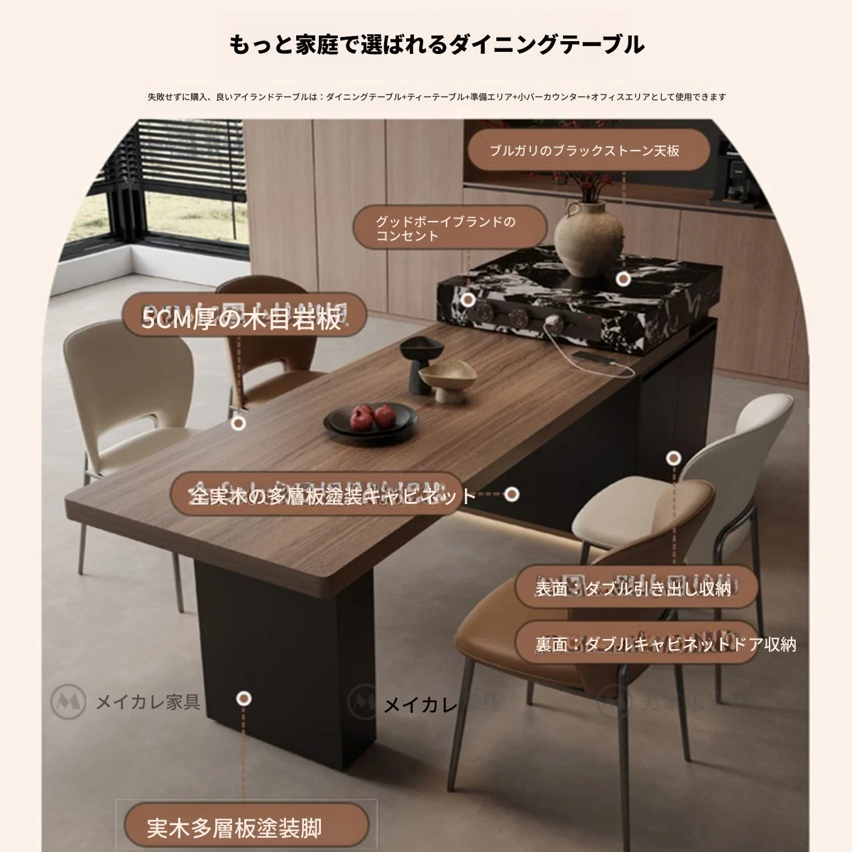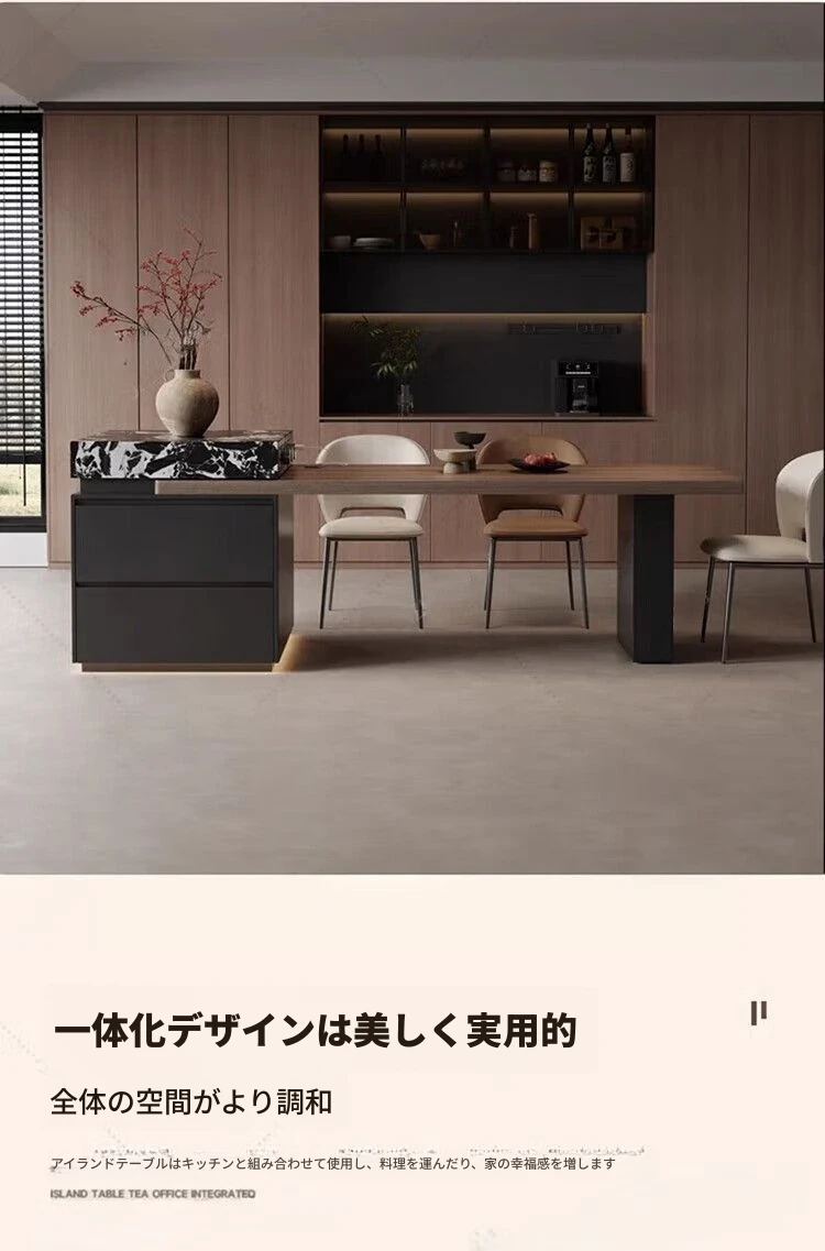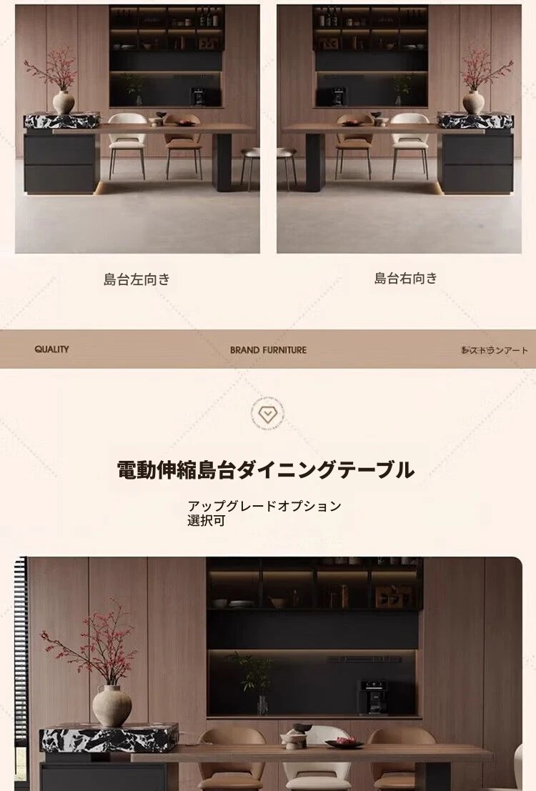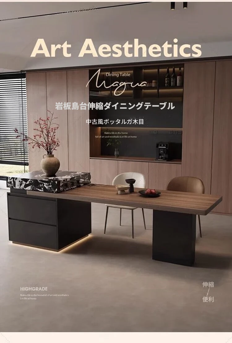 イタリアンミニマリスト伸縮式アイランドダイニングテーブル - 家庭向けの多機能大平面デザイン、木目調の岩板仕上げでスタイリッシュな食卓を演出します。