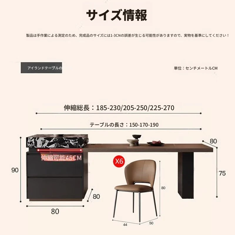 1.85-2.3メートル伸縮可能【テーブルトップ下掛け岩板】/アイランドテーブル+6椅子【無垢材多層板】
