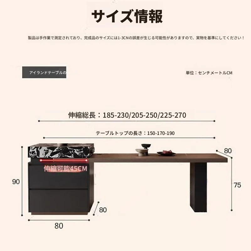 1.85-2.3メートル伸縮可能【テーブルトップ下掛け岩板】/アイランドテーブル【無垢材多層板】