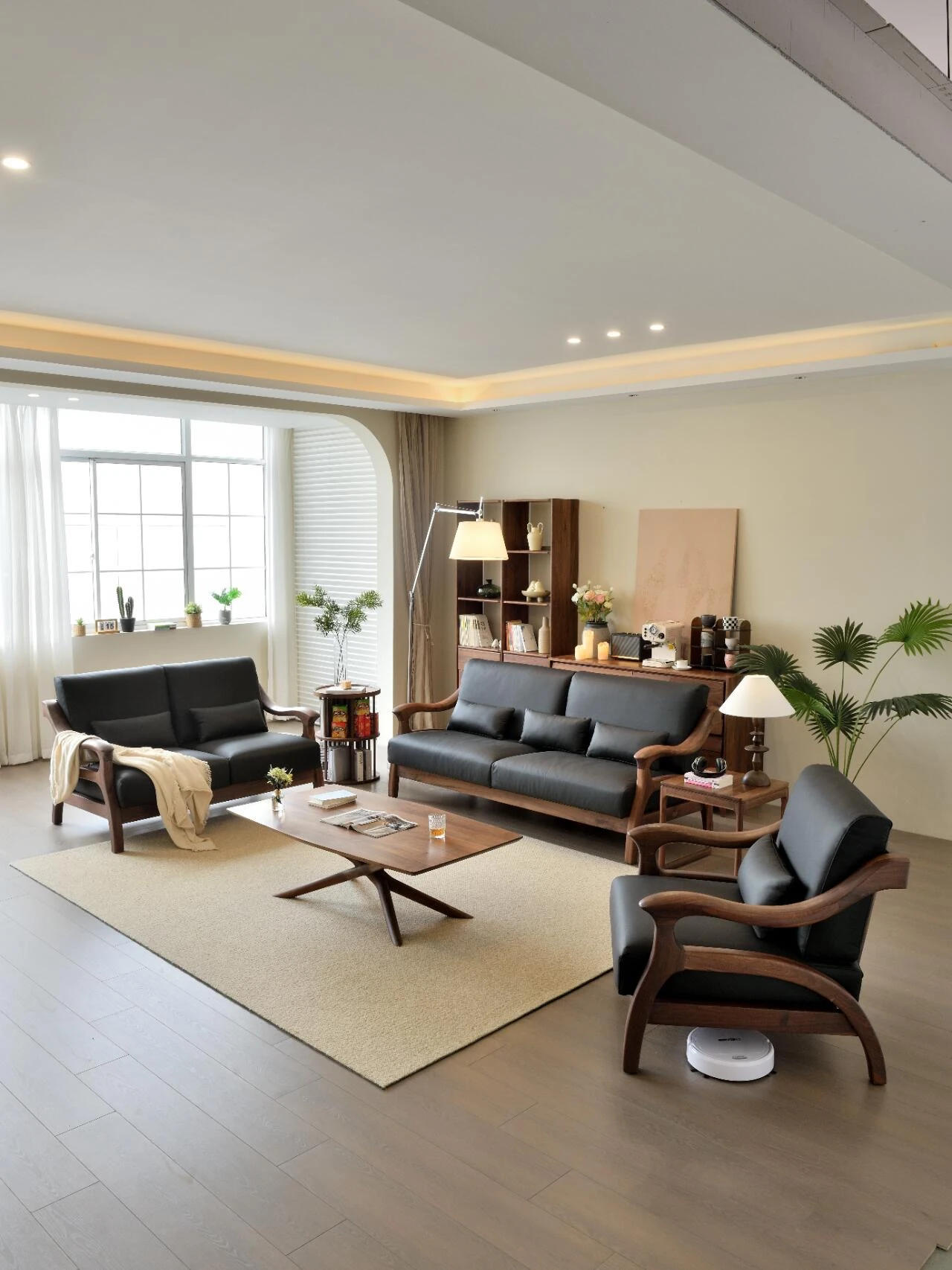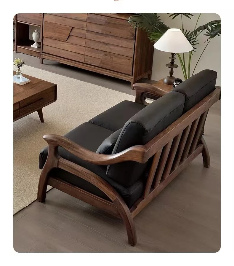イタリアンミニマリズムの無垢材ソファセット|本革使用・モダンでシンプルな新中式デザイン|高級ブラックウォールナット木材採用で、洗練されたリビング空間を演出!