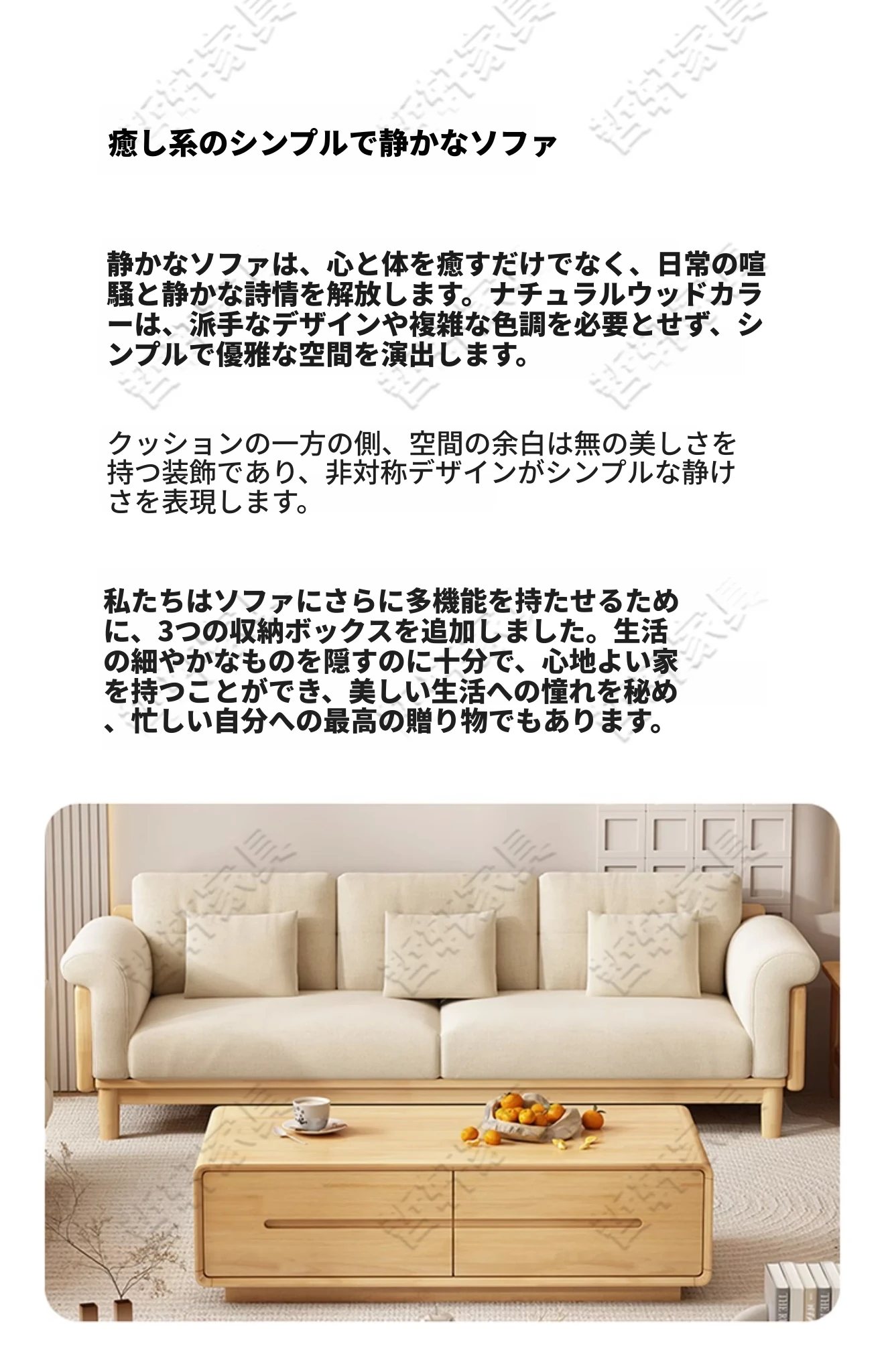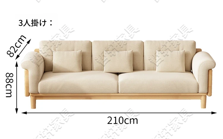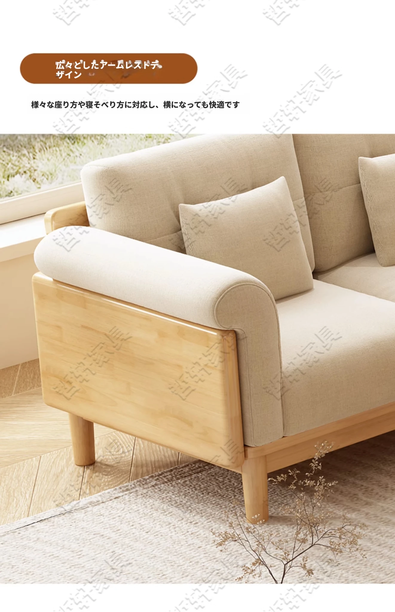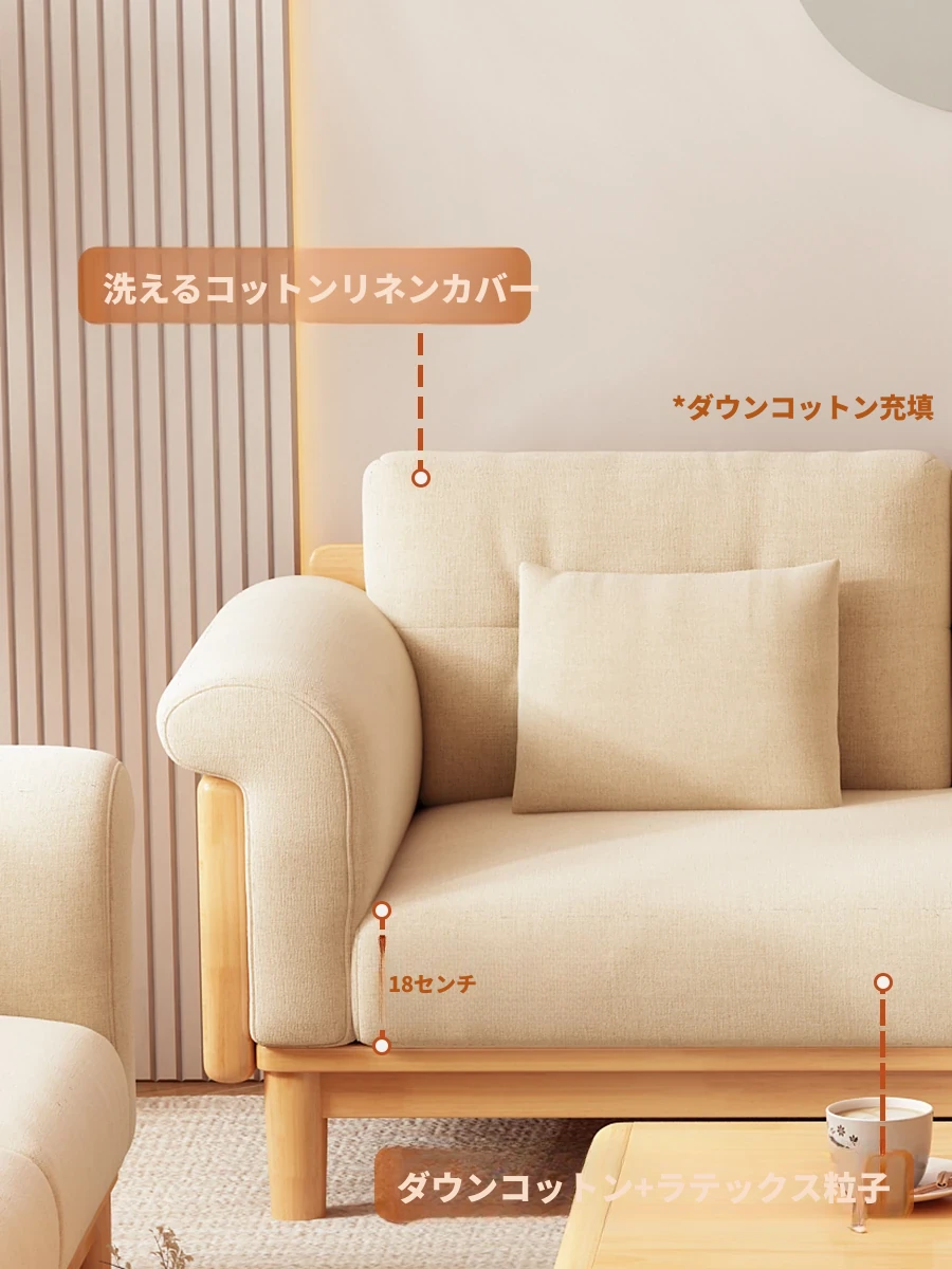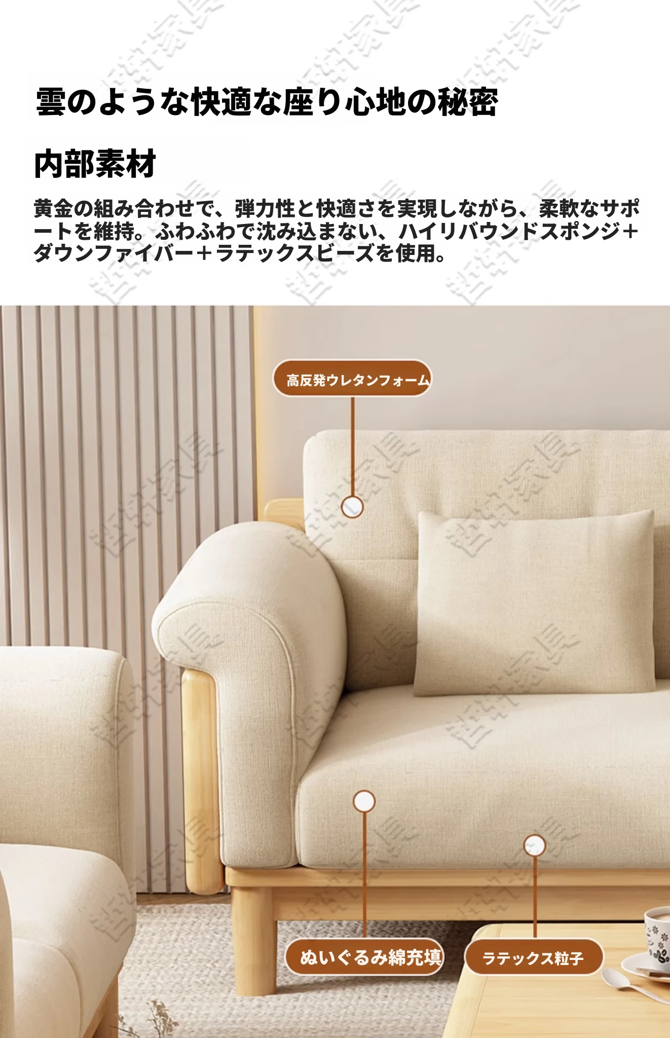 和風雲朵ソファー|無垢材使用の3人掛け|ナチュラルデザイン|小型リビングに最適|クリーミーな風合い|シンプルで洗える布製|快適な座り心地を実現!