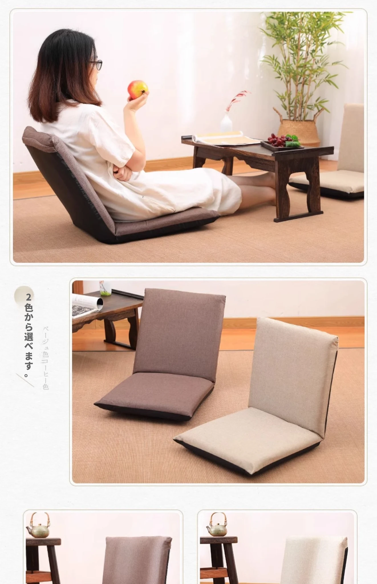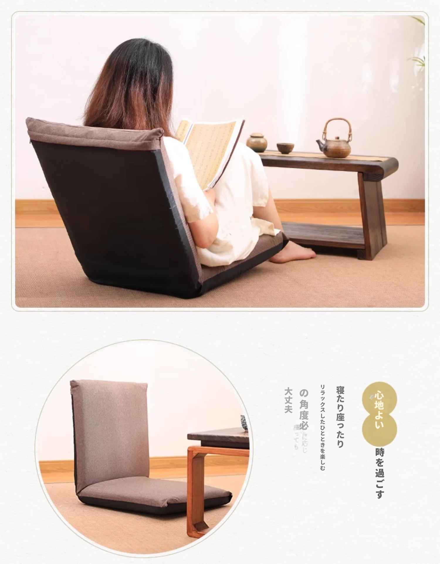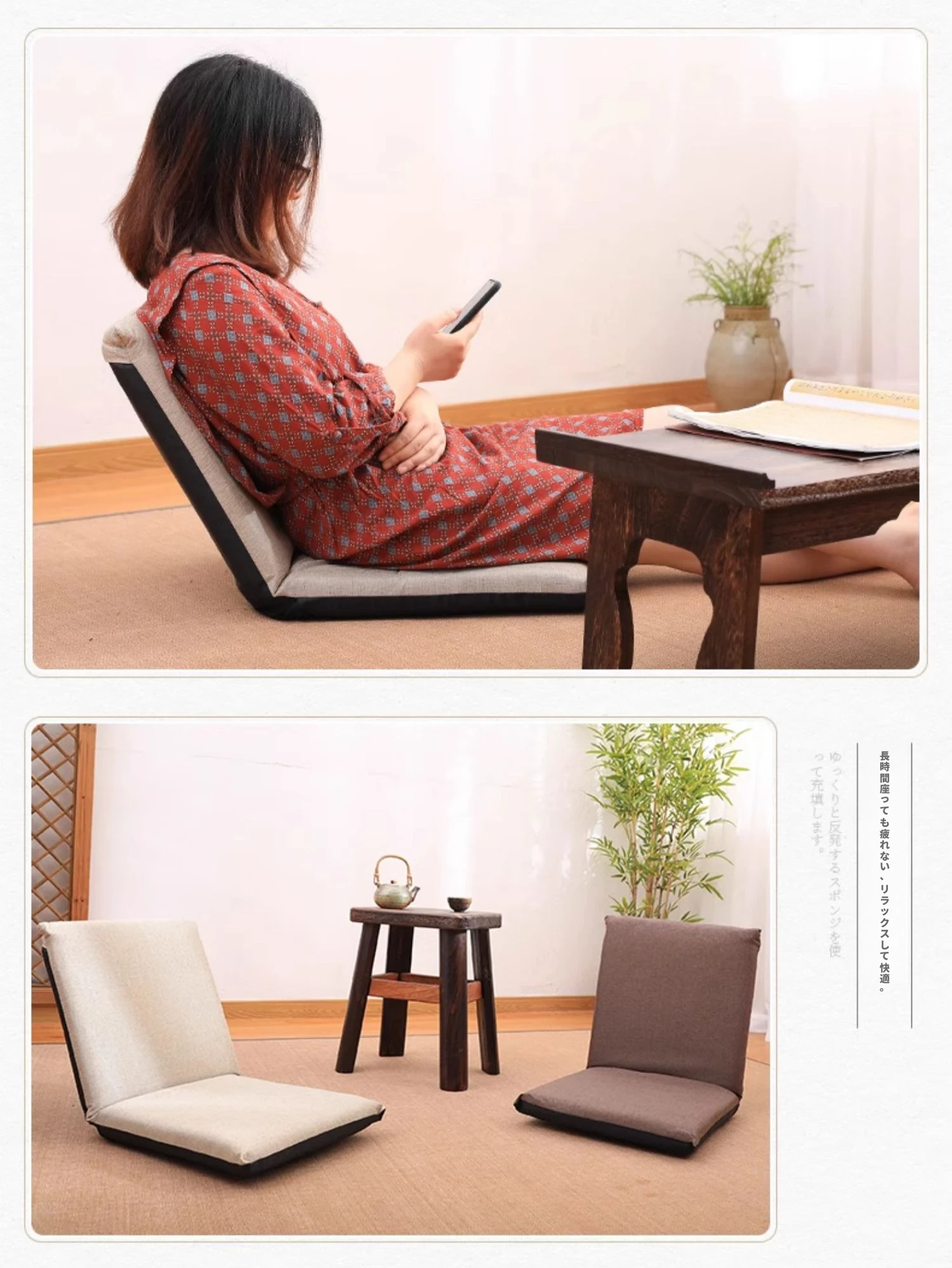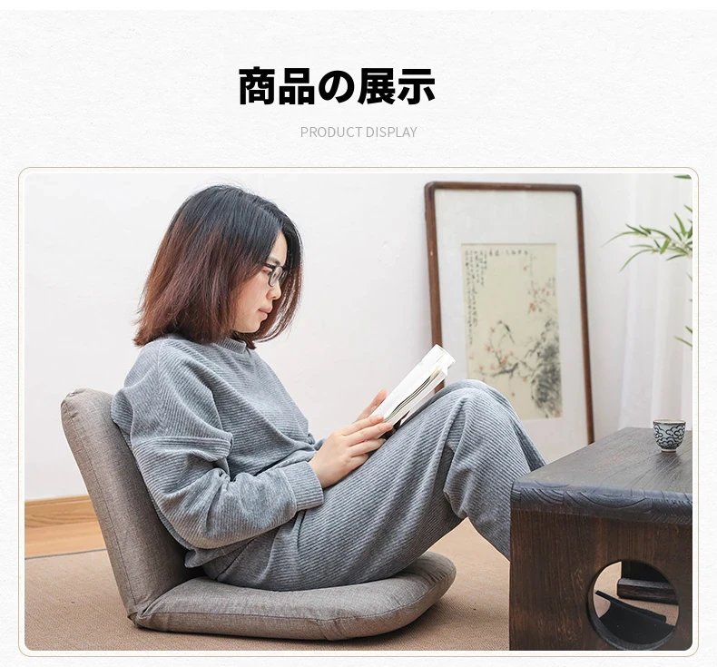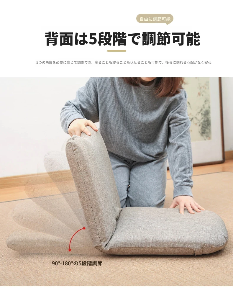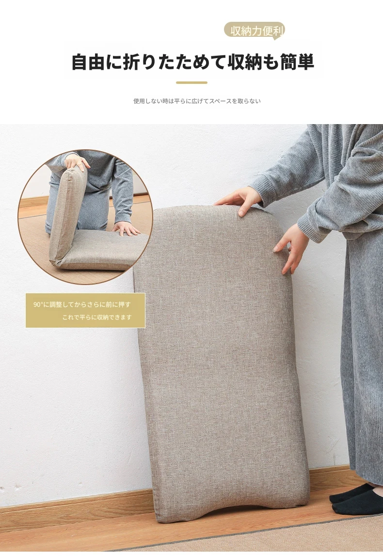 和風リラックスソファ!足のないデザインで、バルコニーや寝室に最適。背もたれ付きの快適な座椅子で、畳や窓際でも使える。あなたのくつろぎスペースをグレードアップ!