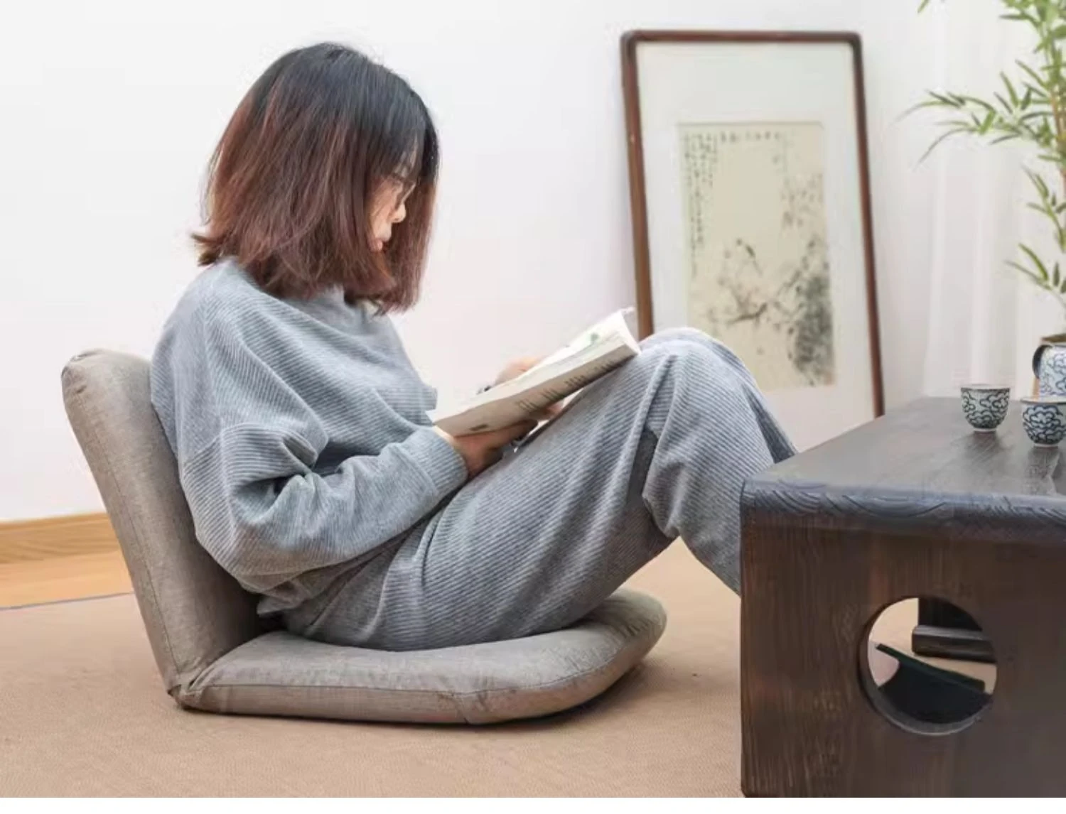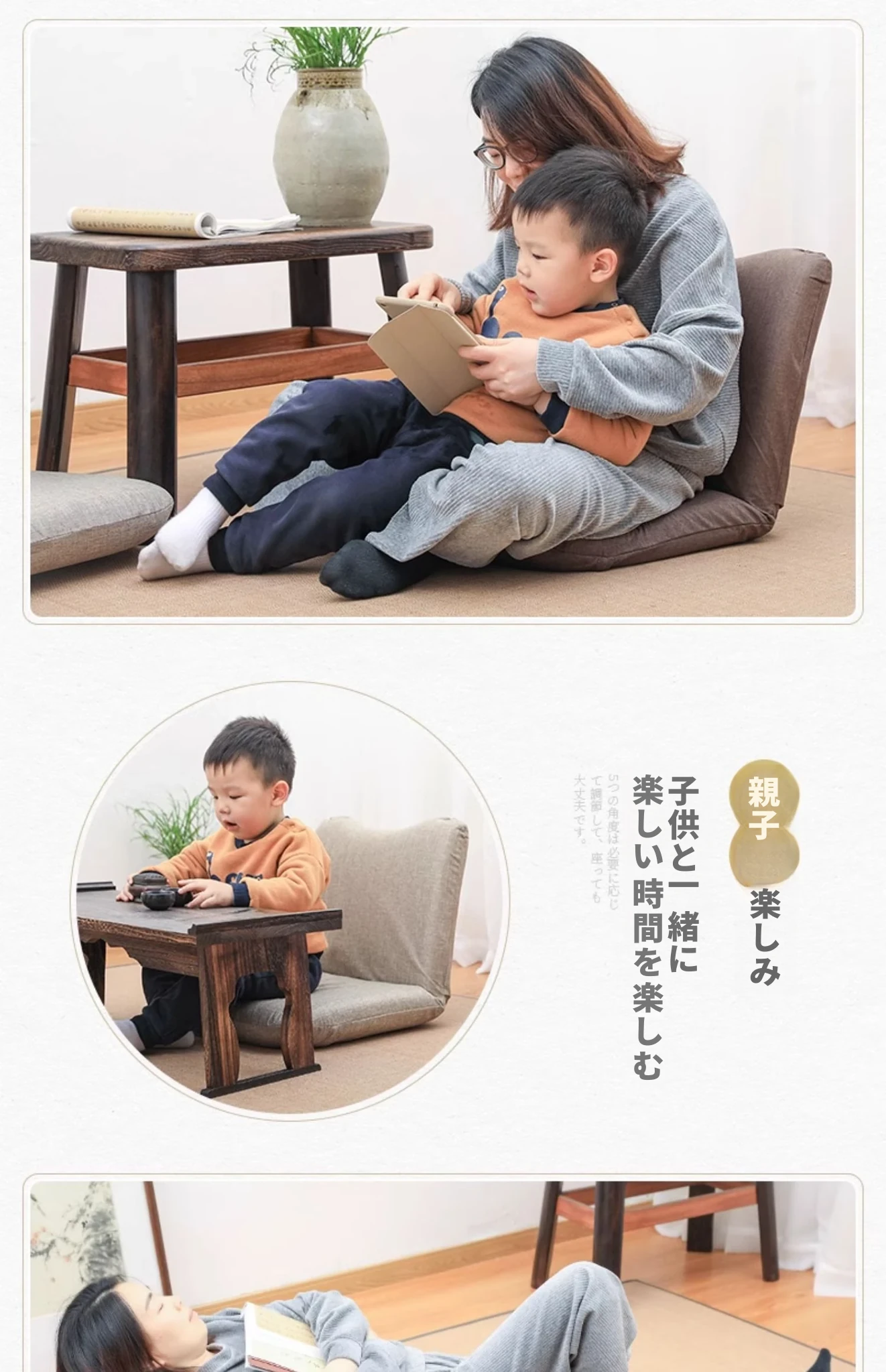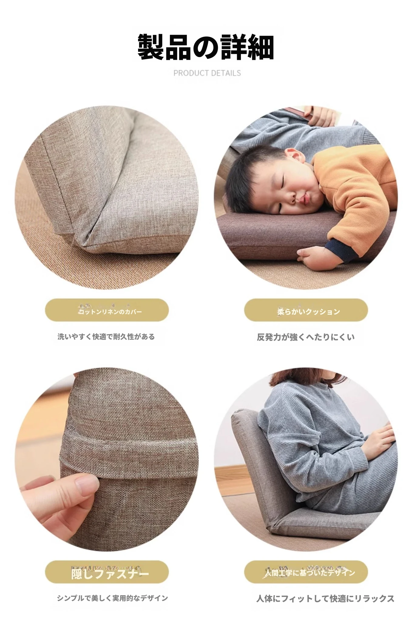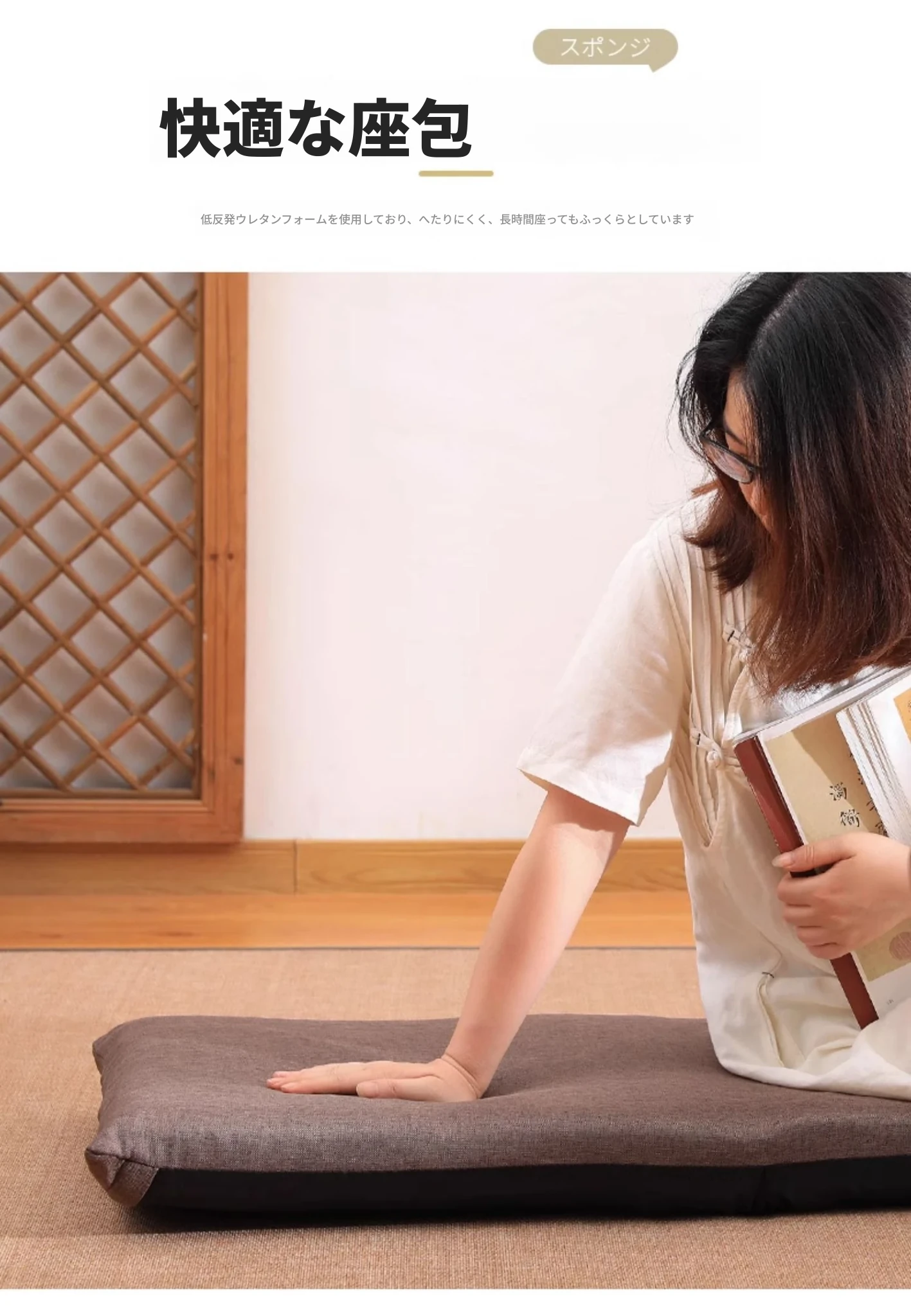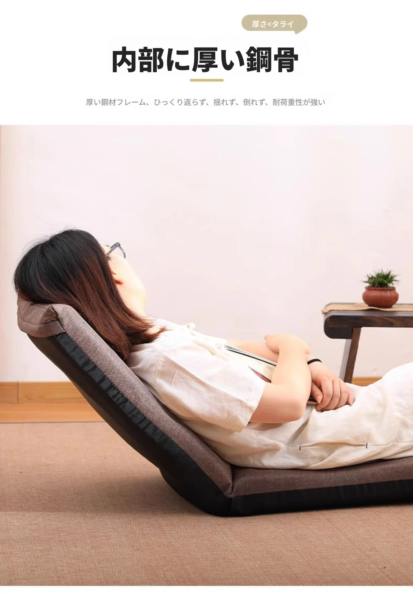 和風リラックスソファ!足のないデザインで、バルコニーや寝室に最適。背もたれ付きの快適な座椅子で、畳や窓際でも使える。あなたのくつろぎスペースをグレードアップ!