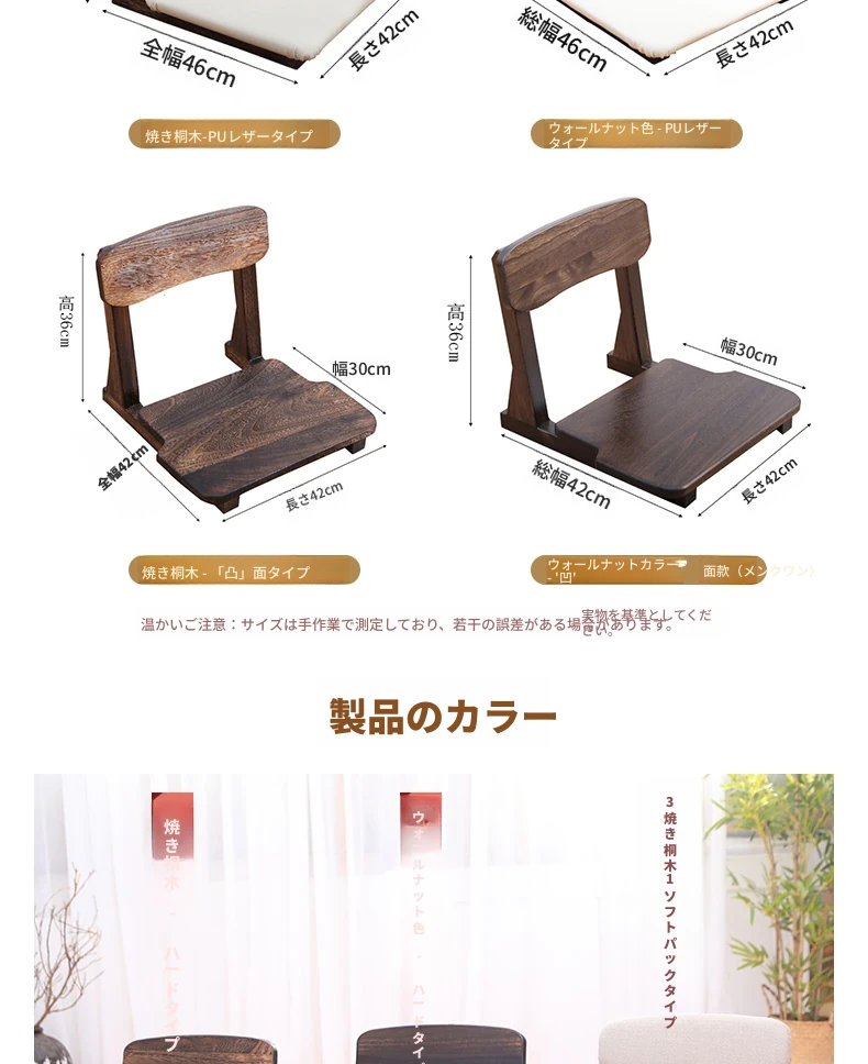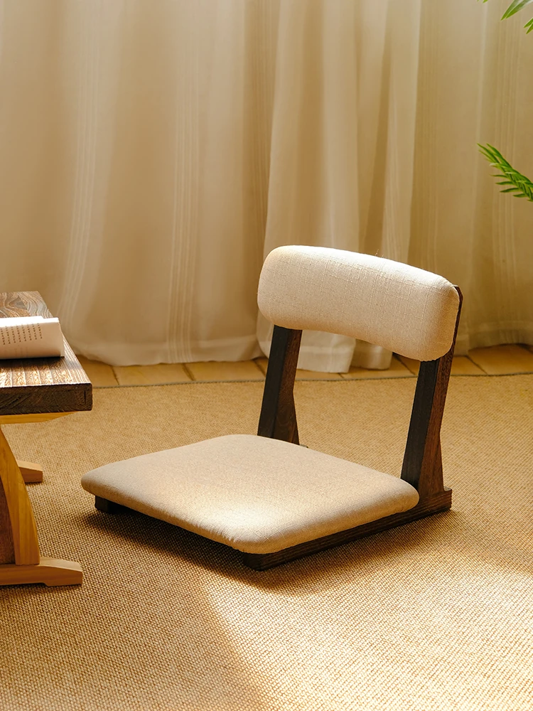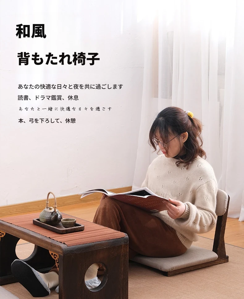 和風タタミチェア - 本格的な無垢材使用、心地よい座り心地の窓辺用ソファ椅子。背もたれ付きでリラックスしたひとときを提供。脚のないデザインで、和室やリビングにぴったりの低座椅子!