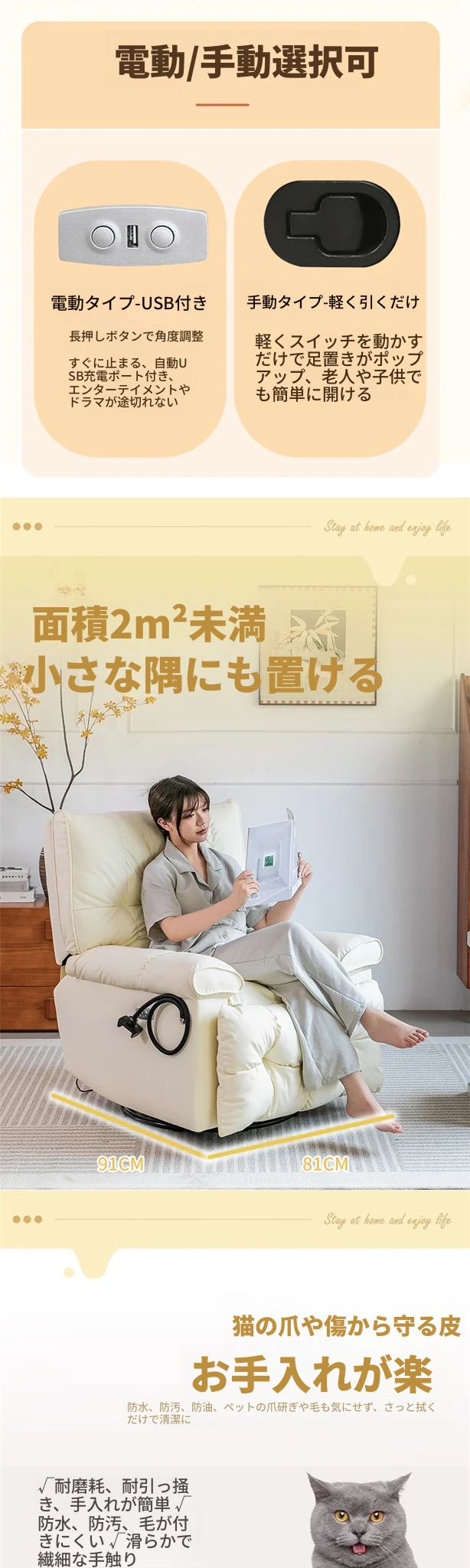 電動タイプ【ワンクリックで座る・寝る + 回転 + スマホスタンド + USB】