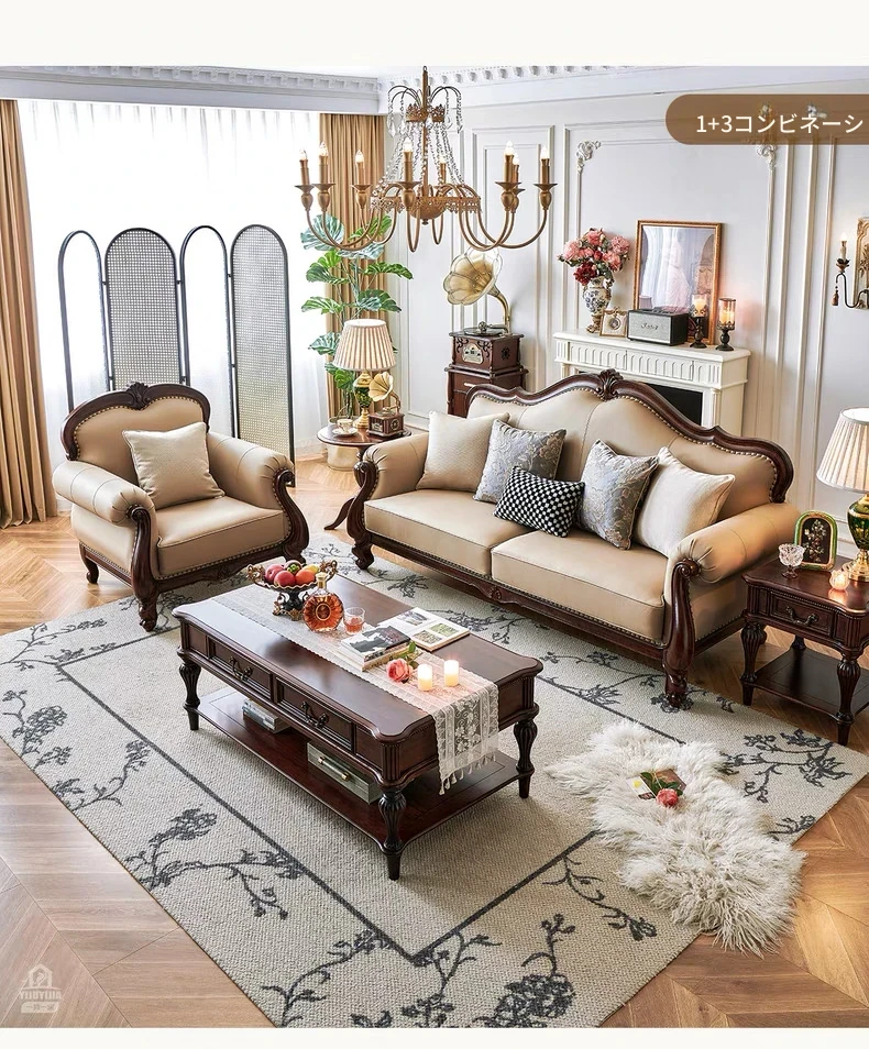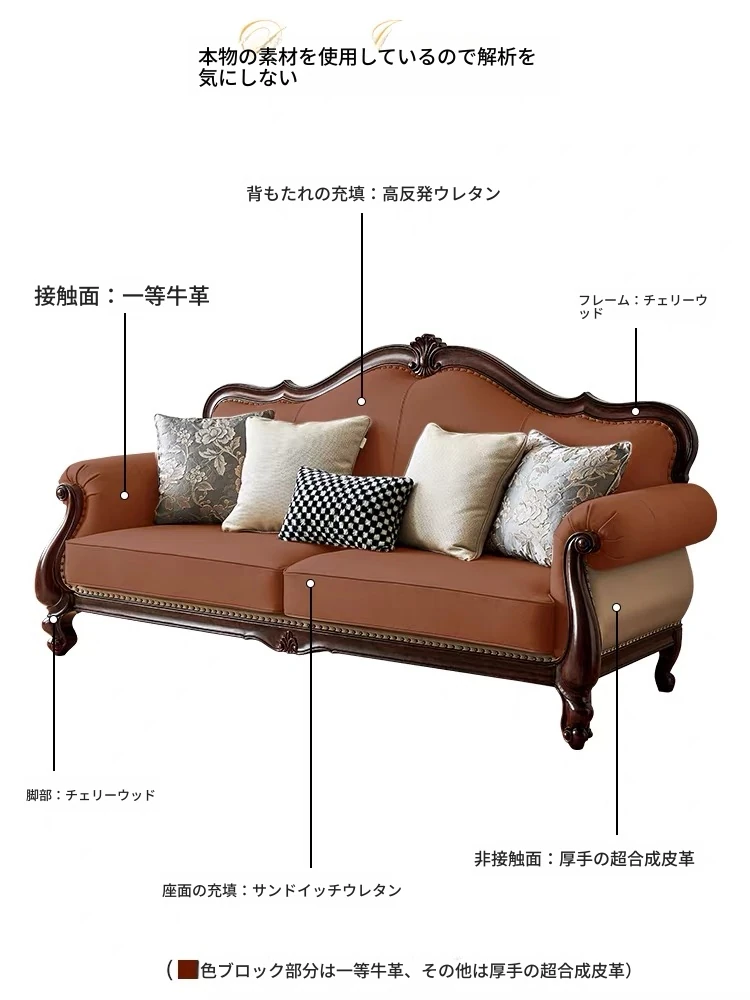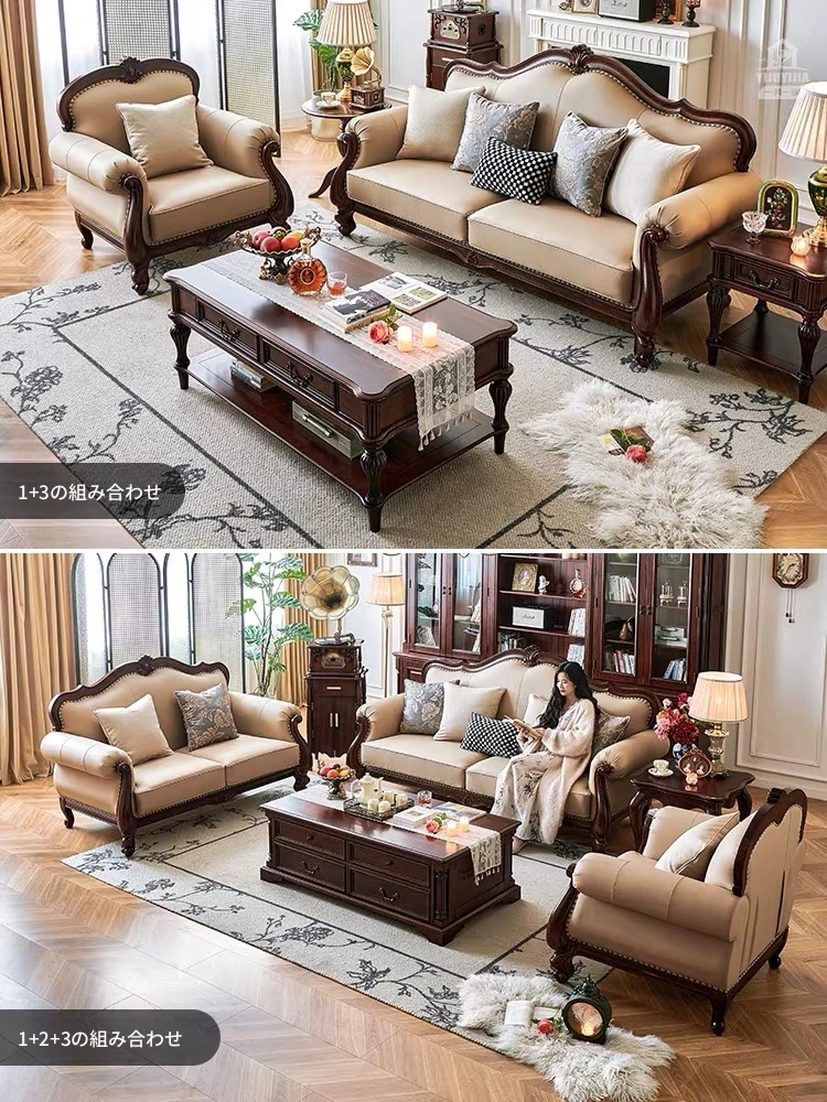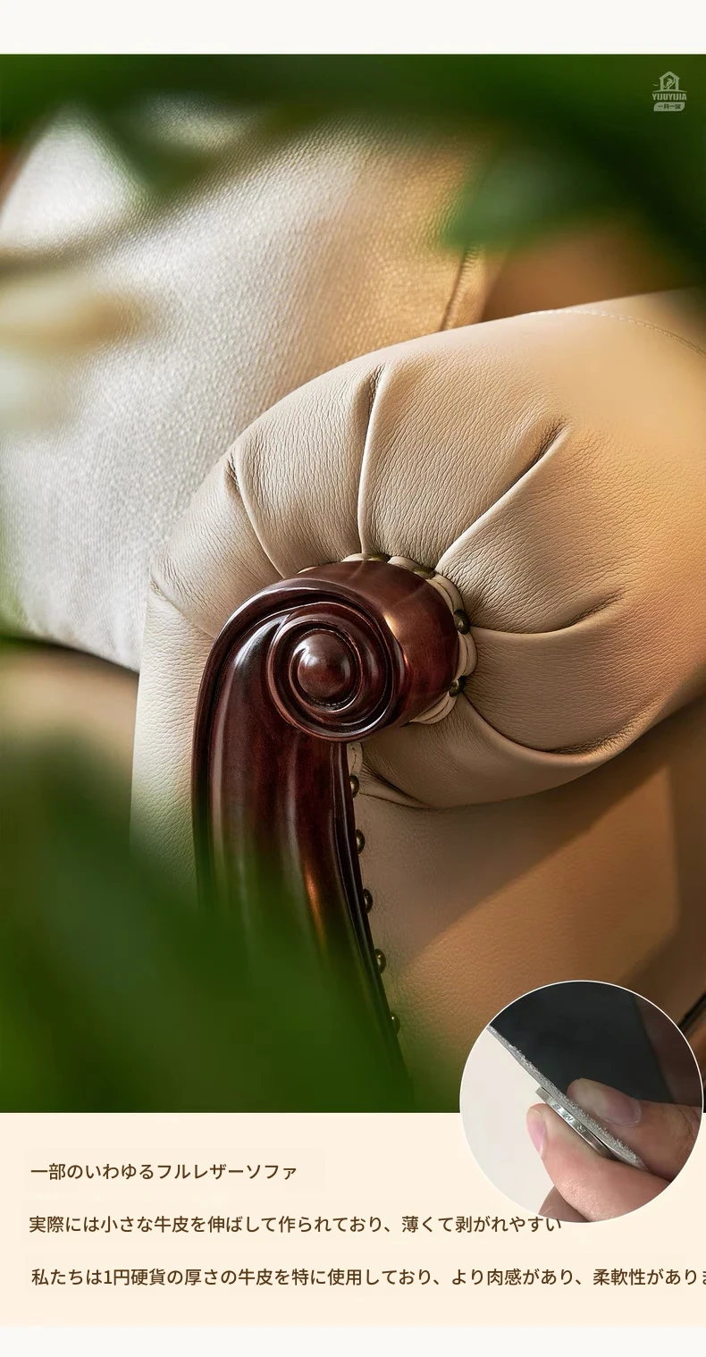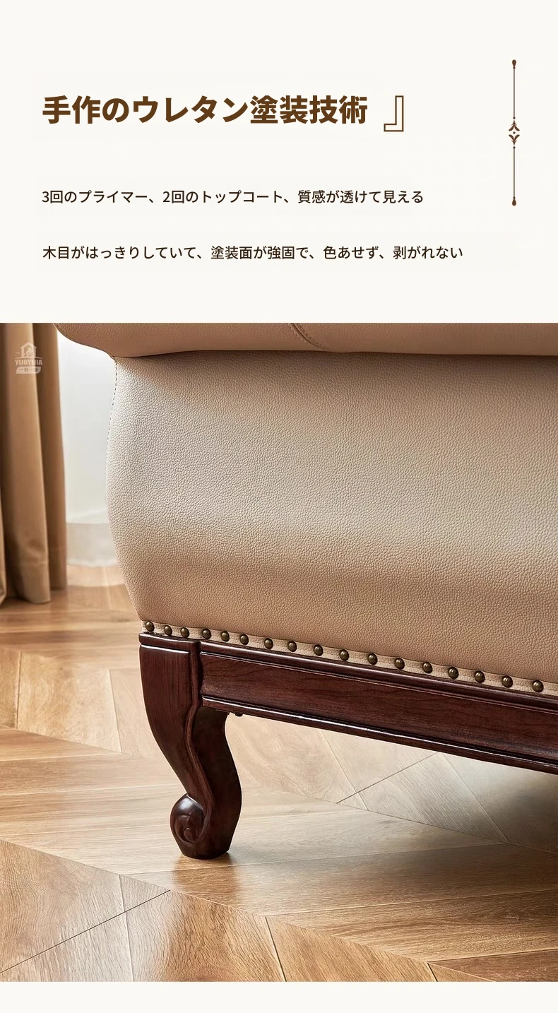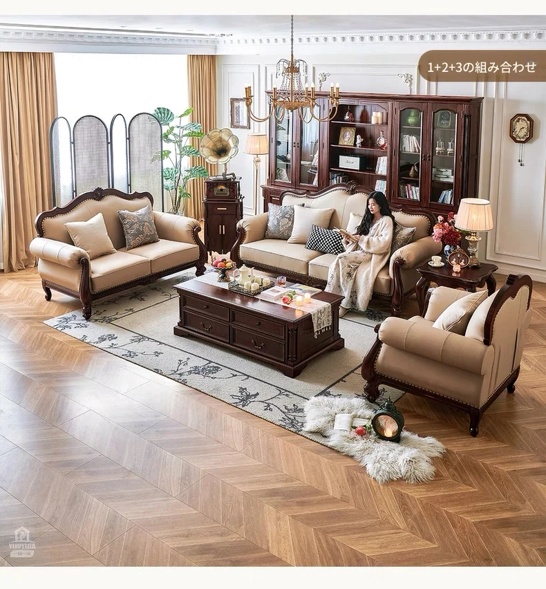 アメリカンスタイル本革ソファ|モダンなリビングに最適!シングル・ダブル・トリプルの組み合わせが可能なチェリーウッド製、ヴィラ向けの広々としたデザイン。クラシックな123コンビネーションで、洗練された空間を演出!