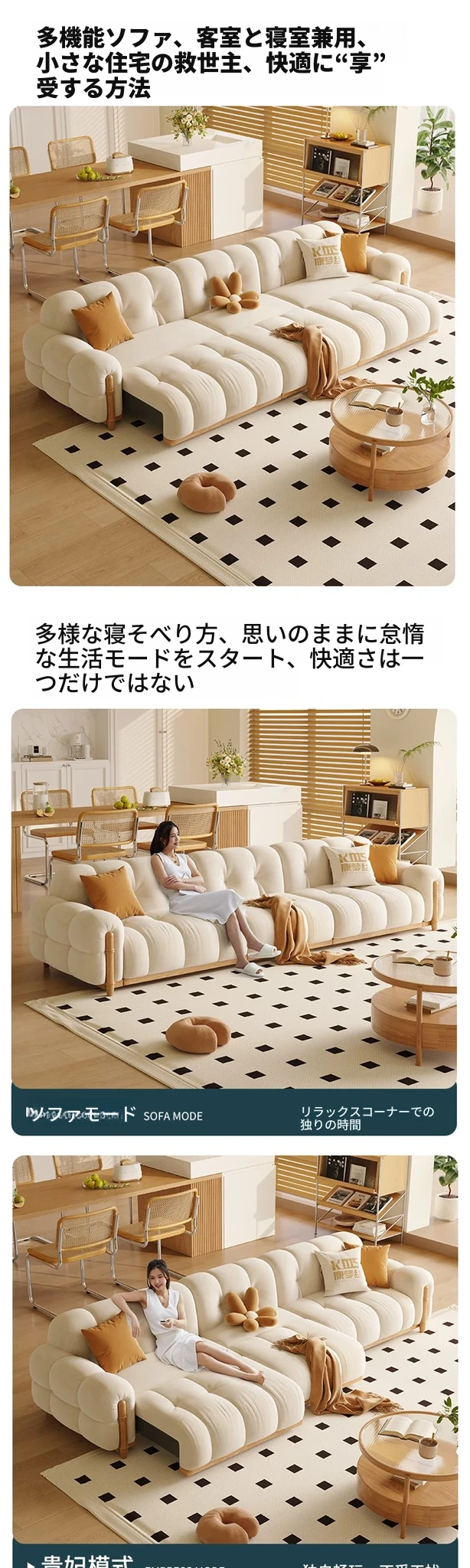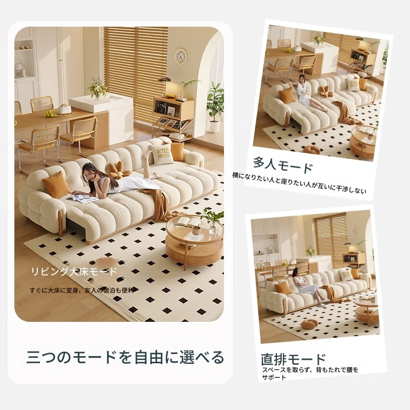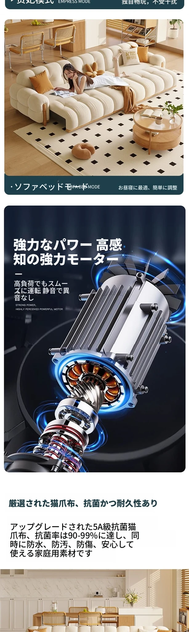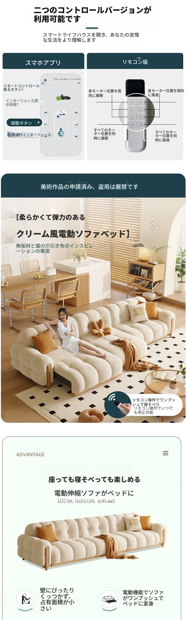新作!原木風のクリーム色で、猫が爪を研げる布製ソファ付きの伸縮式電動三人用ベッド。小さな部屋にもぴったりなスタイリッシュデザインで、快適さを追求した機能的な一品。