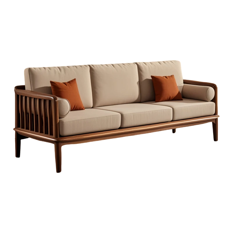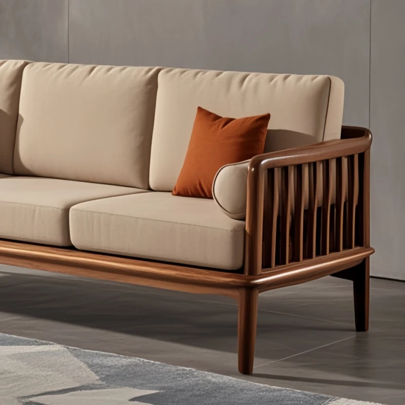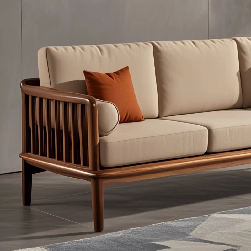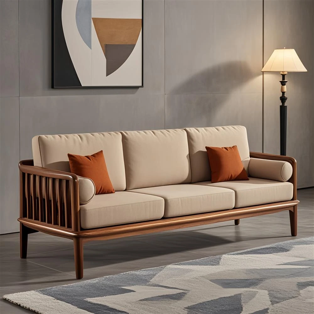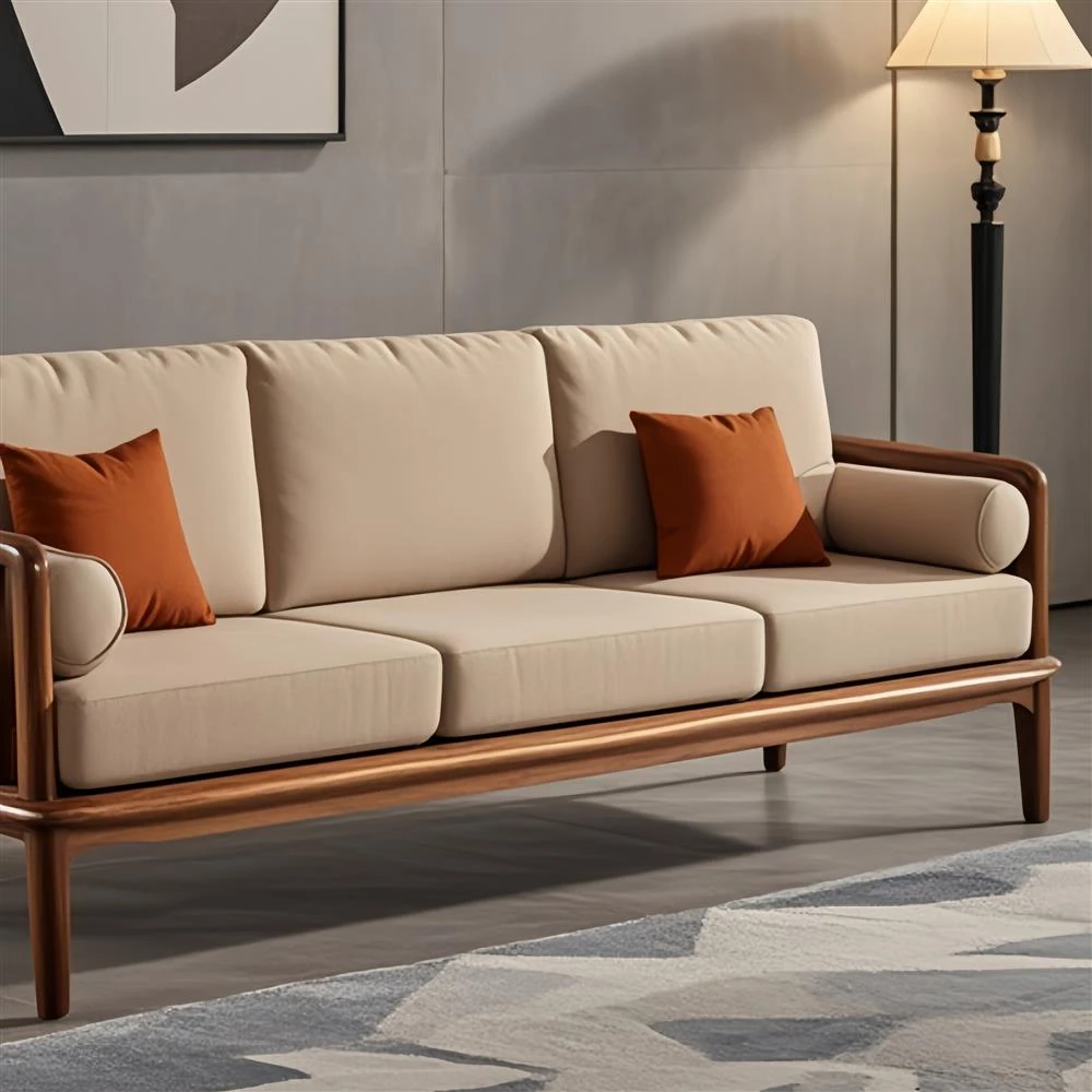 新中式スタイルの無垢材ソファ|リビングにぴったりな直線的な三人掛け|軽やかなラグジュアリー感|爽やかな布地と高級レザー|現代的でシンプルなウォールナット仕上げ