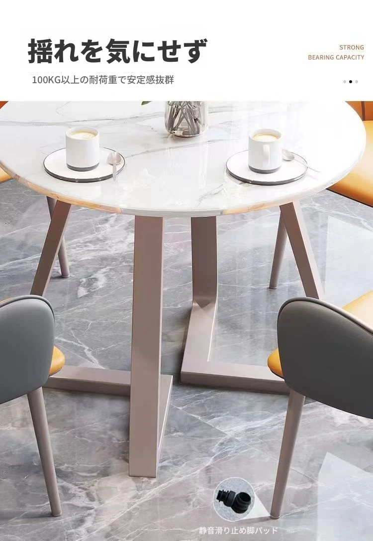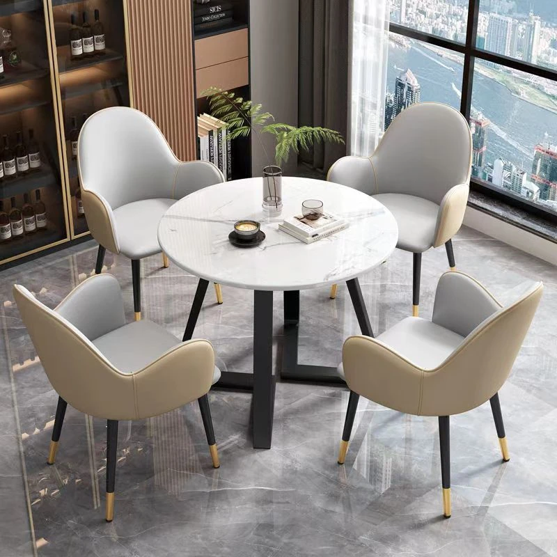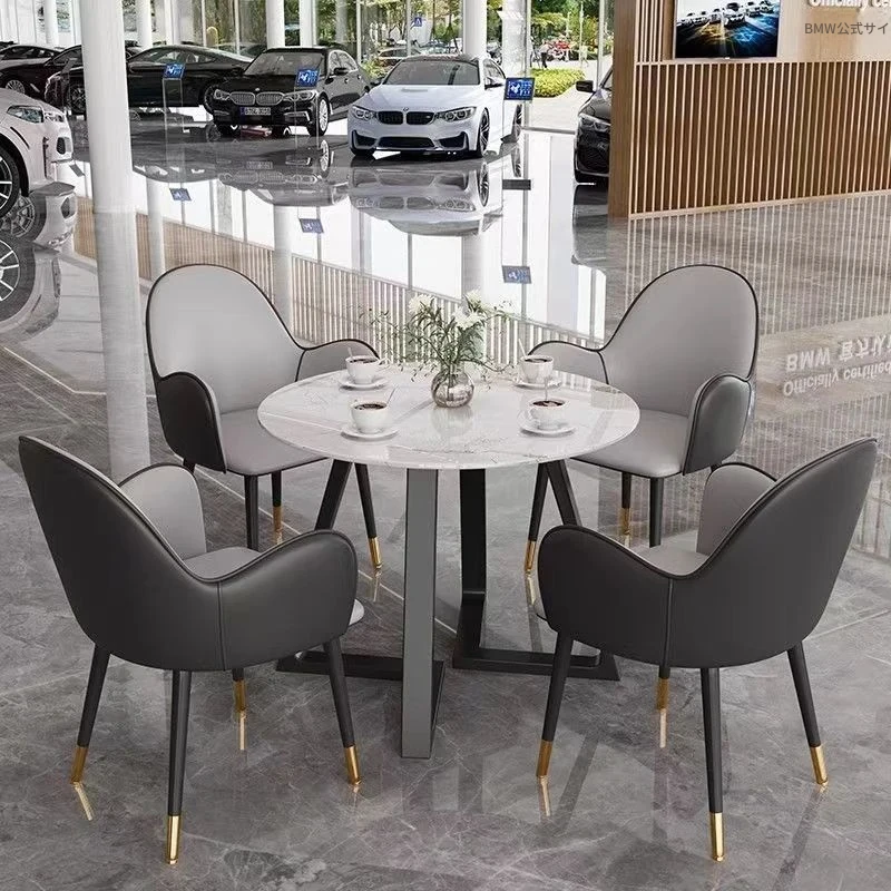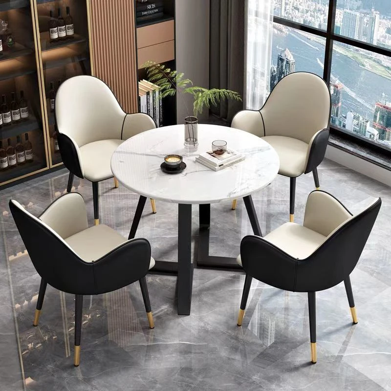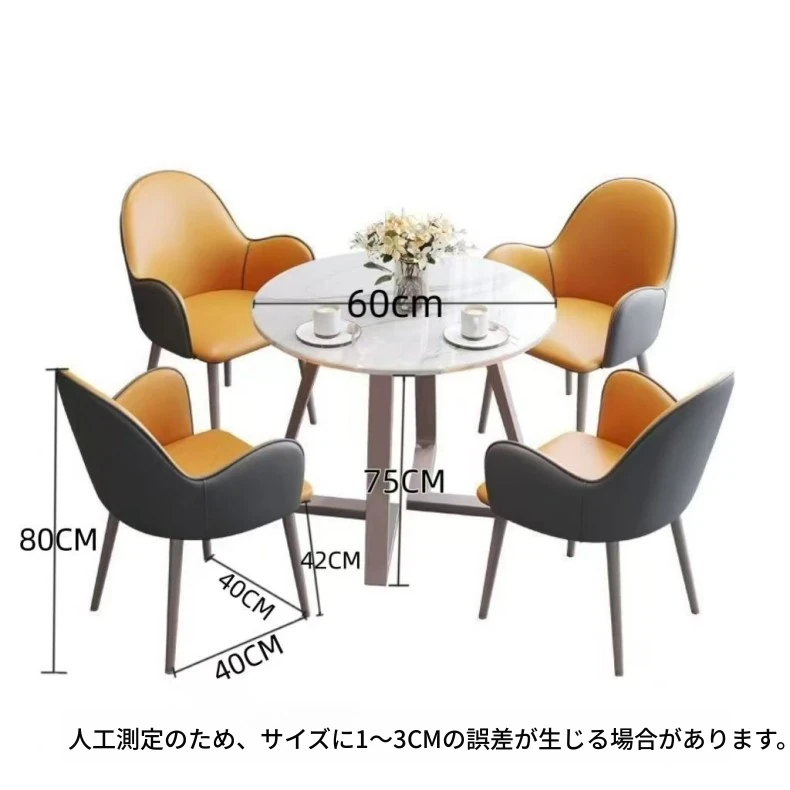 スタイリッシュなラウンドテーブルと猫爪レザー椅子のセット - シンプルでモダンなデザイン、バルコニーやリビングにぴったりのリラックス空間を演出。軽やかな高級感でおもてなしにも最適!
