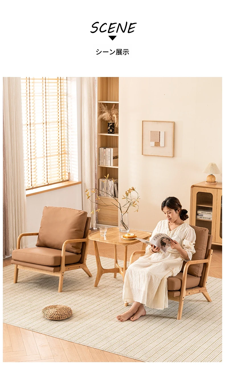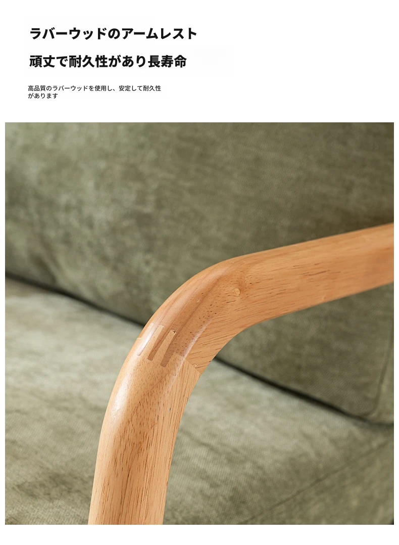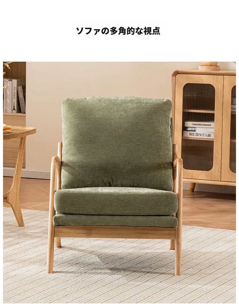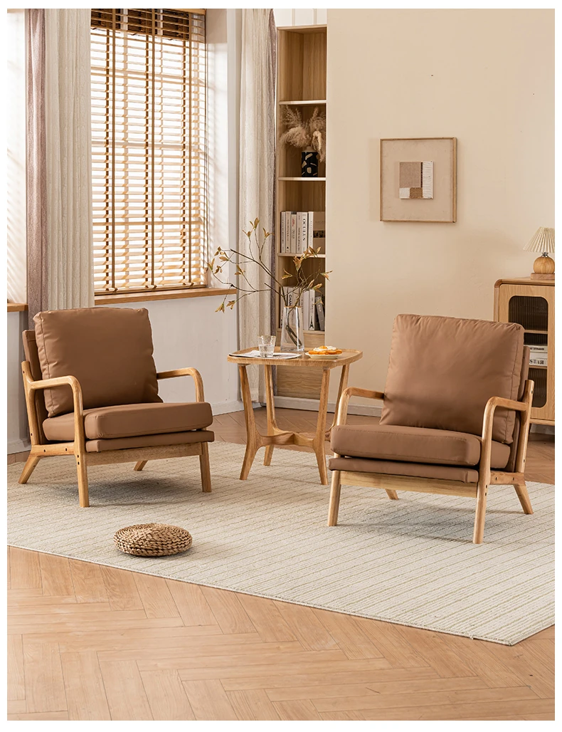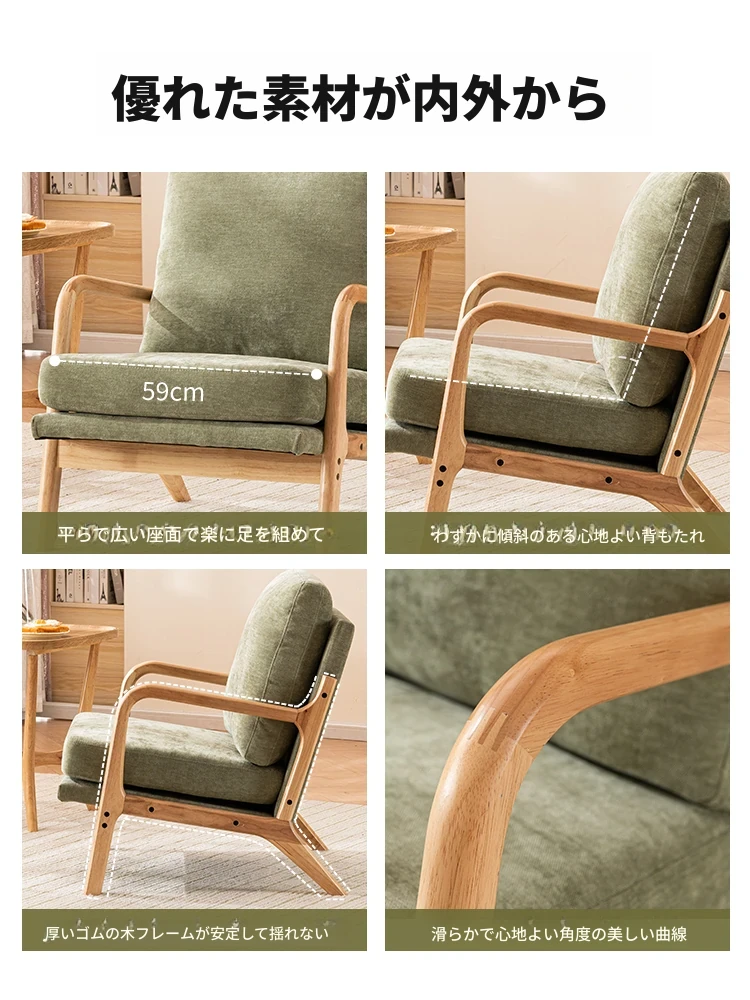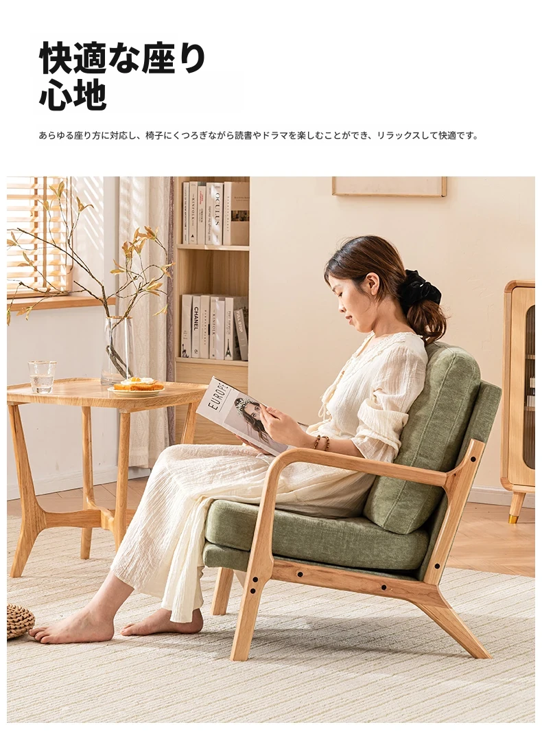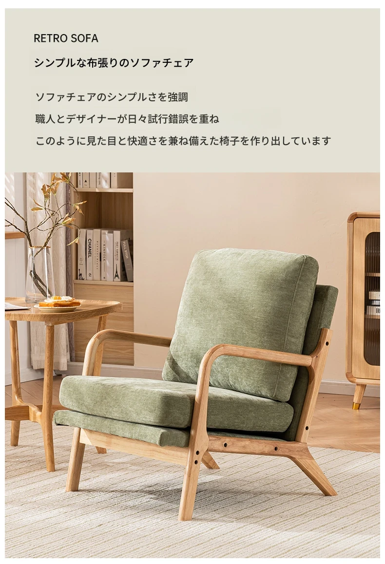 天然木製のファブリック一人掛けソファチェア|家庭用リビングに最適|ティーテーブルとのコンビネーション|民宿や接客にぴったりな洽談・リラックスソファチェア