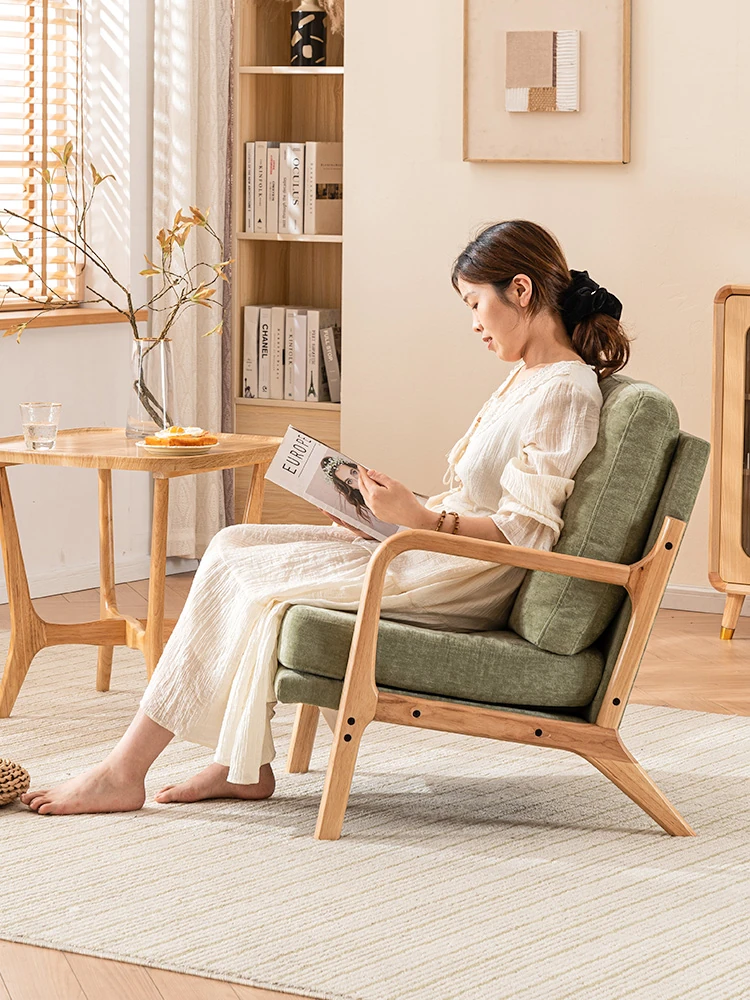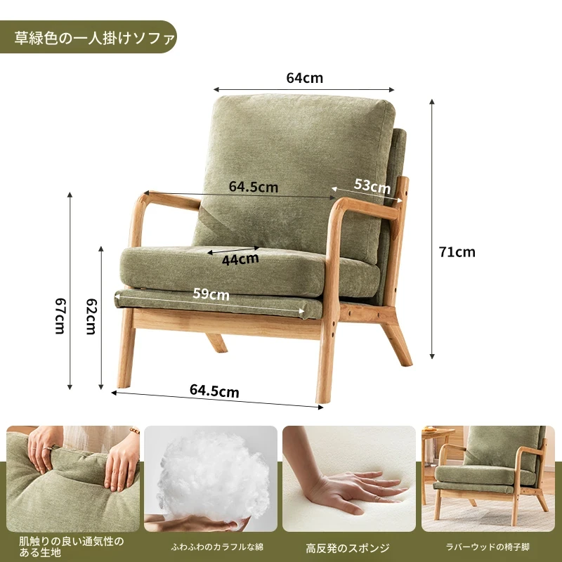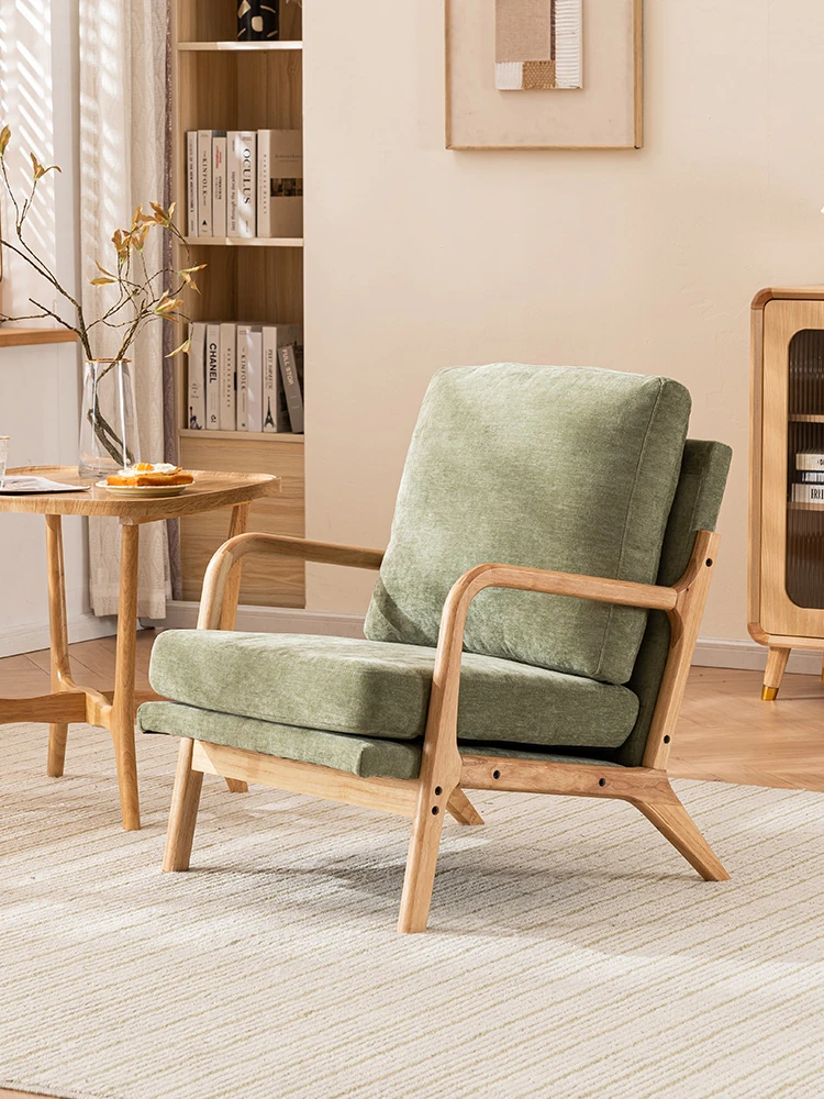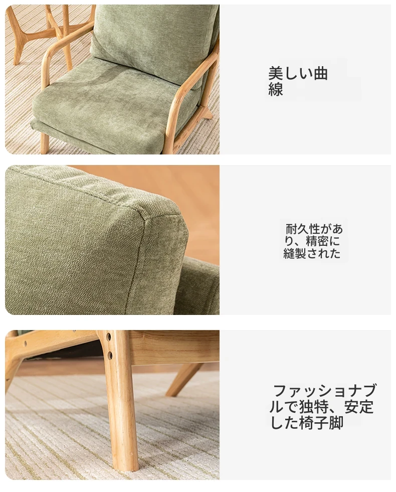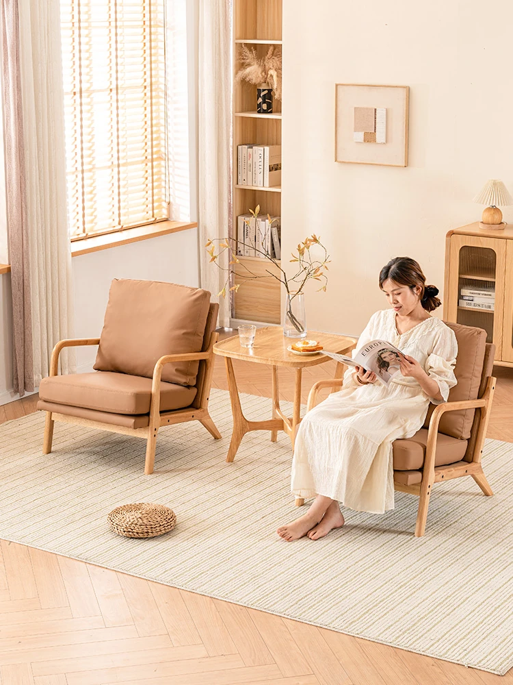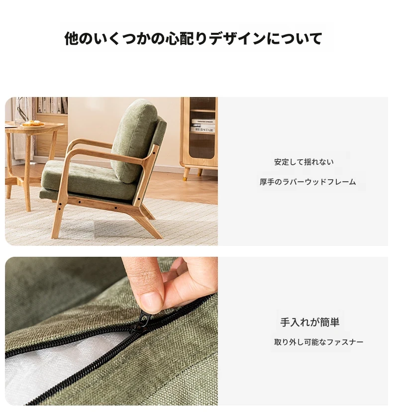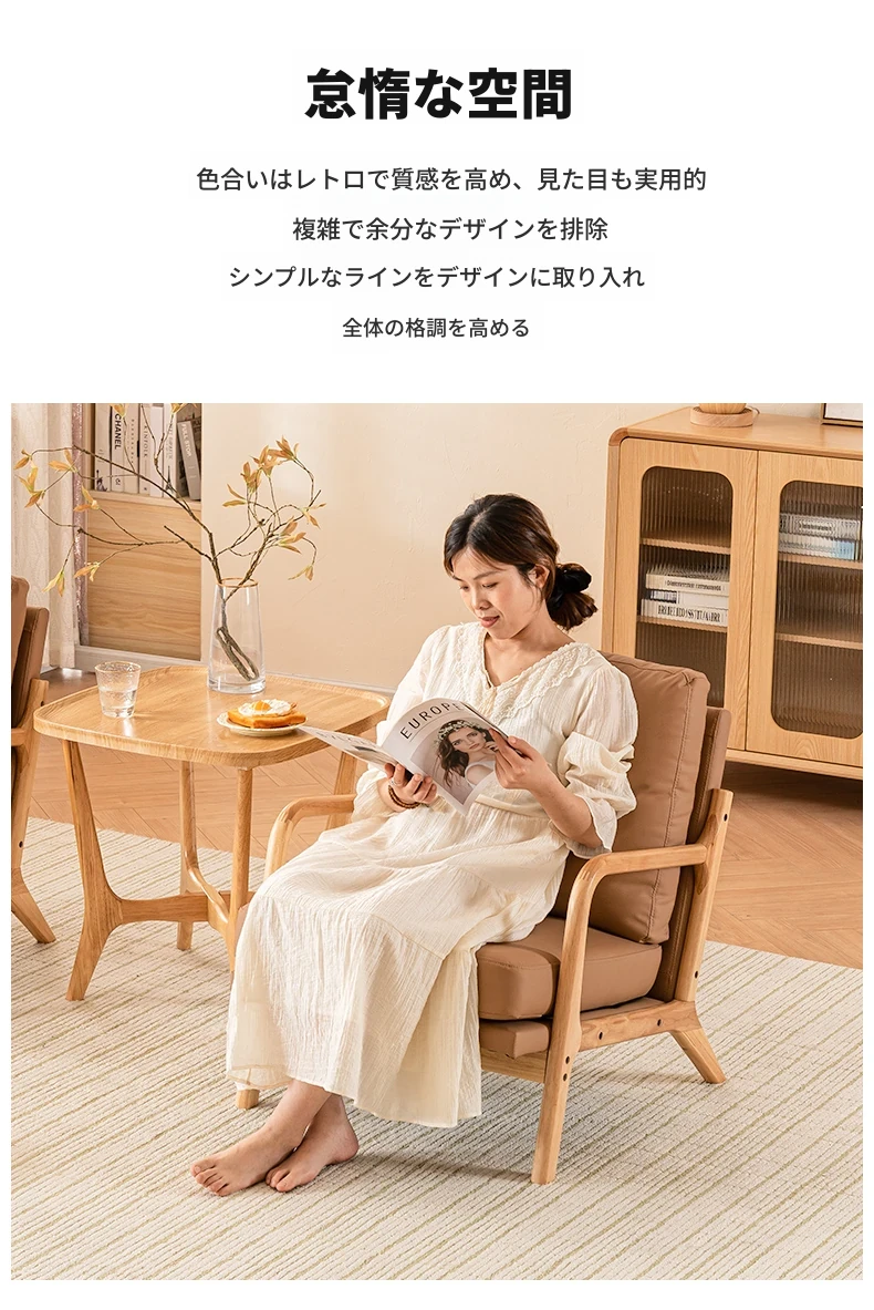 天然木製のファブリック一人掛けソファチェア|家庭用リビングに最適|ティーテーブルとのコンビネーション|民宿や接客にぴったりな洽談・リラックスソファチェア