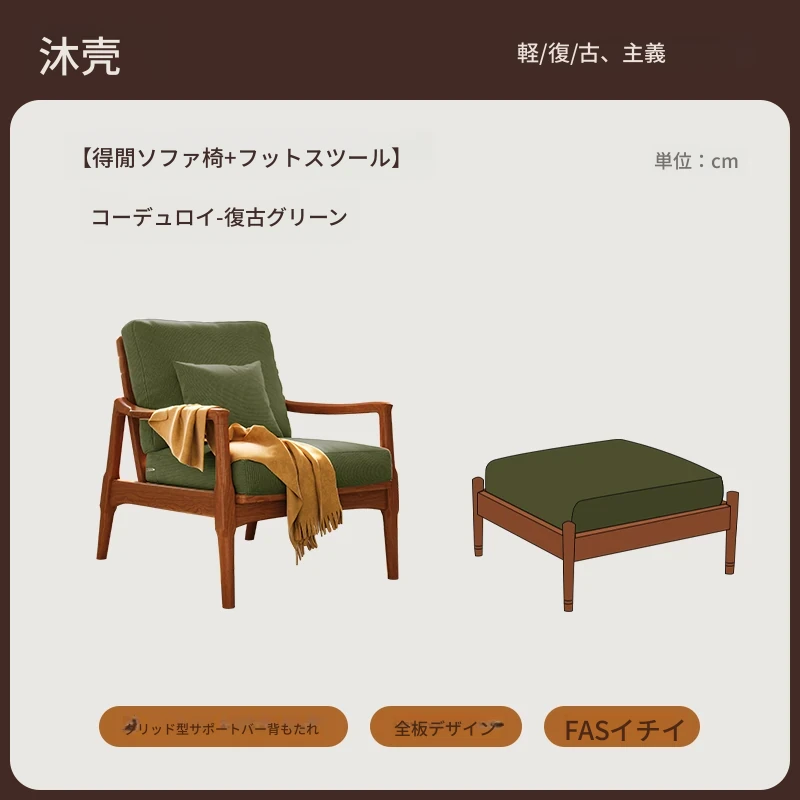 【全無垢】カジュアルチェア丨コーデュロイヴィンテージグリーン+フットレスト丨チェリウッドカラー