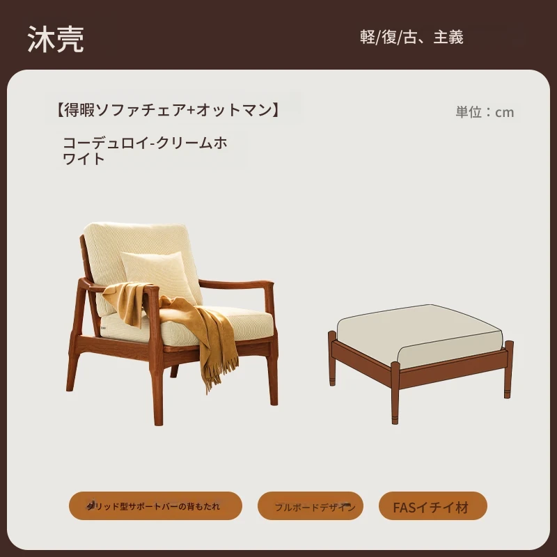 【全無垢】カジュアルチェア丨コーデュロイクリームホワイト+フットレスト丨チェリウッドカラー