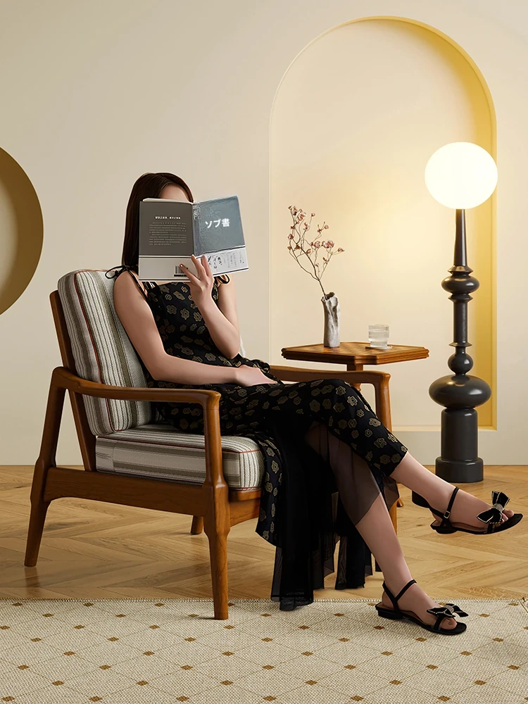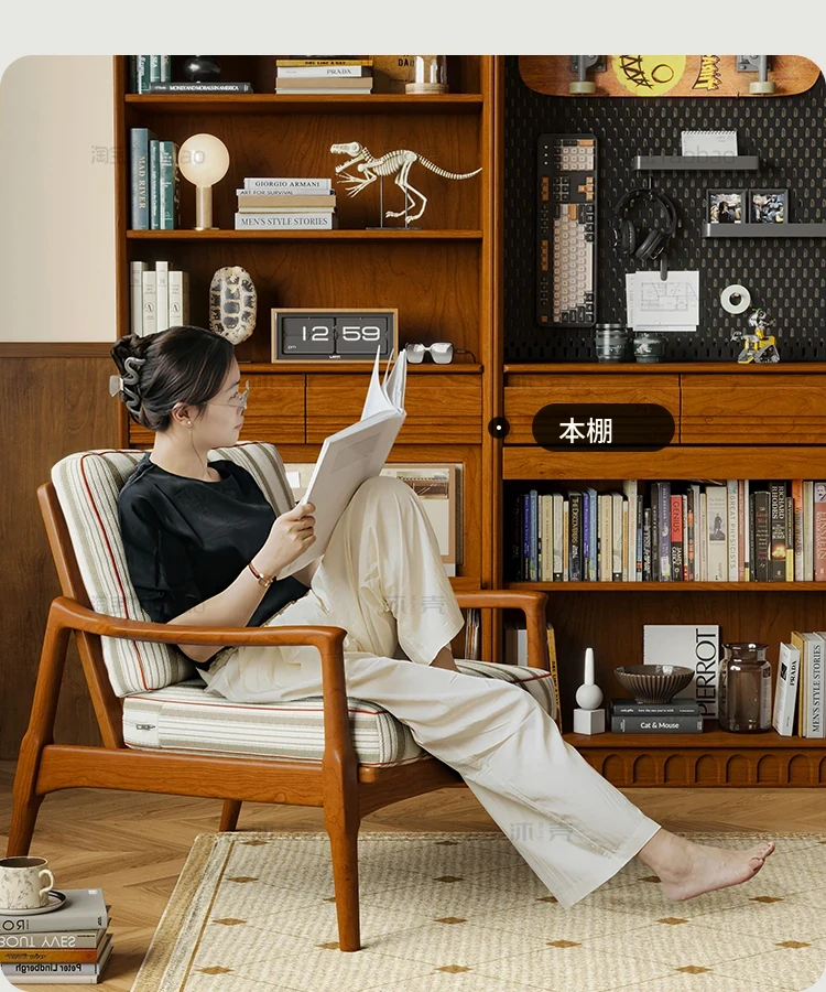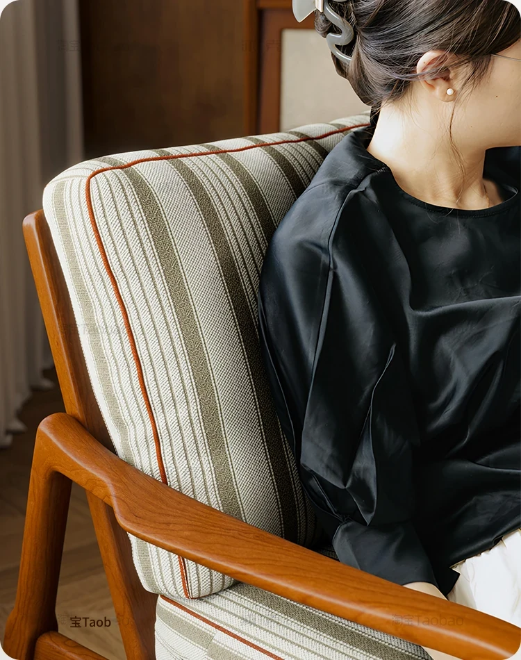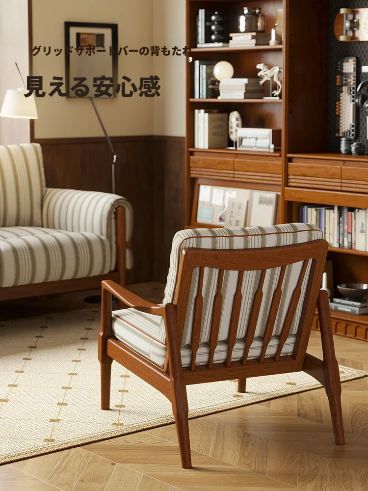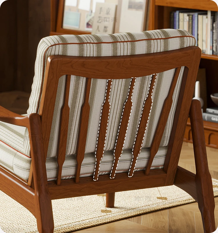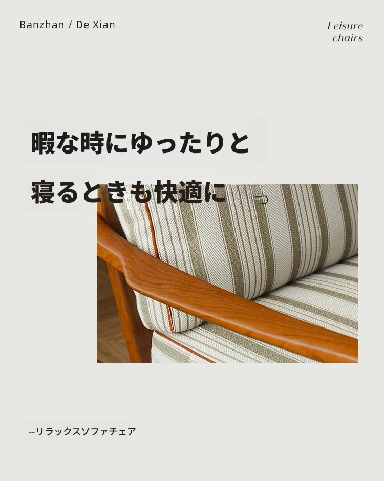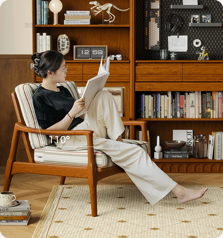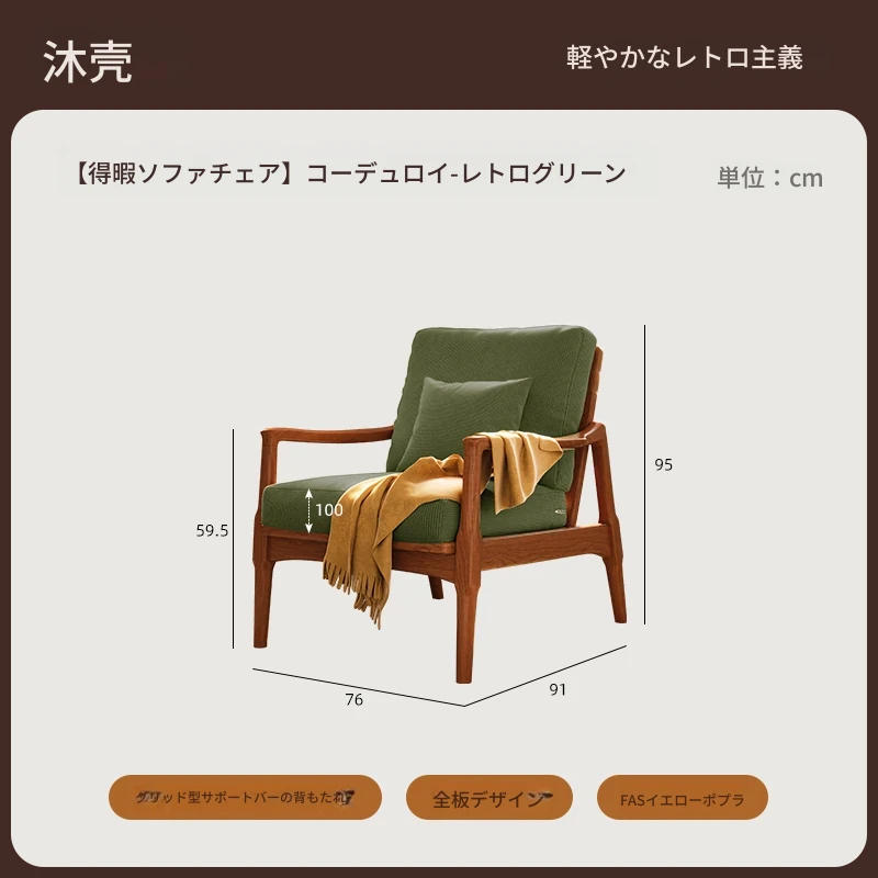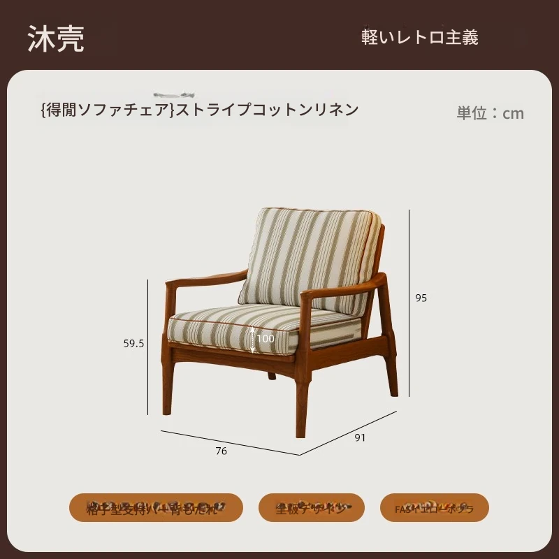 ヴィンテージ風 全木製 シングルソファチェア - リビングやバルコニーに最適なデザイナーリクライニングチェア。おしゃれで快適な布製、リラックスした時間をお楽しみください!