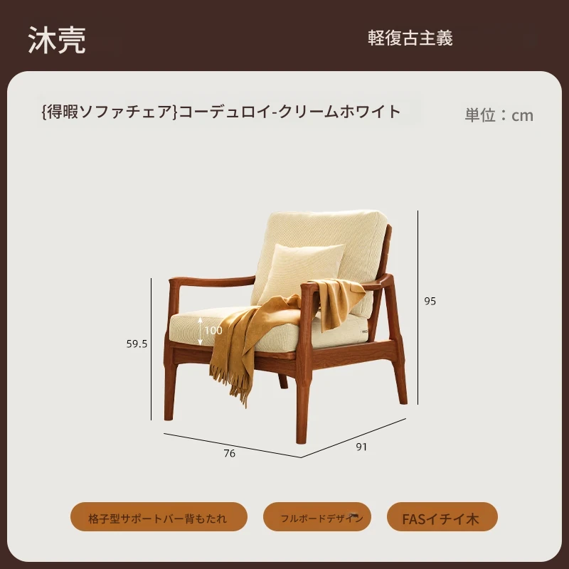 【全無垢】カジュアルチェア丨コーデュロイクリームホワイト丨チェリウッドカラー