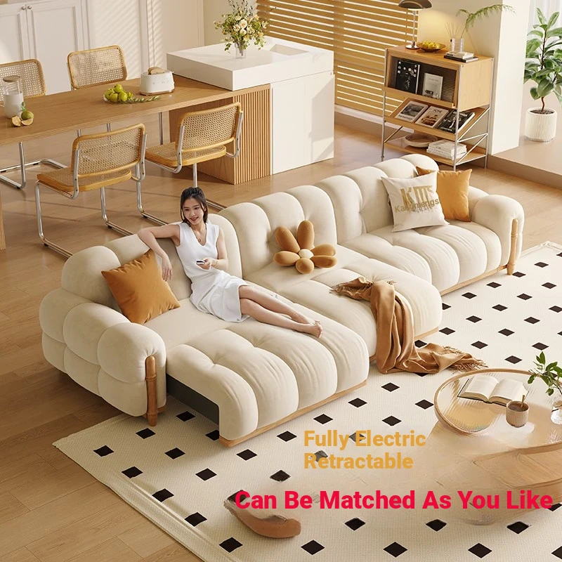 "Modern Electric Three-Seat Sofa with Retractable Design & Cat Scratch Fabric - Perfect for Small Spaces, Featuring a Stylish Natural Wood Cream Finish"